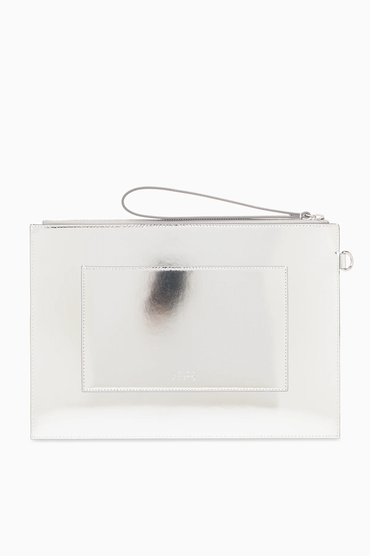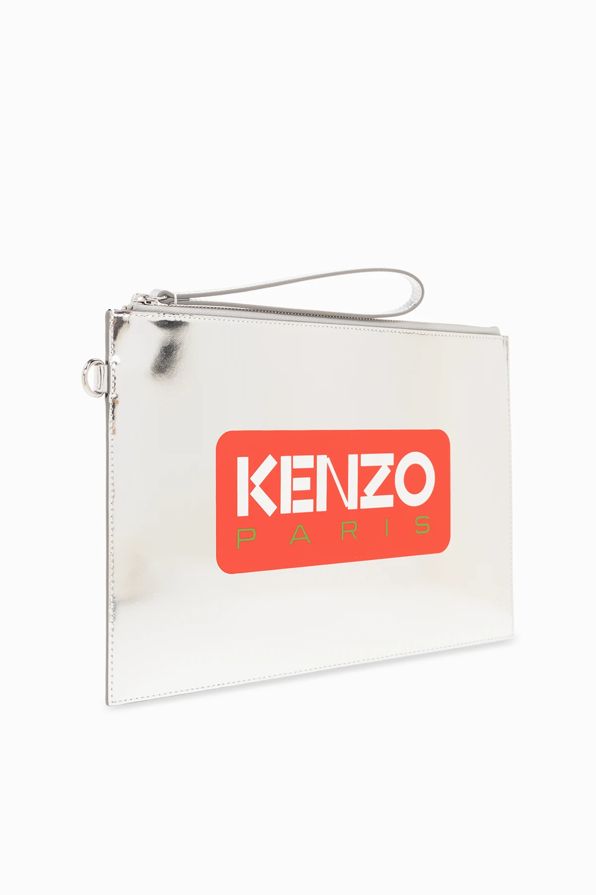 Silver-tone clutch from Kenzo. Made of leather, this item features a zip fastening, logo, wrist strap, back pocket, silver-tone metal hardware and one internal compartment with one card slot.