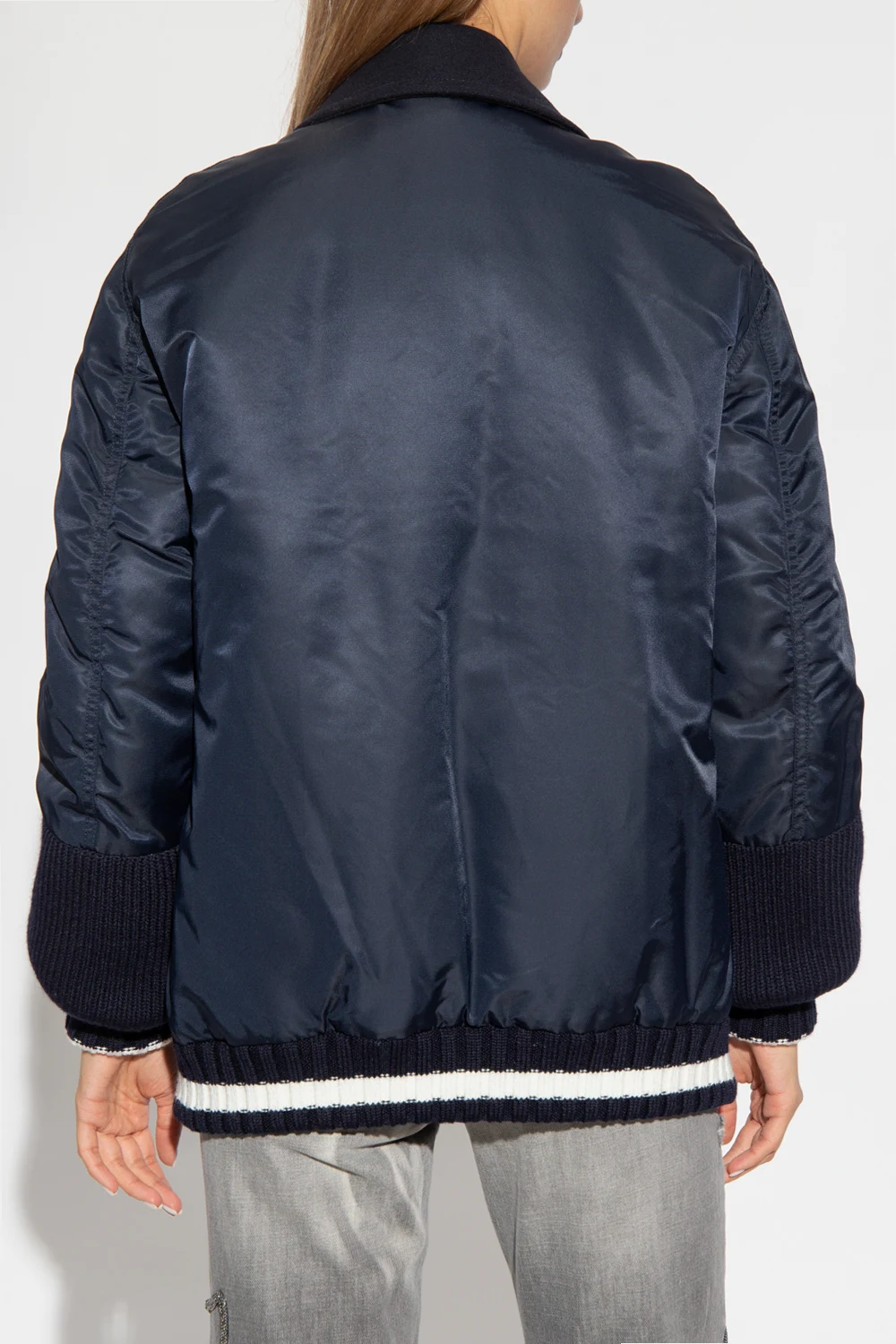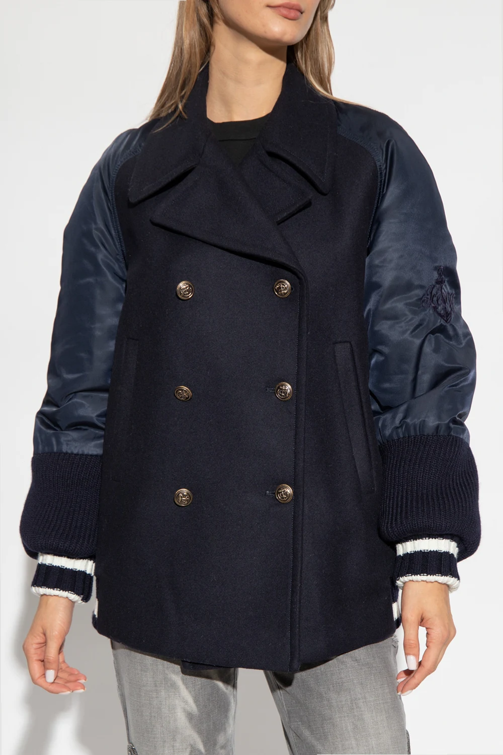 Navy and white double-breasted jacket with coat motif from Iceberg. Crafted from contrasting fabric, this garment features button fastenings, two front pockets, logo embroidery on the sleeves and ribbed edges.