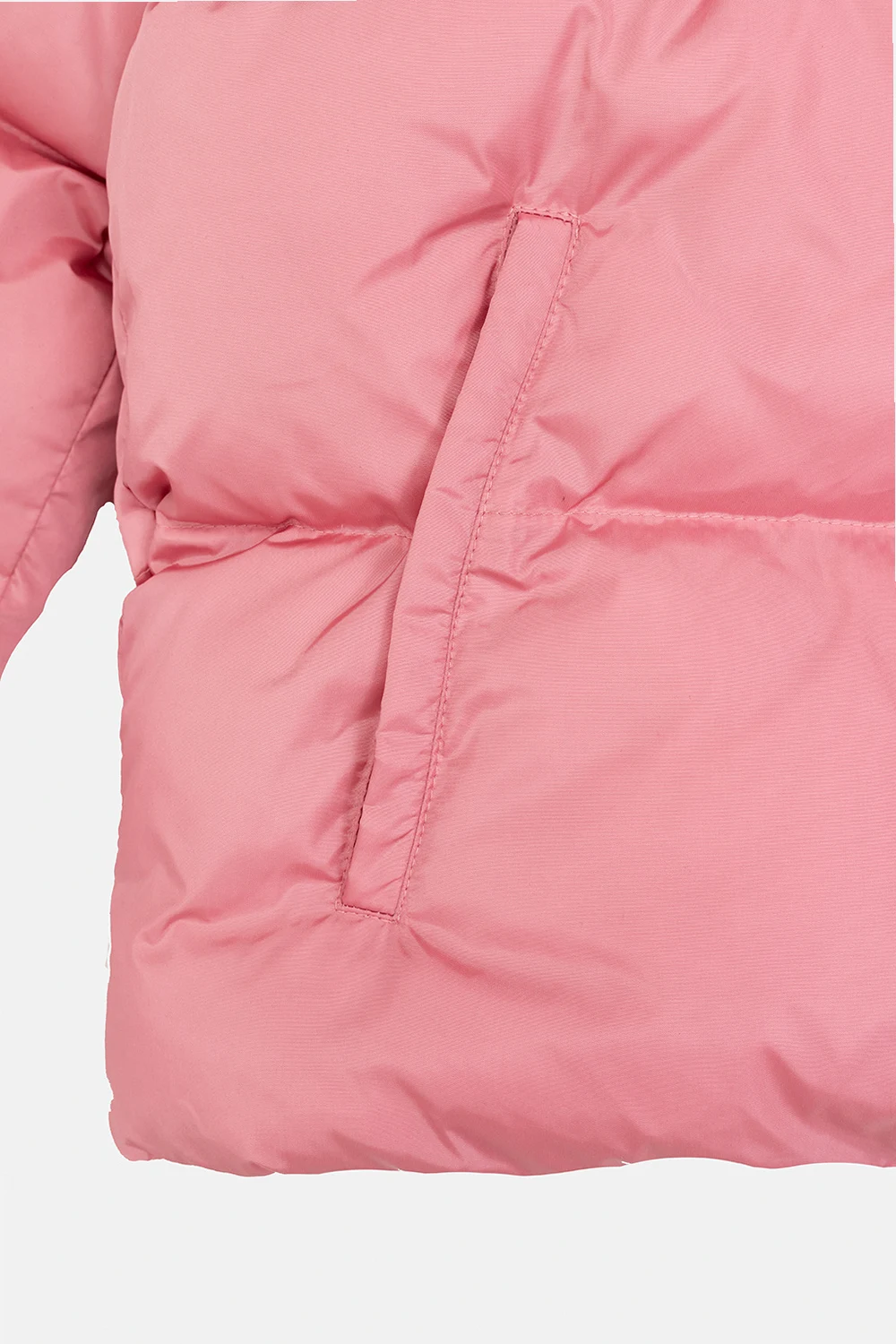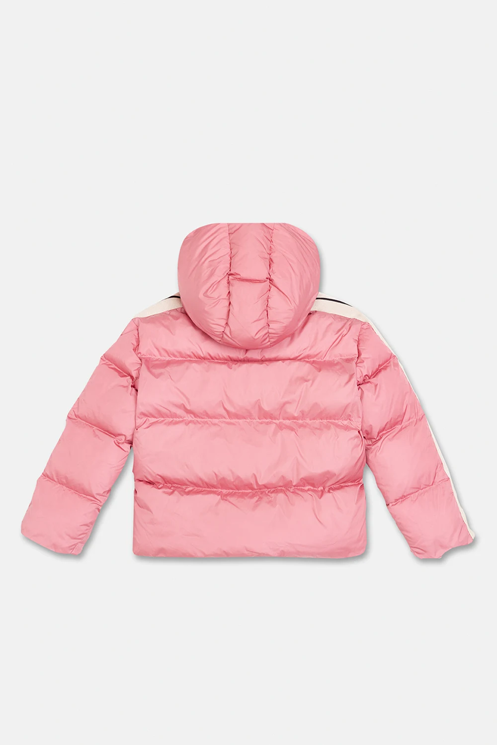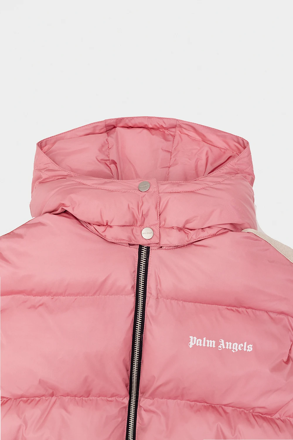 Pink insulated quilted jacket from Palm Angels Kids. Accentuated with beige and black stripes on the long sleeves, this style features a zip fastening, elasticated trims on the bottom hem and cuffs and two frontal slip pockets accompanied by a white logo print.