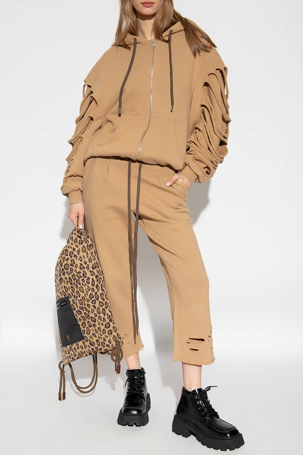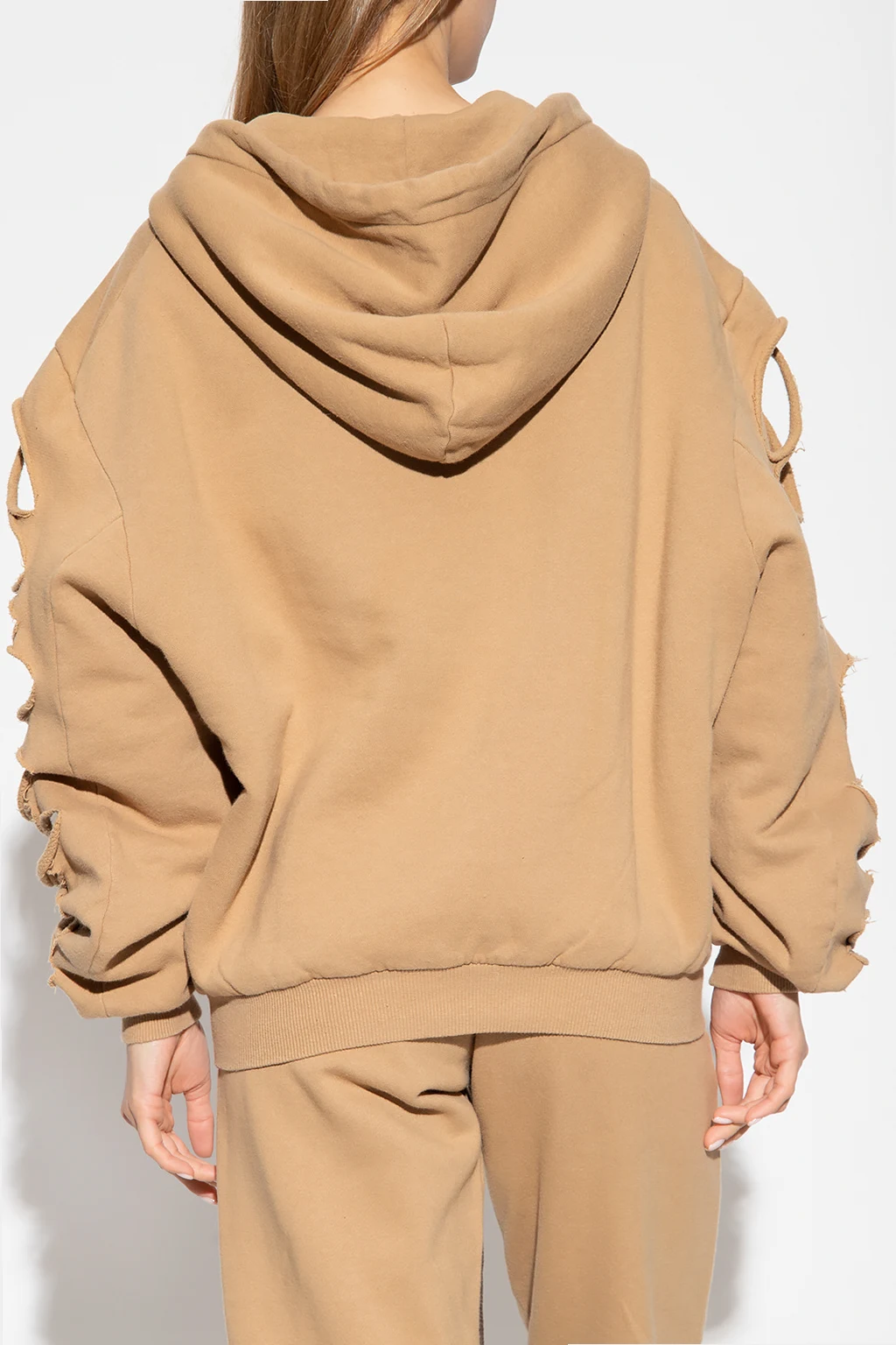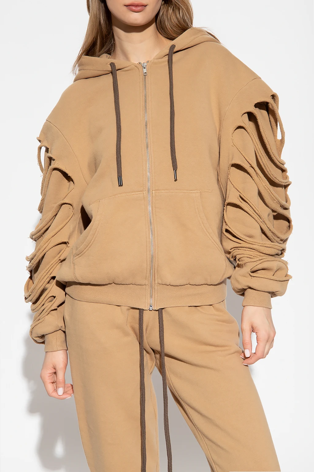 Beige hoodie from R13. Fastened with a zip, this garment features a drawstring hood, raw-trimmed cut-outs at the sleeves, two slip pockets and ribbed trims at the hem and cuffs.
