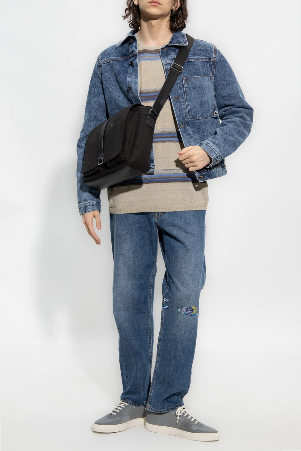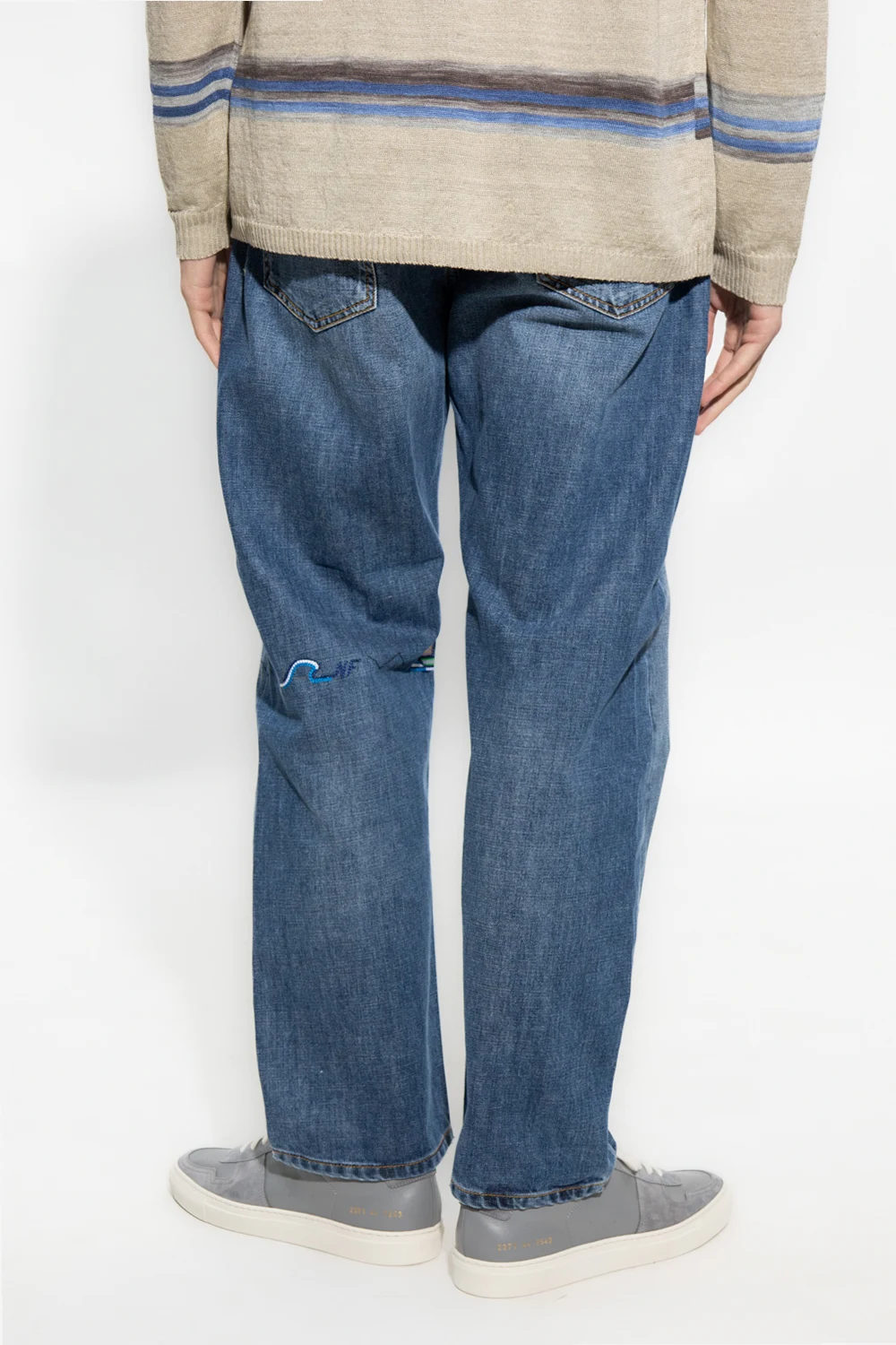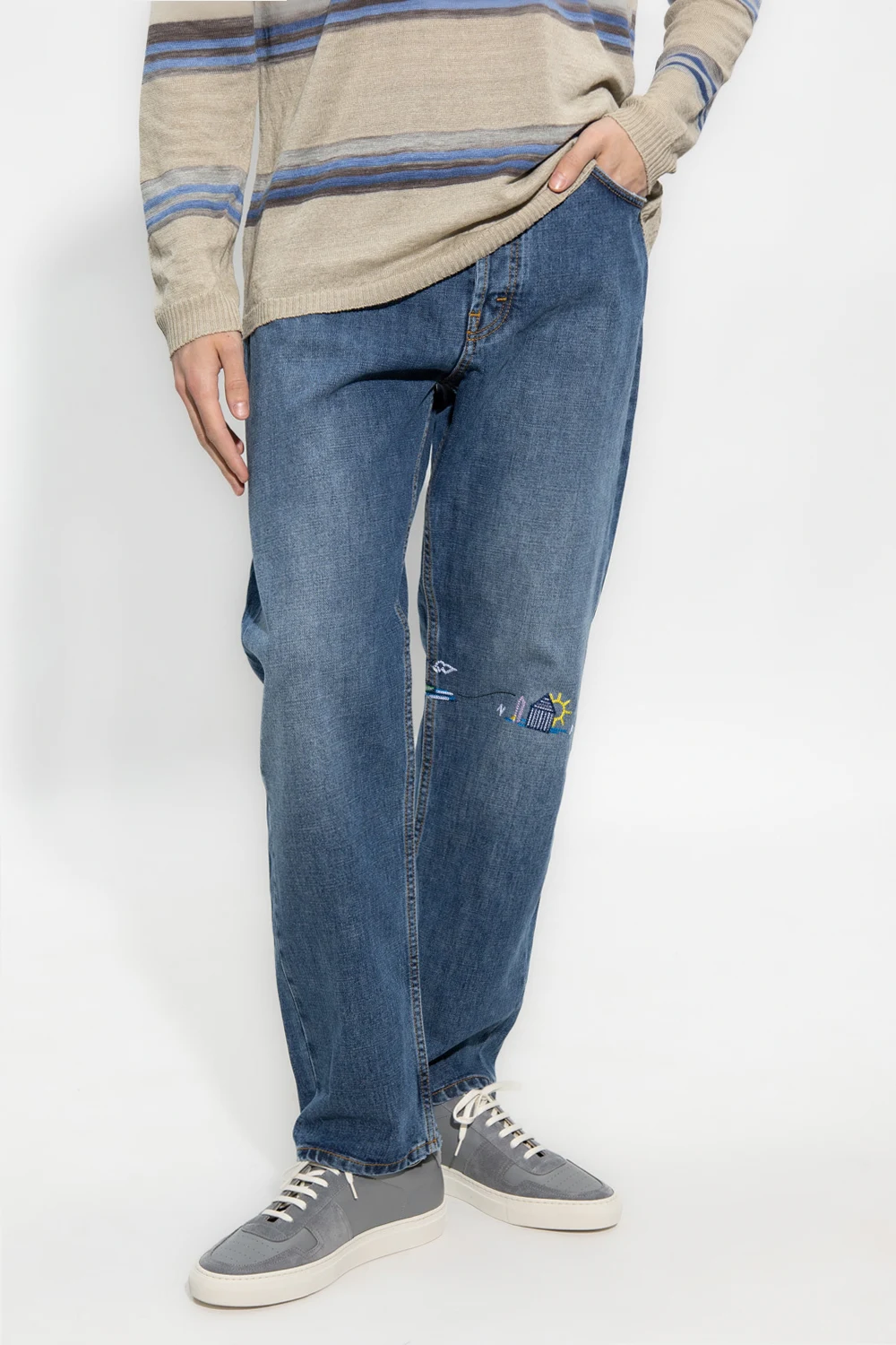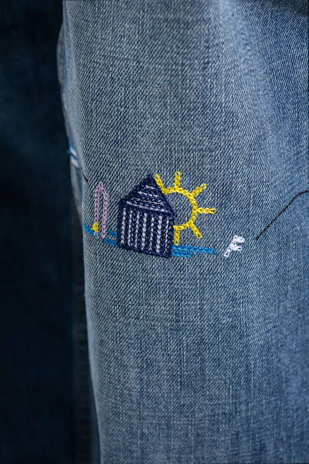 Blue jeans from Nick Fouquet. Fastened with buttons, this pair features a multicolored embroidered house motif, two front pockets, two back pockets and wide, slightly tapered legs.
