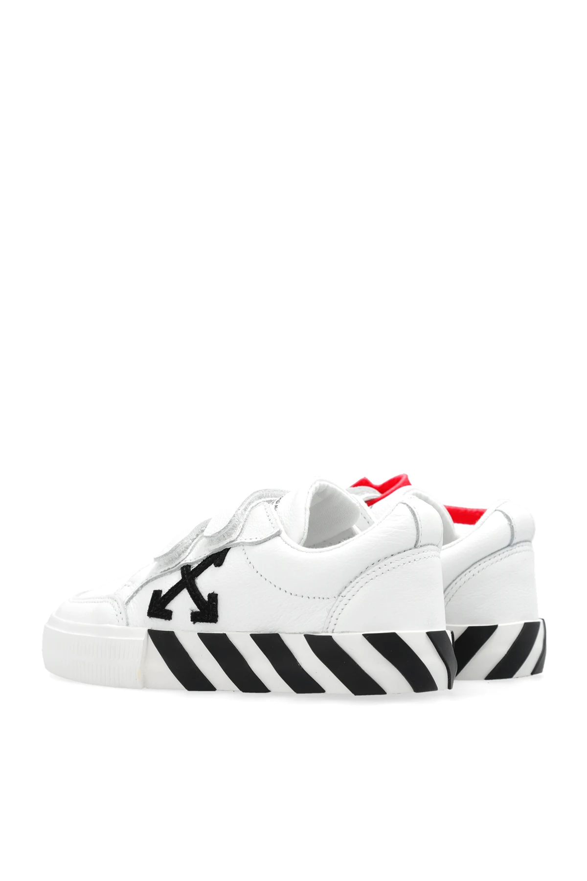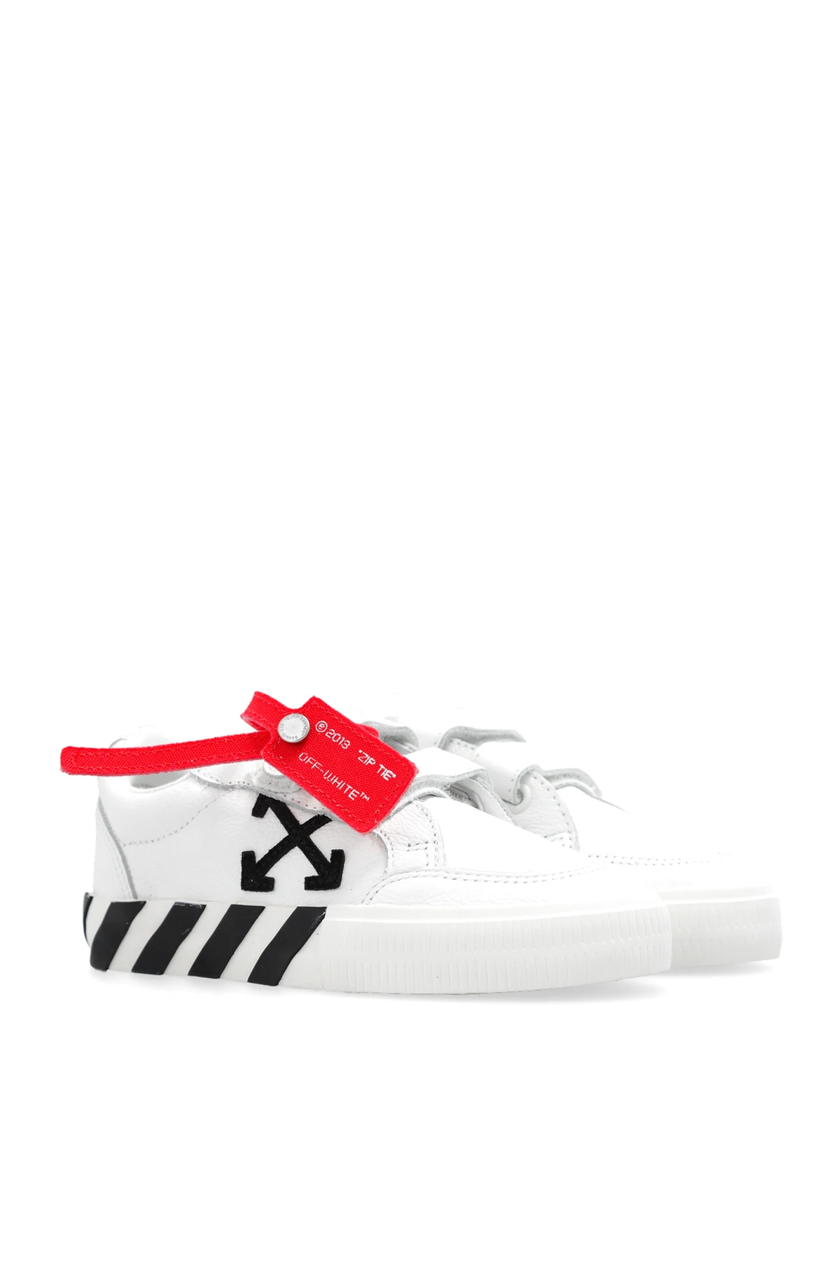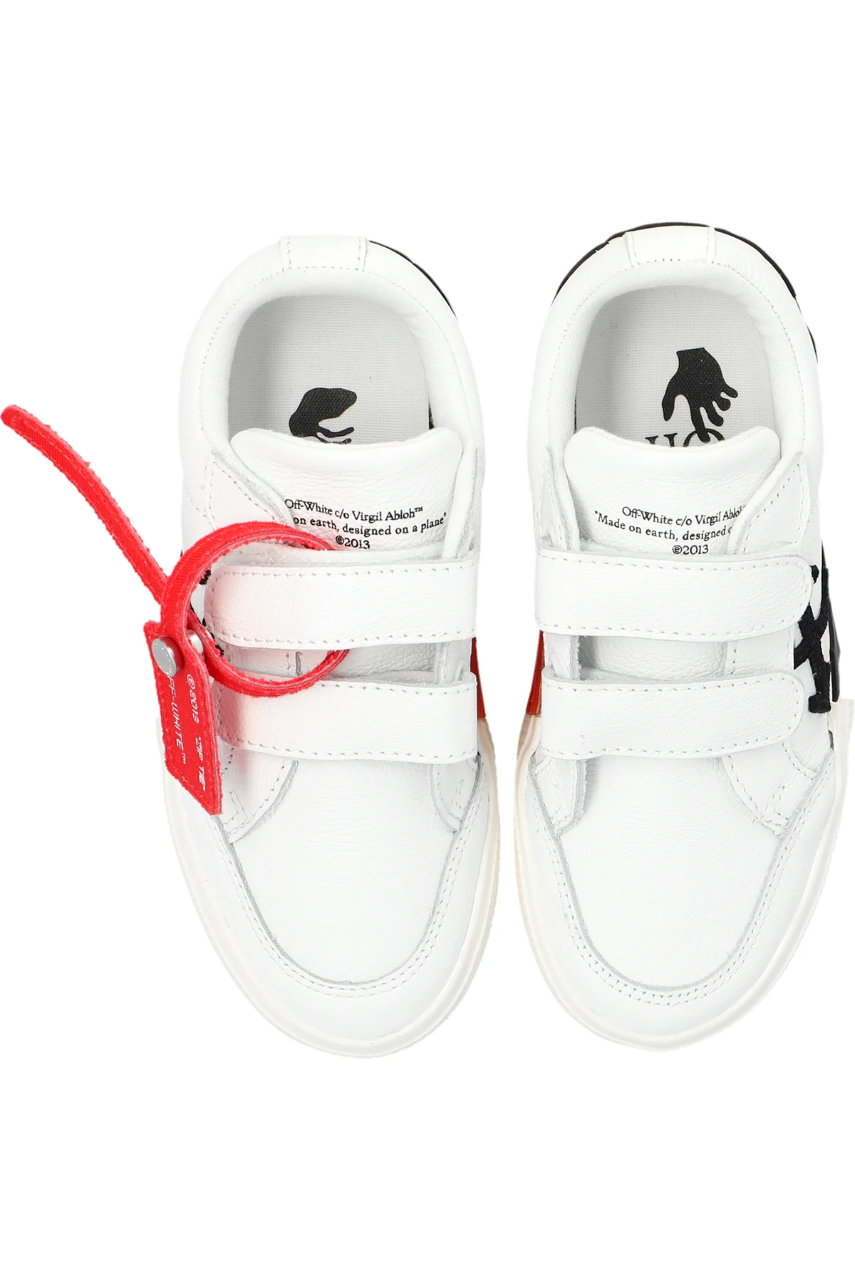 White ‘Velcro Vulcanized’ sneakers from Off-White Kids. Made of leather and fabric, this pair features velcro fastening, a black pattern with a logo, red appliqué and white rubber sole.