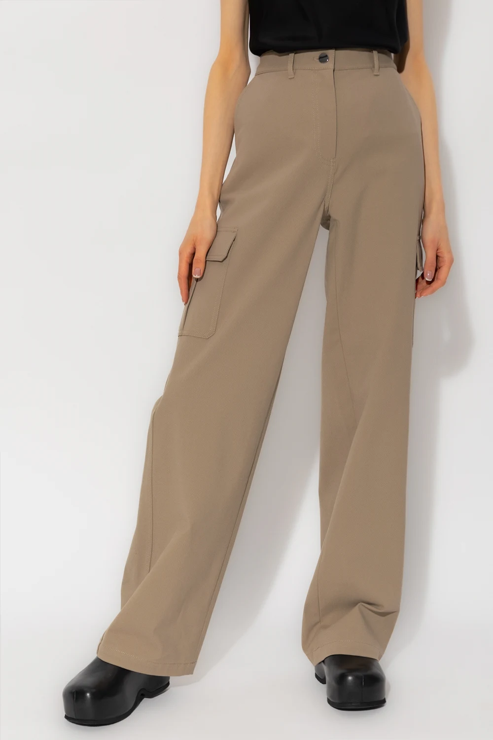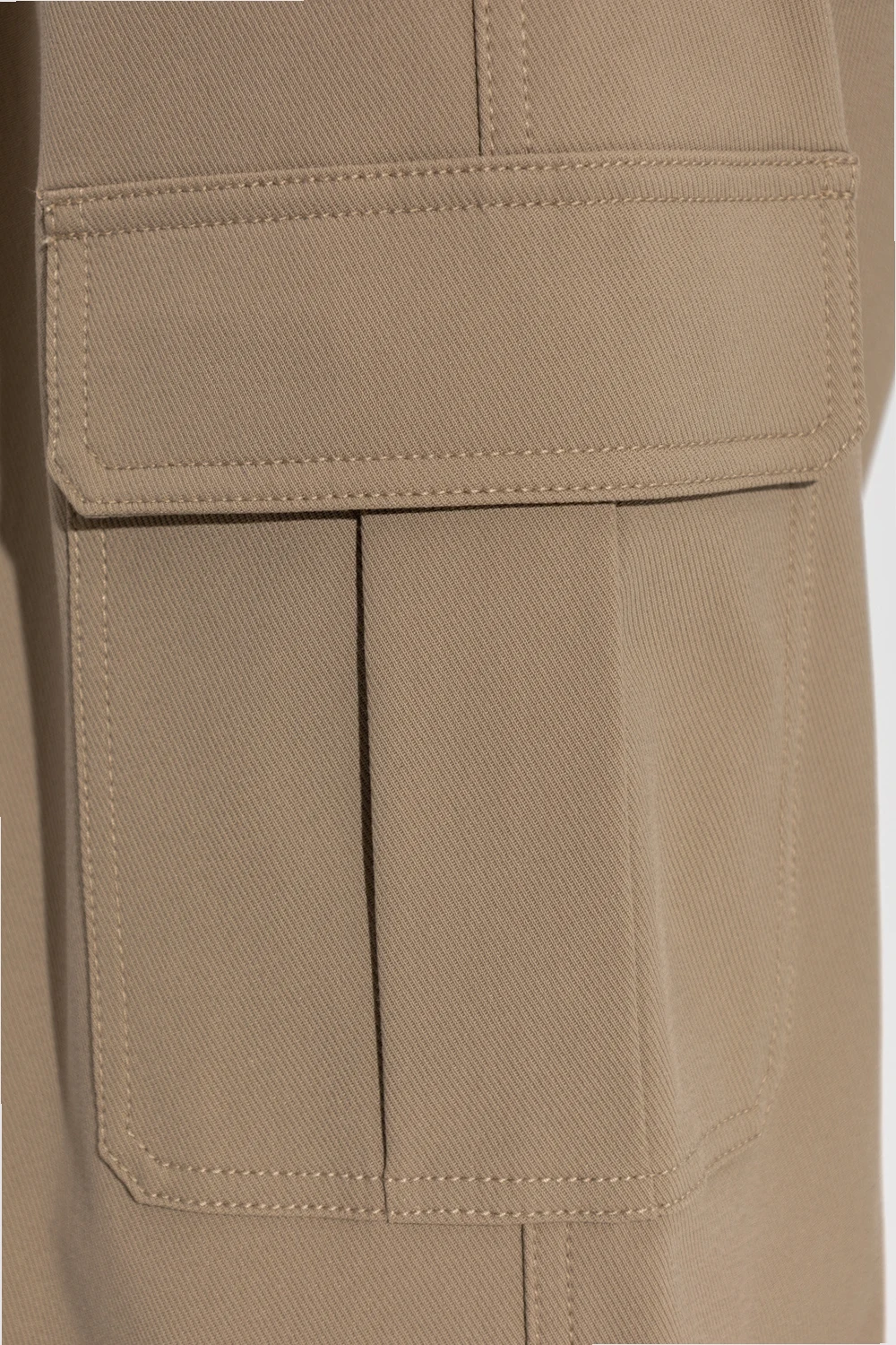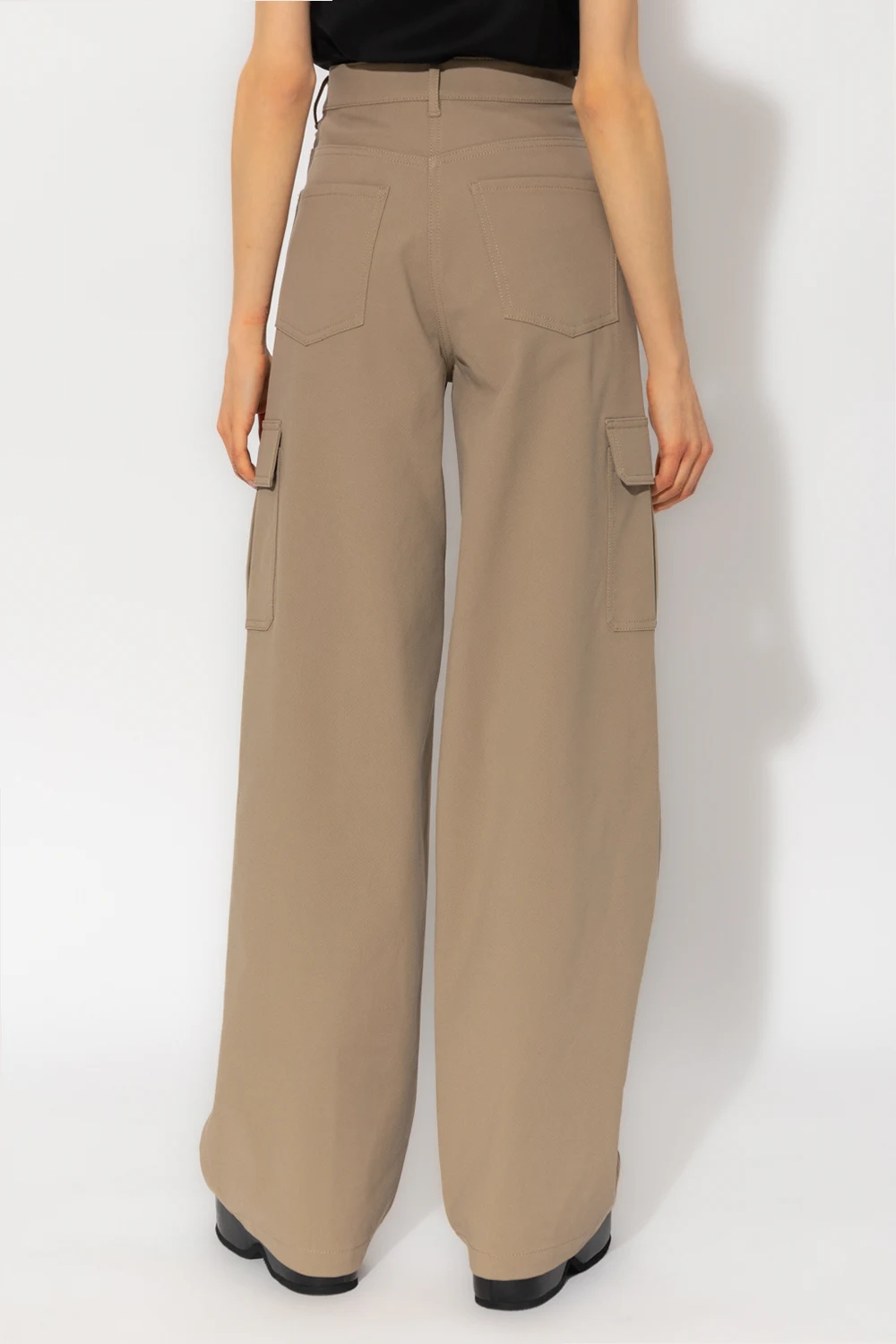Light brown cargo trousers from Theory. Crafted from a cotton blend, this pair falls with wide legs and features a zip fly with a button and hook, four slip pockets and two flapped pockets.
