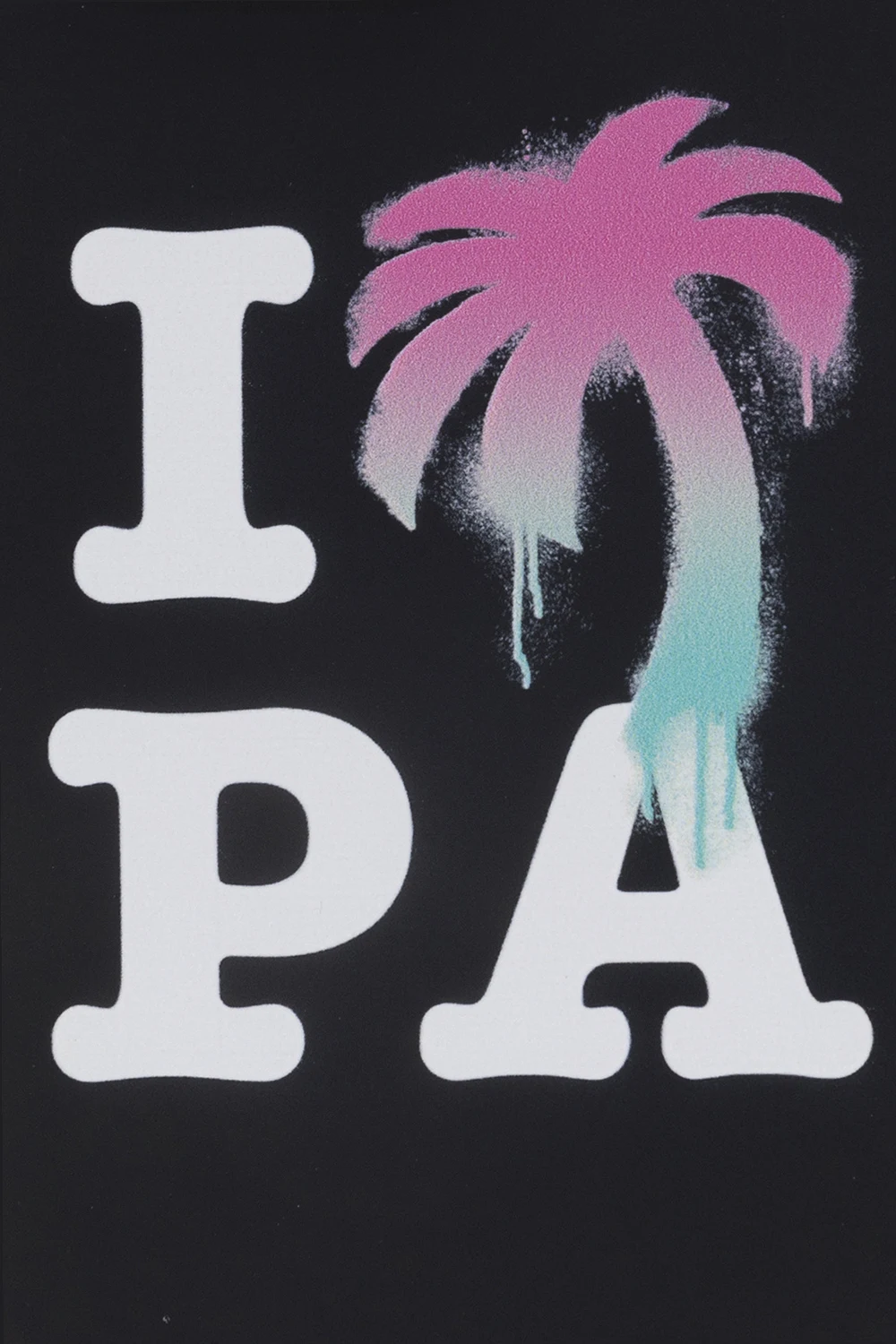 Black iPhone 14 case with a multicolored print and white logo from Palm Angels.