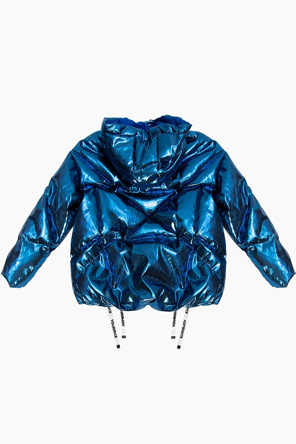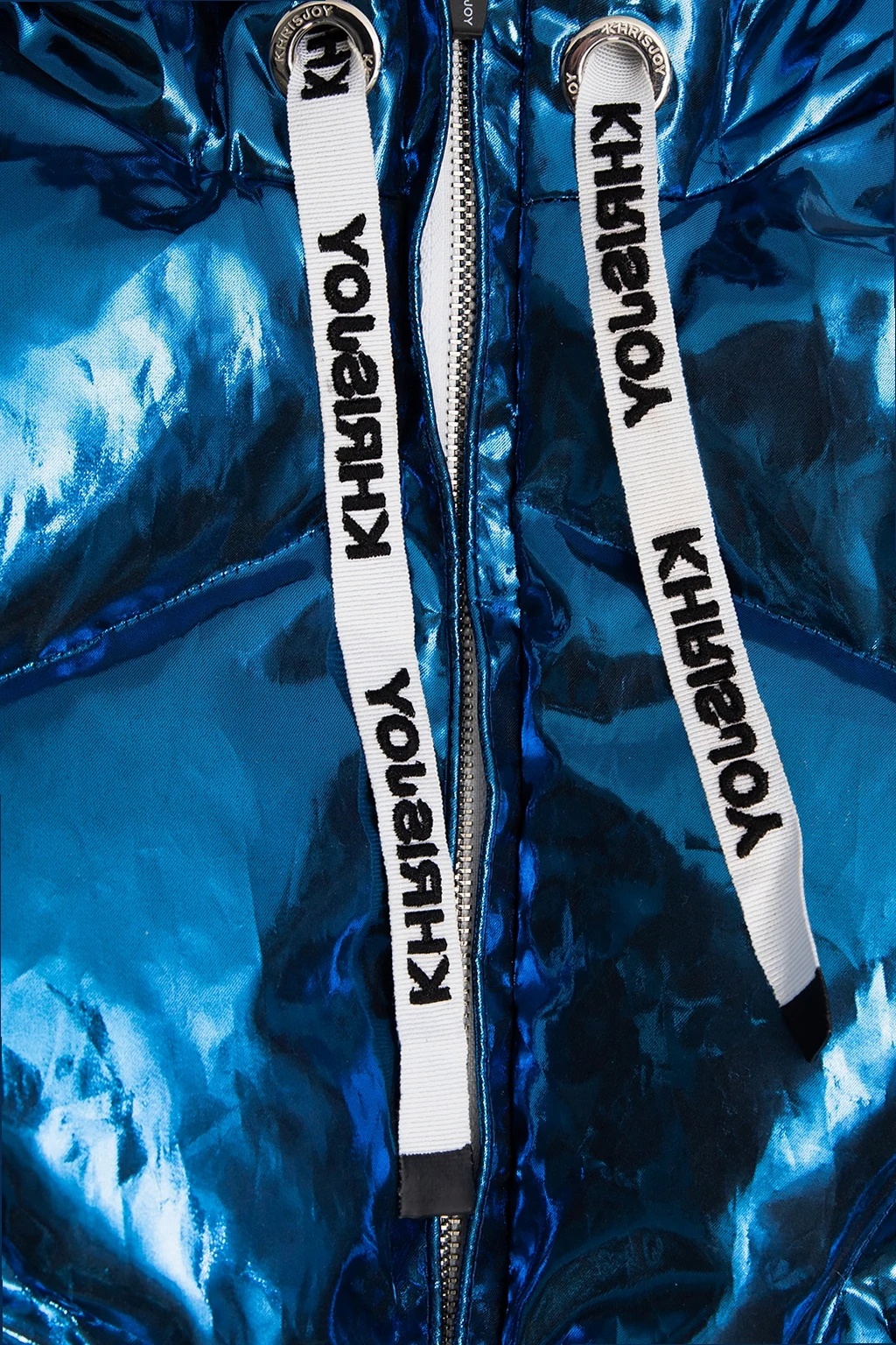 Navy ‘Khriskid’ quilted down jacket with a metallic effect from Khrisjoy Kids. Fastened with a zip, this garment features logo-embroidered drawstrings at the hood and hem, two front slip pockets and long sleeves with zip details.