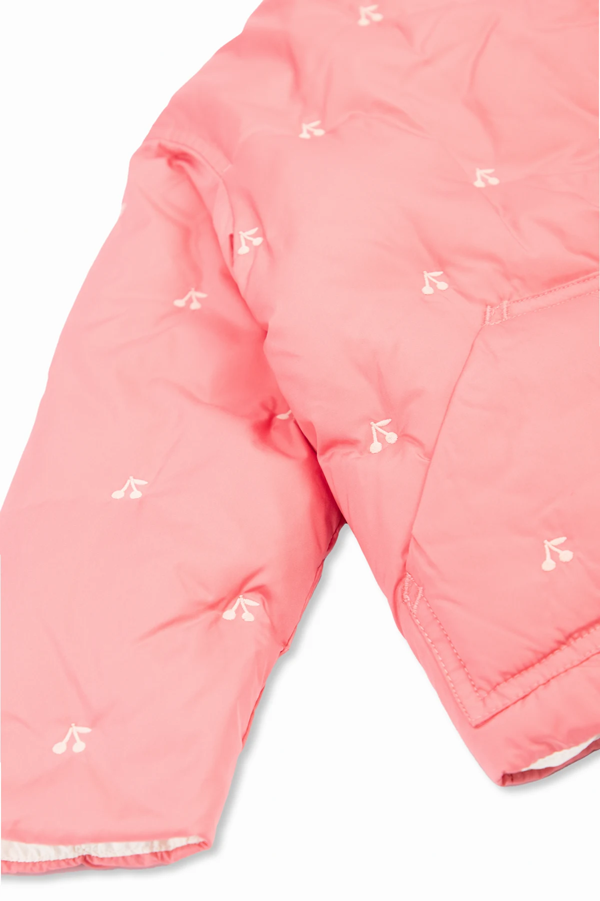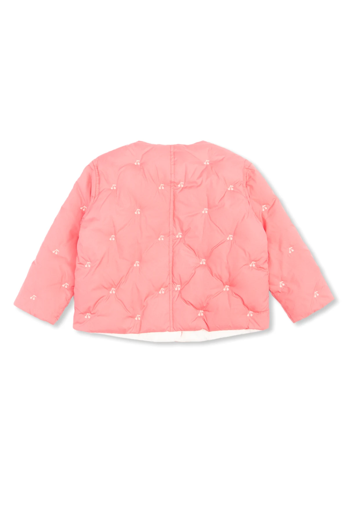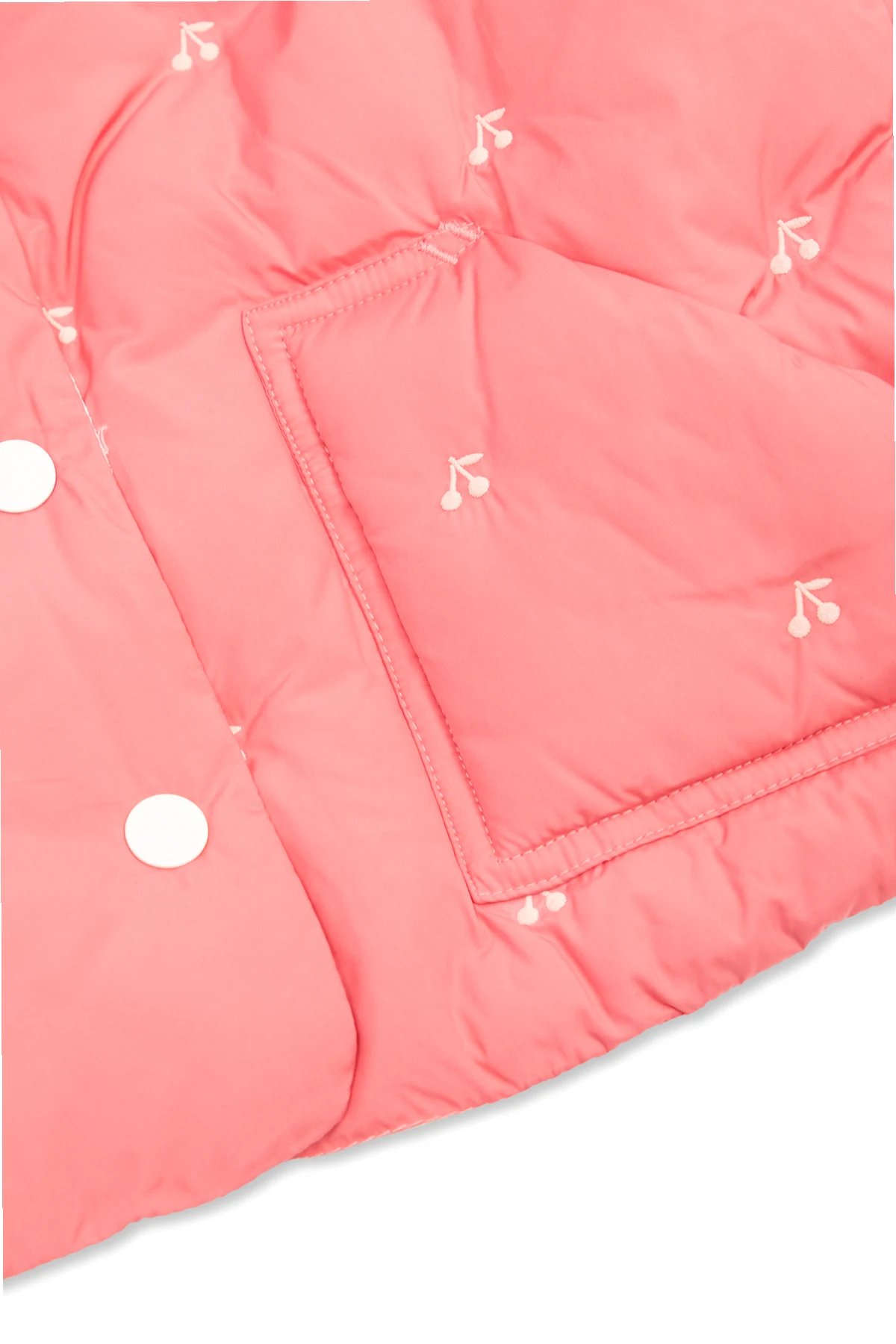 Pink ‘Baila’ jacket from Bonpoint. Made of waterproof material, this style fastens via snaps and showcases an embroidered colourful pattern with fruits, two slip pockets, long sleeves and a round neck.