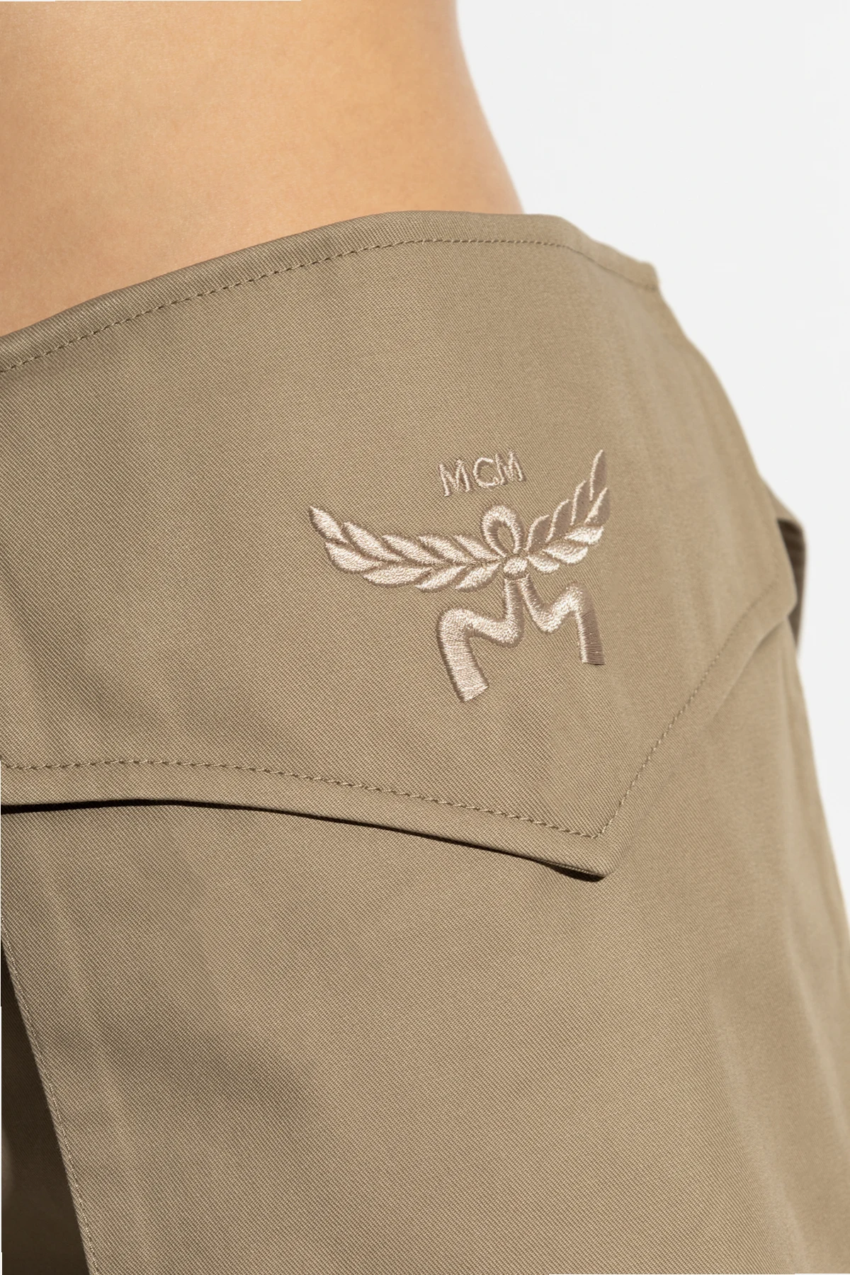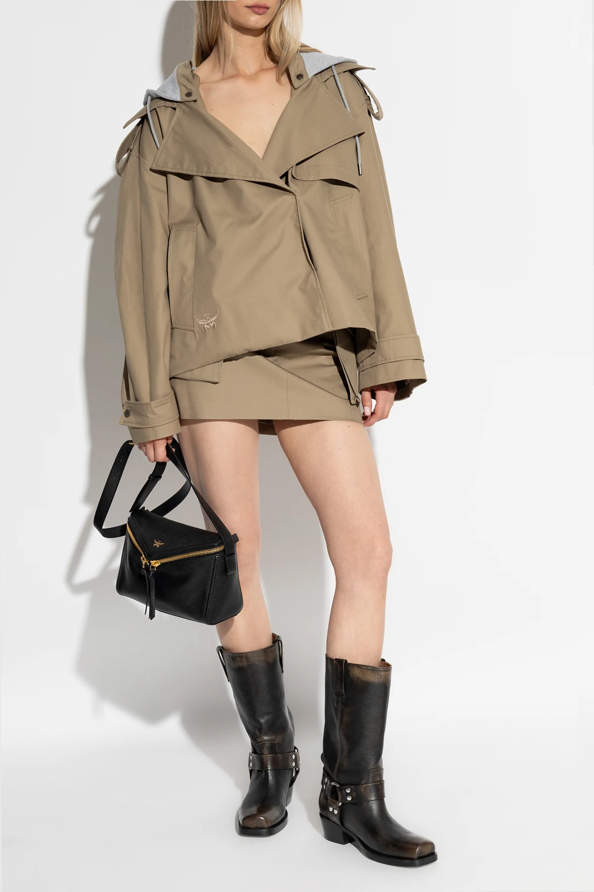 Charakteristische große Seitentaschen und ein breiter Gürtel mit dekorativer Schnalle in Silberfarbe verleihen ihm einen unverwechselbaren Charme. Auf einer der Taschen befindet sich das gestickte Logo des Designers – "MCM" mit dem charakteristischen Flügelsymbol, das die Exklusivität des Produkts unterstreicht.