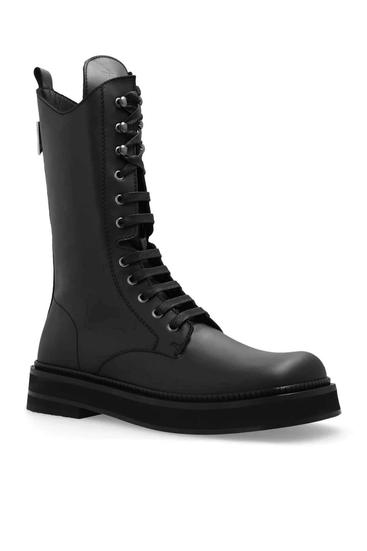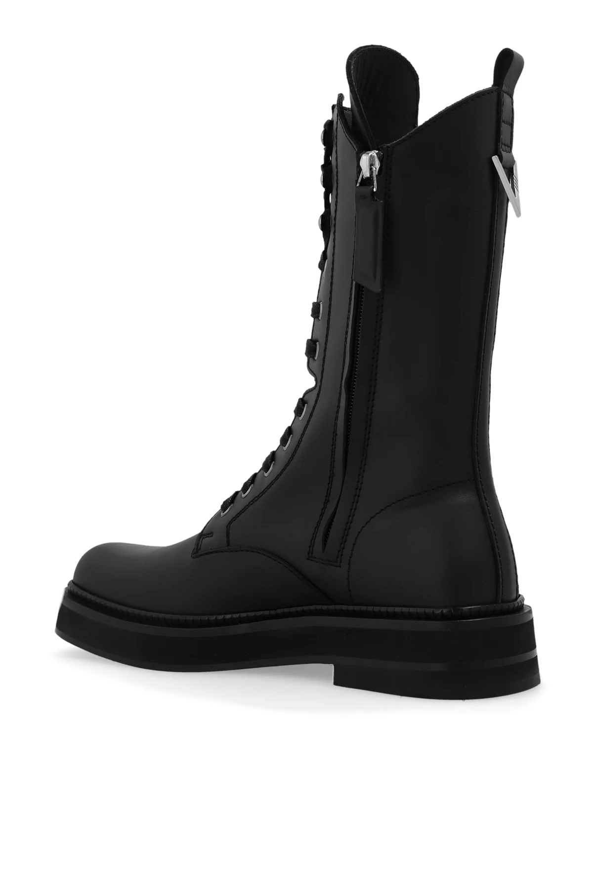 Black 'Robin’ ankle boots from The Attico. Made of smooth leather with a square toe, this lace-up model sits on a black leather sole with a rubber trim and features a side zip and silver-tone logo hardware on the back.