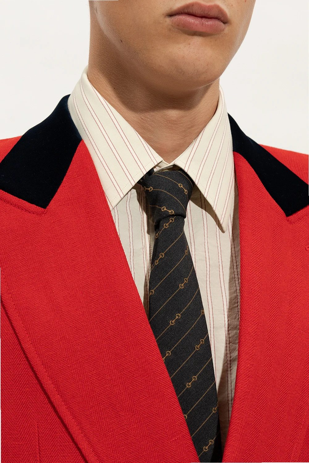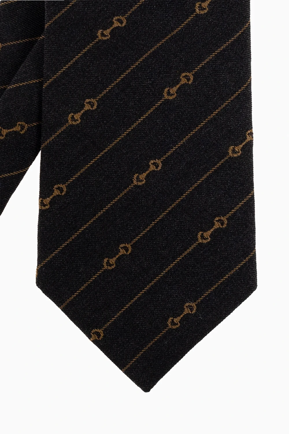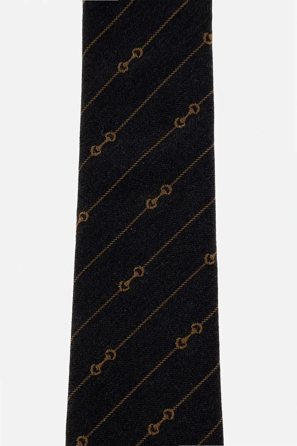Dark grey tie from Gucci. Crafted from wool, this item showcases beige embroidery with the brand's signature horsebit.