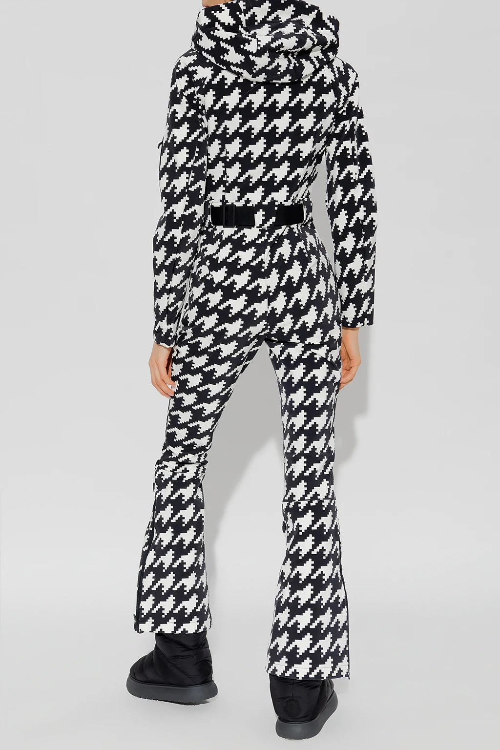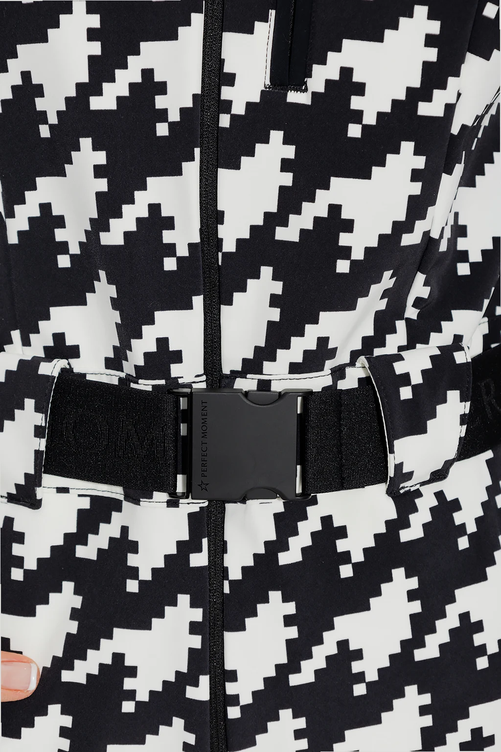 White and black ‘Star’ insulated ski suit from Perfect Moment. Made of waterproof, quick-dry, breathable Toray Dermizax™, this design features a zip fastening, the brand’s signature houndstooth pattern, adjustable waist belt, two front zip pockets, long sleeves and two-layered, flared legs – zipped outer layer and elasticated fleece lining with snap fastenings.