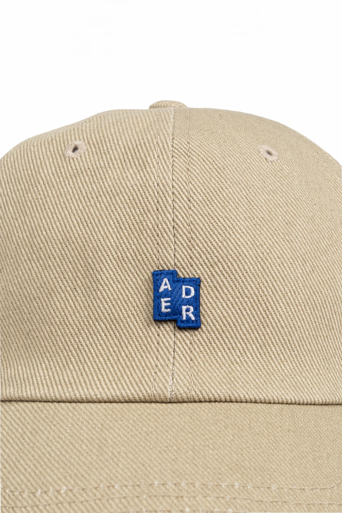 Auf der Vorderseite der Kappe befindet sich ein dezentes, rechteckiges Markenlogo in Blau mit weißen Buchstaben "ADER", das einen subtilen, aber markanten Akzent setzt. Belüftungsöffnungen an der Oberseite der Kappe sorgen für eine ausgezeichnete Luftzirkulation, und die Klettverschlussregulierung auf der Rückseite, zusammen mit dem blauen Logo-Etikett, ermöglicht eine perfekte Anpassung an verschiedene Kopfgrößen.