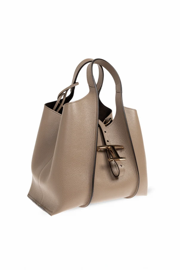 Die beige Farbe verleiht dem Ganzen Subtilität und Vielseitigkeit, während die sorgfältig gearbeitete schwarze Paspelierung an den Kanten die edle Verarbeitung betont. Die charakteristische goldene Schnalle in Form des Buchstabens „T“ zieht alle Blicke auf sich und setzt ein raffiniertes, markentypisches Erkennungsmerkmal. Das Innere wird durch eine dezente, mit dem Designerlogo versehene Tasche aufgewertet, die die Originalität des Produkts garantiert.