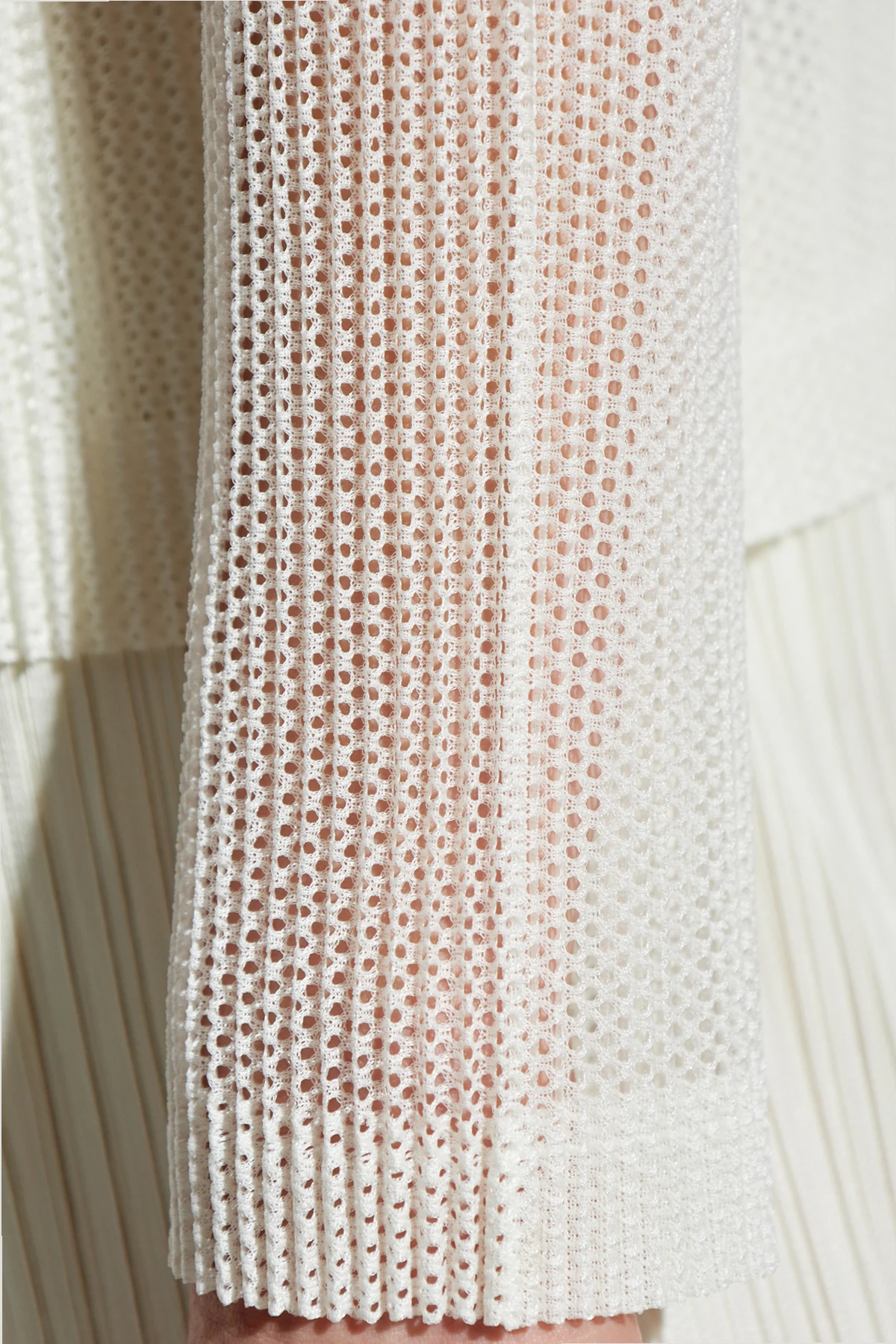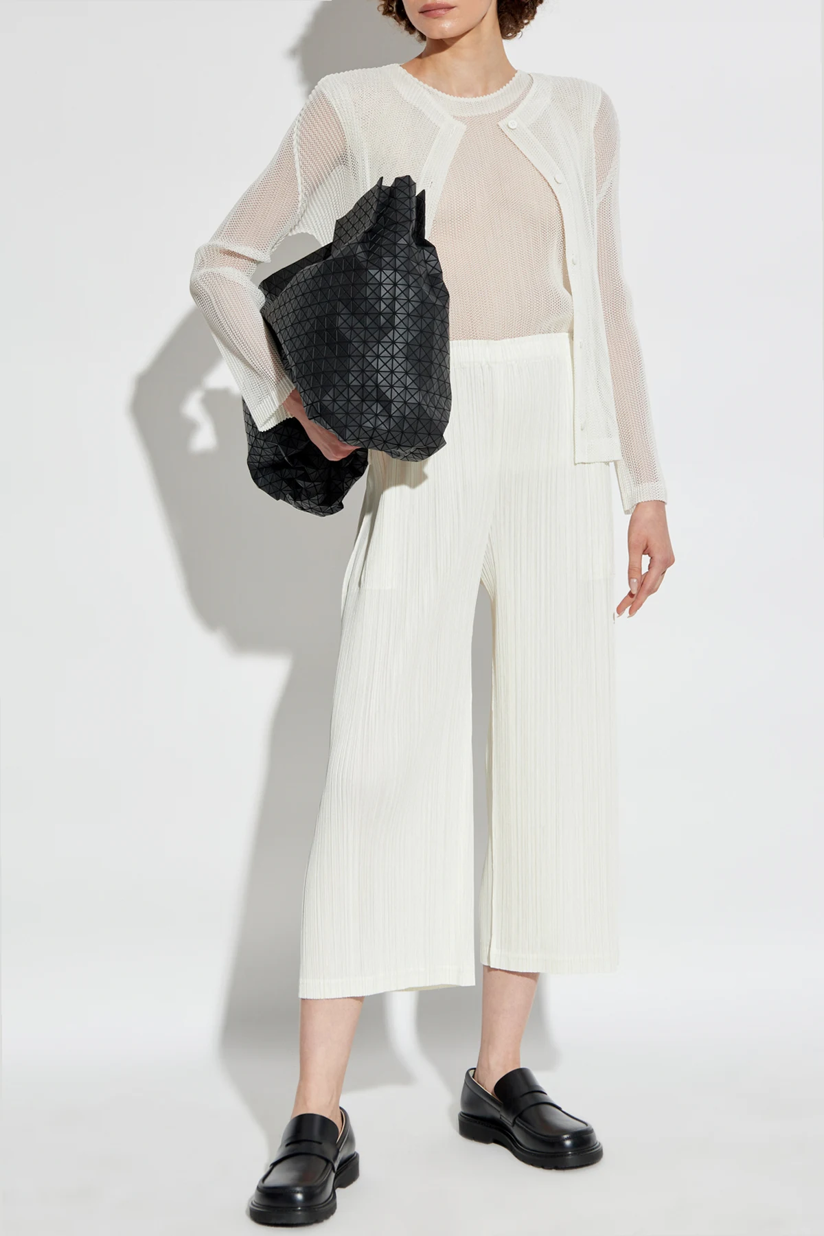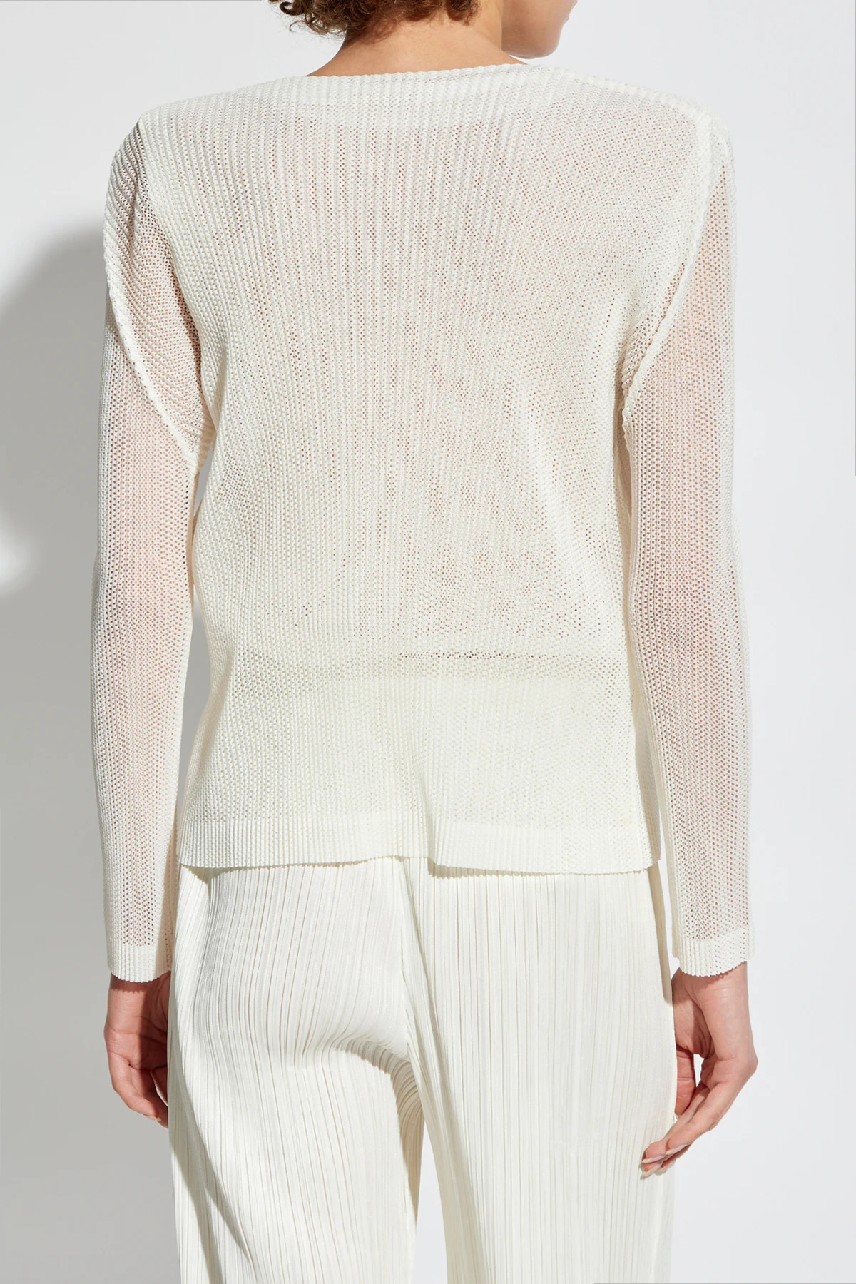Auf den beigefügten Fotos ist ein exklusives Kleidungsstück zu sehen, nämlich ein transparenter Cardigan , der Teil der Kollektion eines renommierten Designers ist. Dieses einzigartige Kleidungsstück, entworfen von der Marke Pleats Please Issey Miyake , strahlt Subtilität und Eleganz aus.
