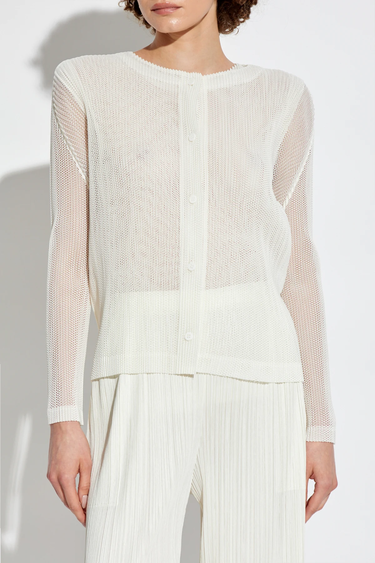 Hergestellt aus einem zarten, durchsichtigen Material mit netzartiger Struktur, zeichnet sich dieser Cardigan durch Leichtigkeit und Subtilität aus. Die feine, gleichmäßige Webart schafft ein elegantes und modernes Aussehen.