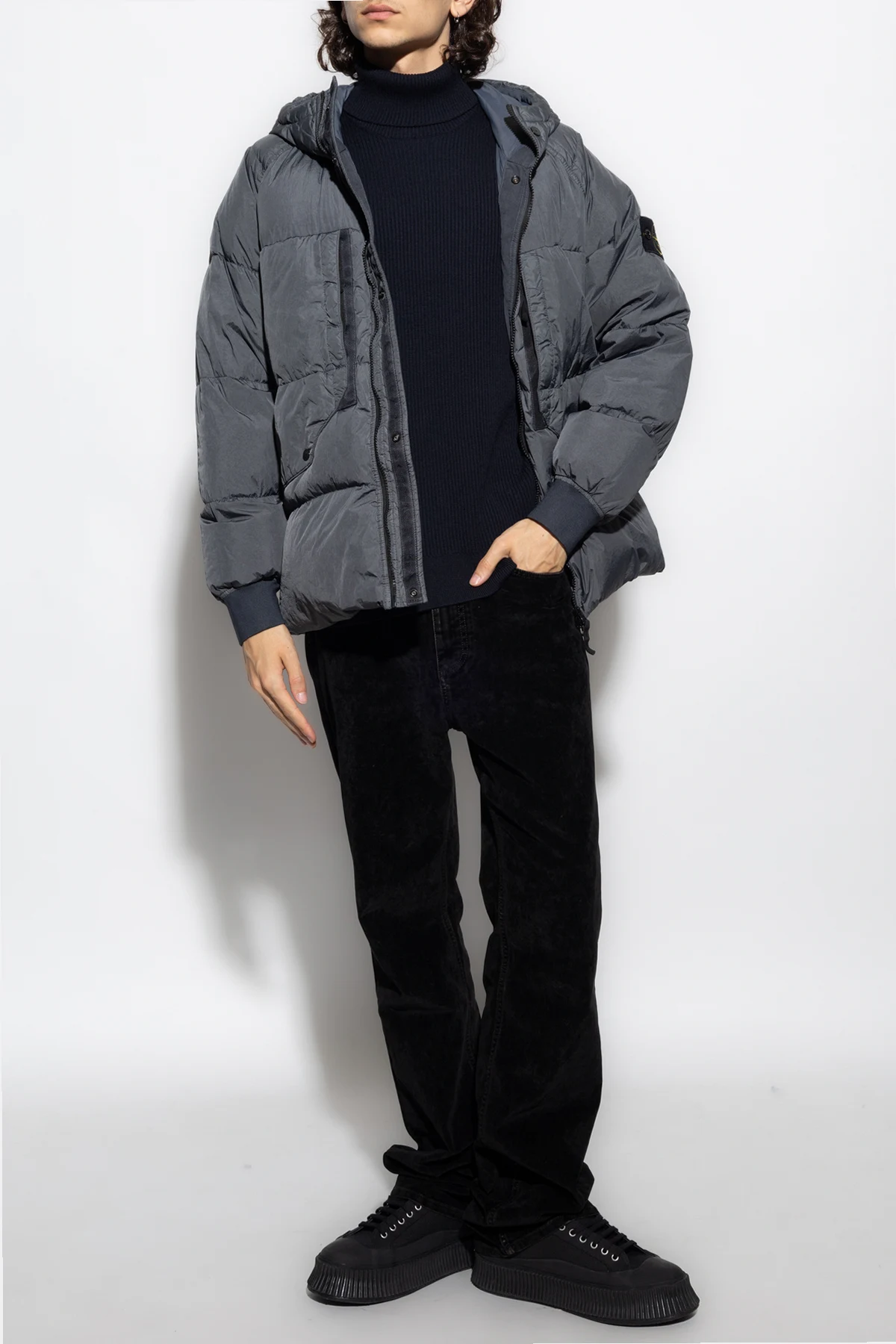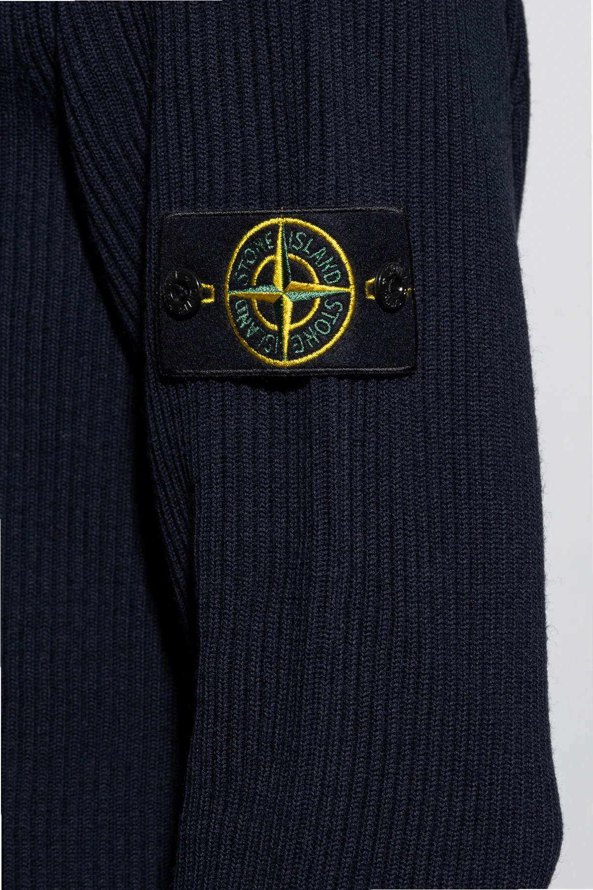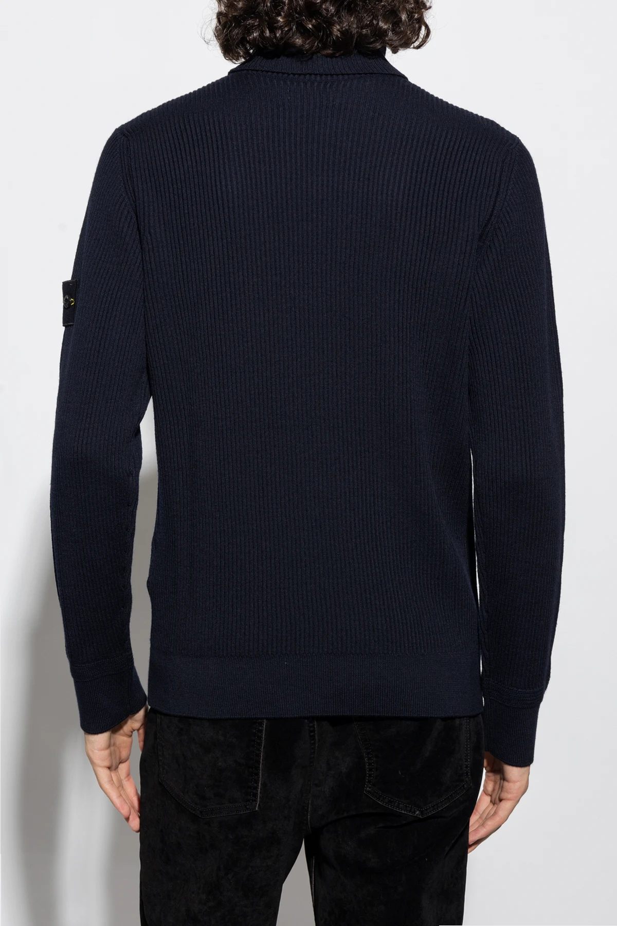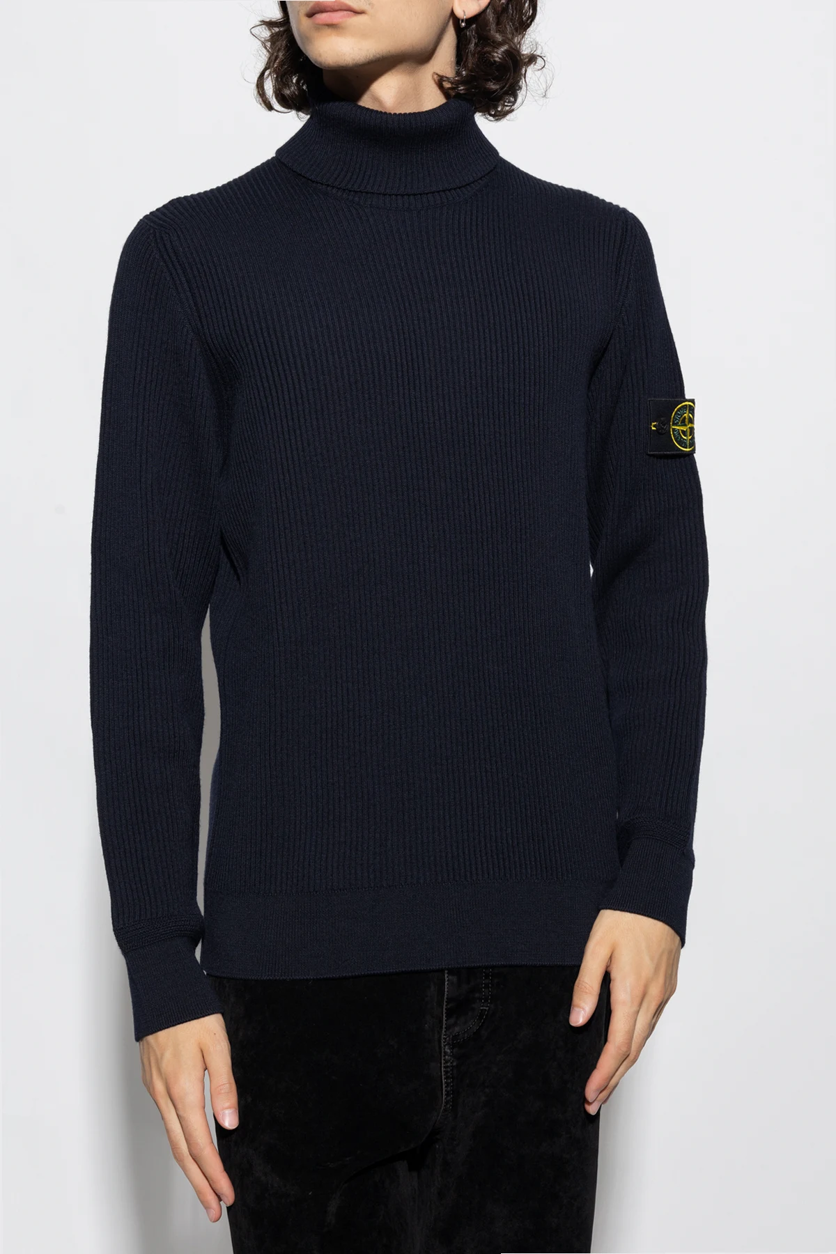 Navy ribbed turtleneck sweater from Stone Island. Made of virgin wool, this long sleeve design features a detachable sleeve patch with a logo and ribbed edges.