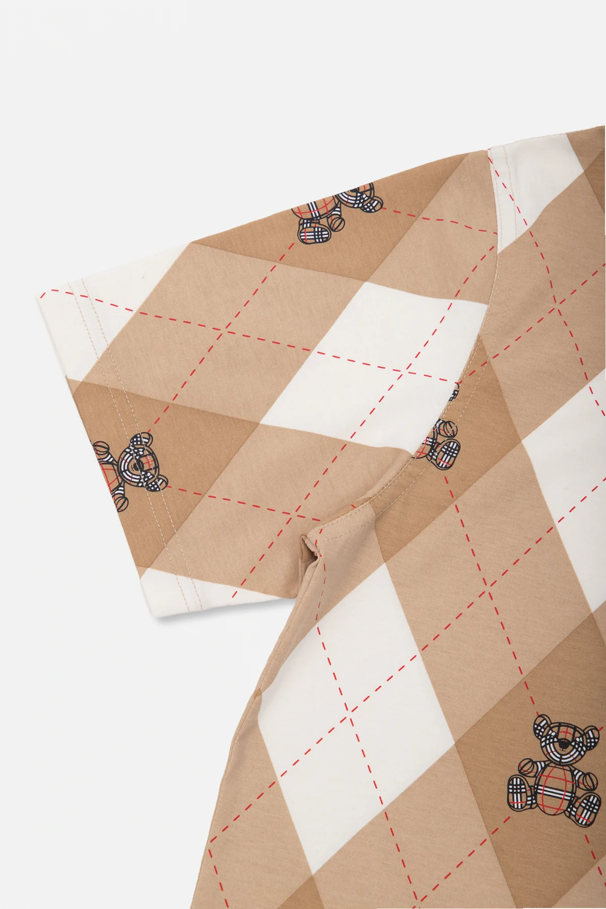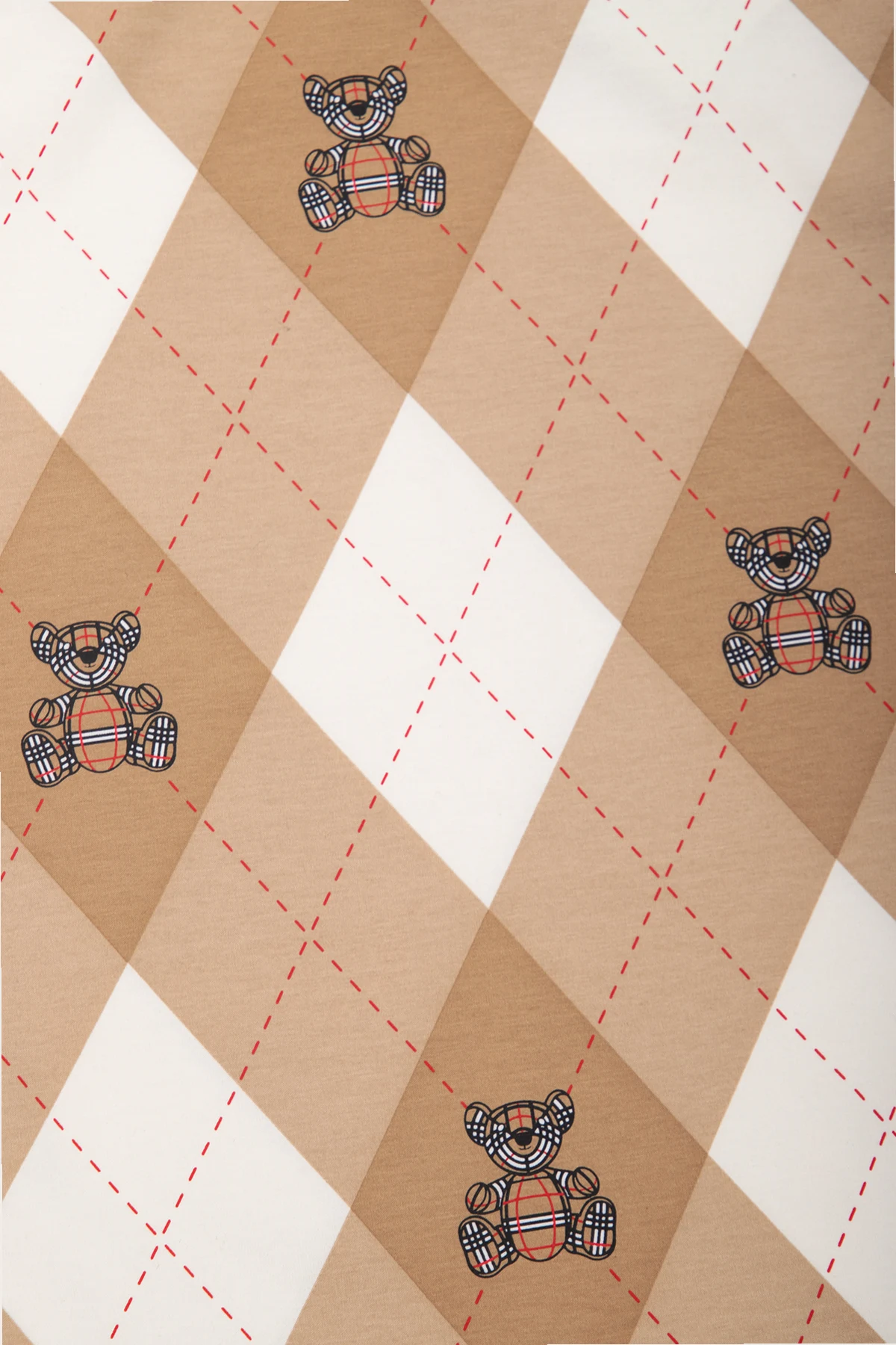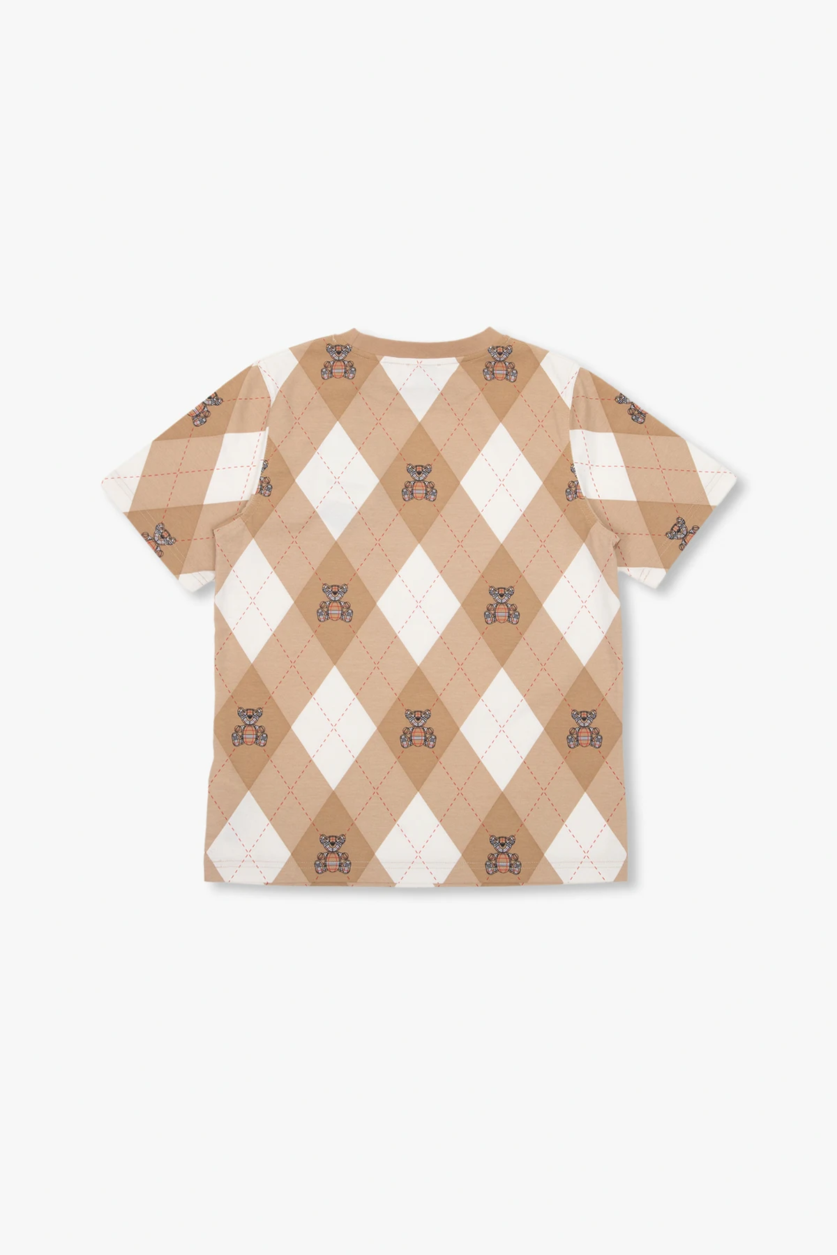 Beige and white T-shirt from Burberry Kids. Made of cotton, this short sleeve design features a geometric pattern, Thomas Bear motif and ribbed crew neck.