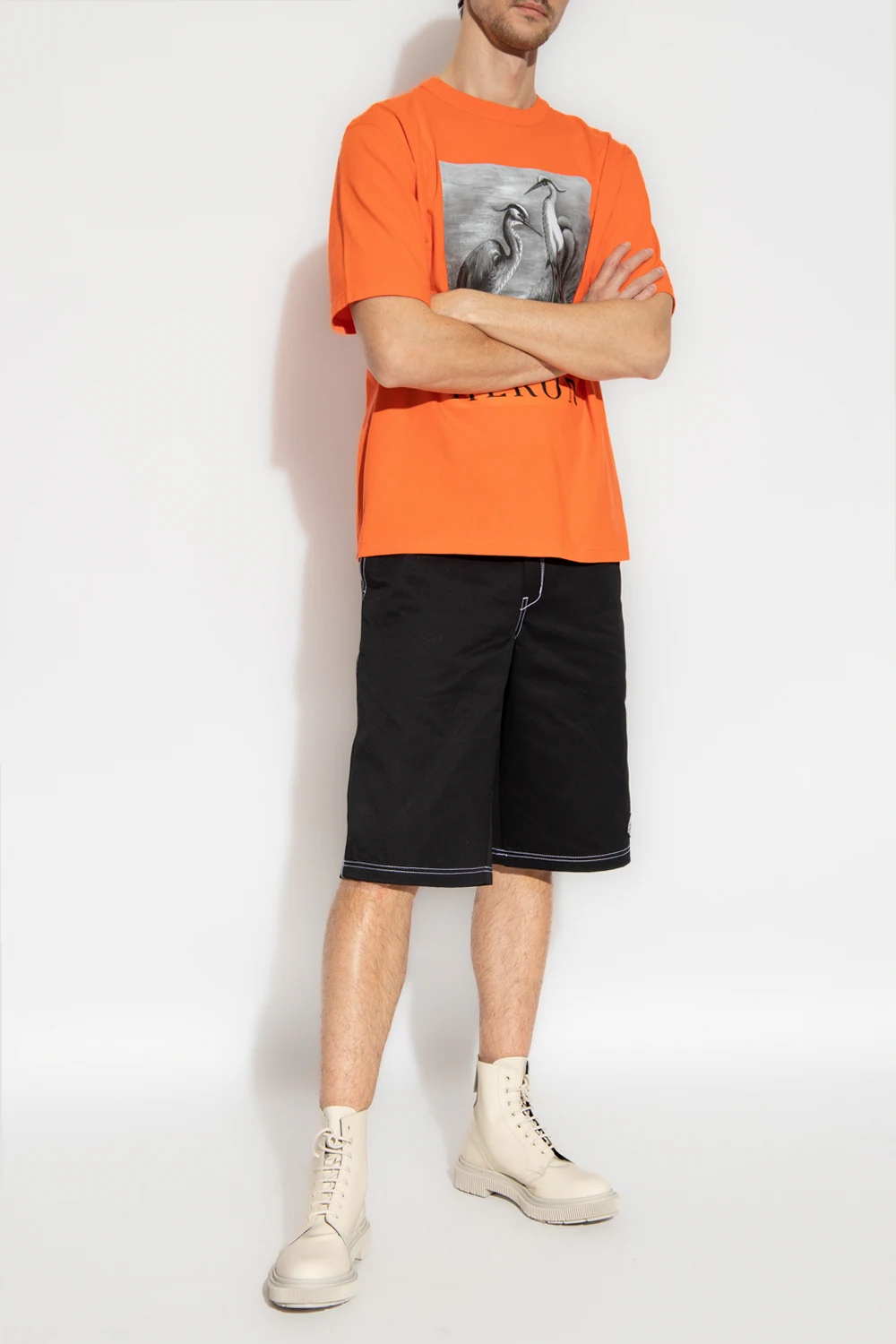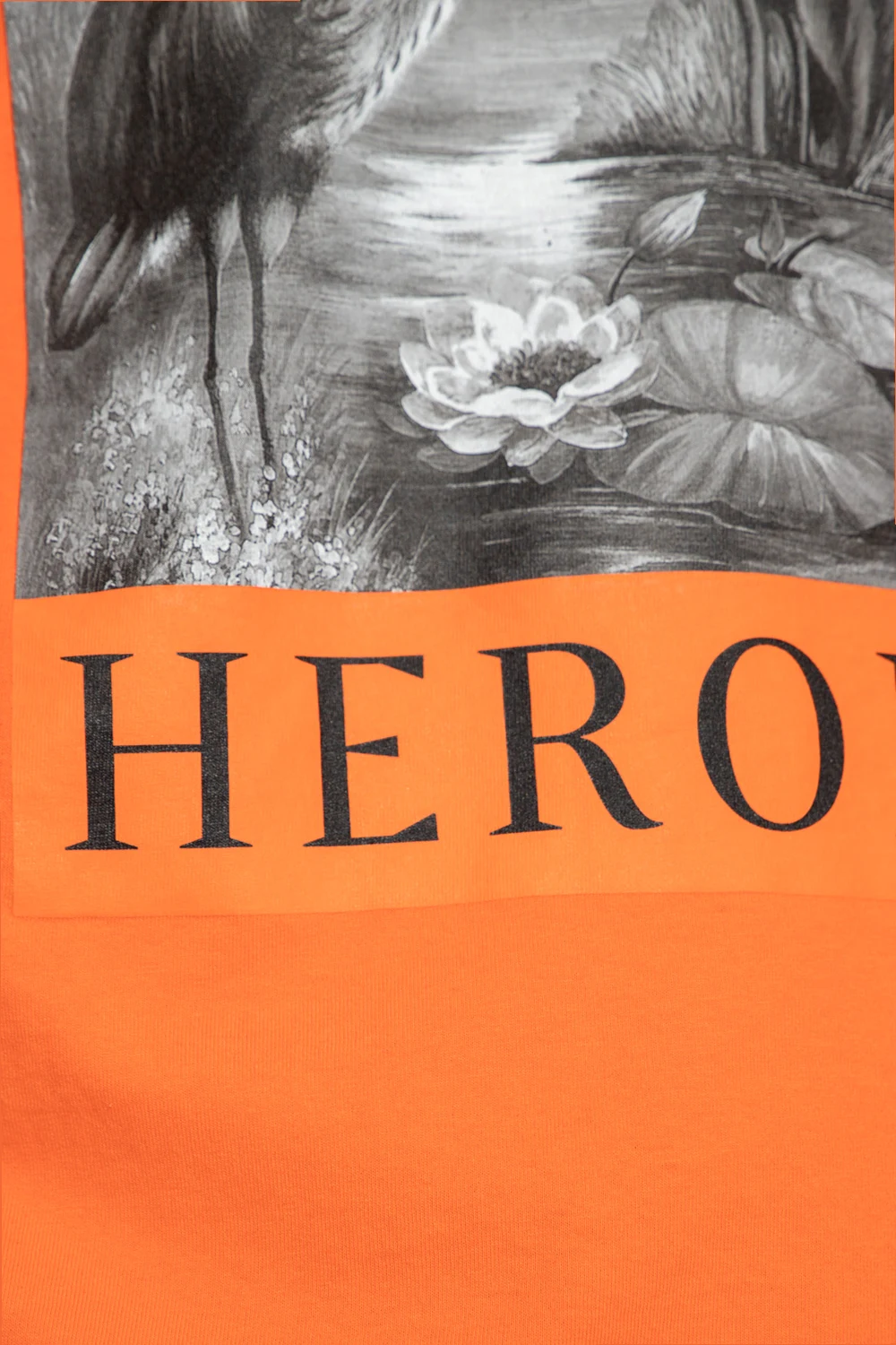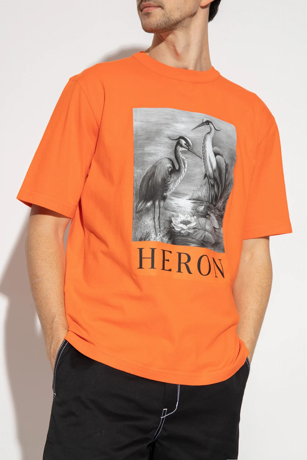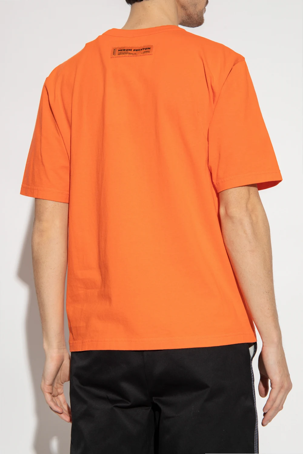 Orange T-shirt from Heron Preston. Made of cotton, this short sleeve design features a grey and black bird motif, logo detail, ribbed crew neck and the brand’s signature logo patch in orange and black at the back.