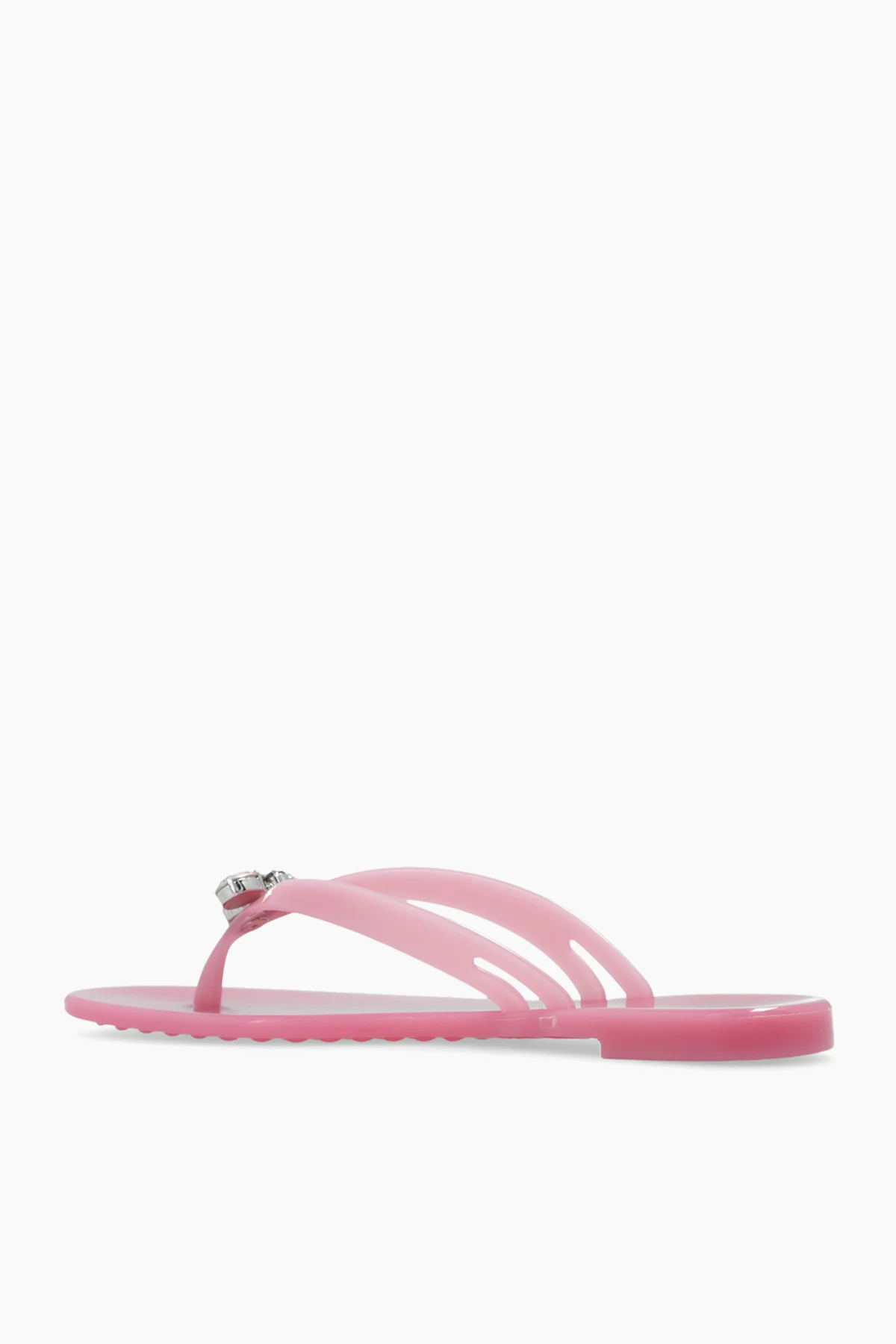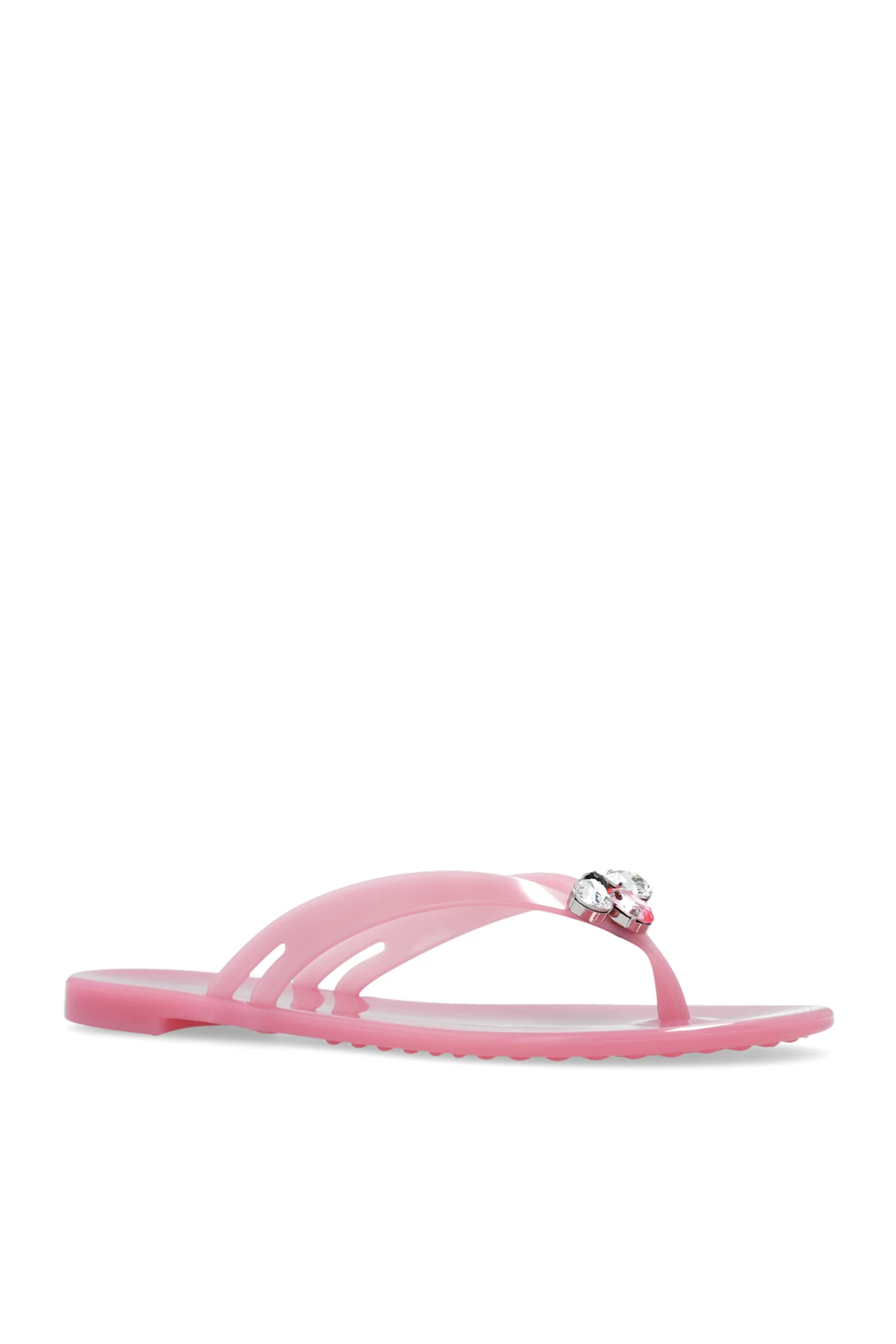 Pink ‘Jelly’ flip-flops from Casadei. Made of rubber, this pair features crystals and a pink rubber sole.