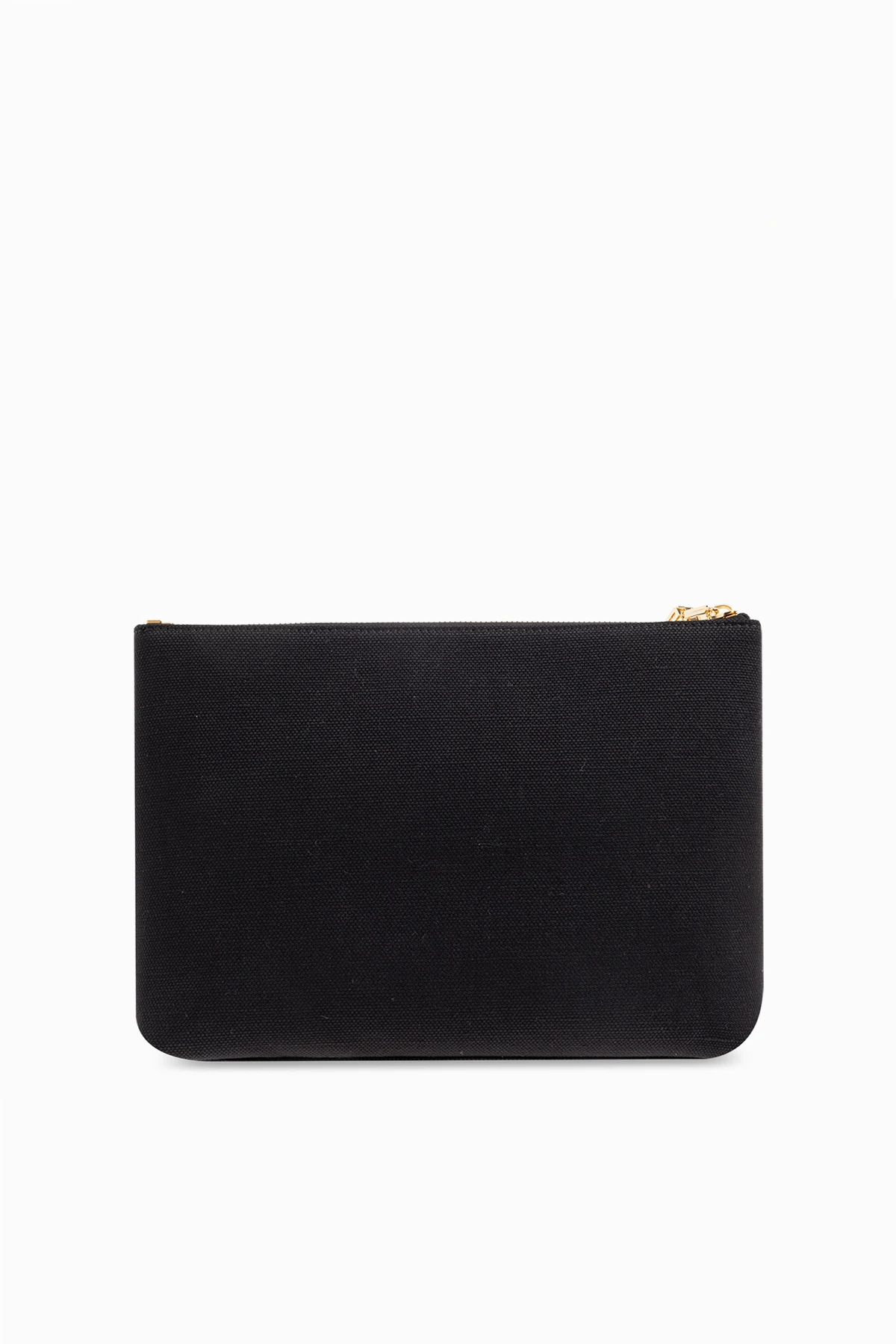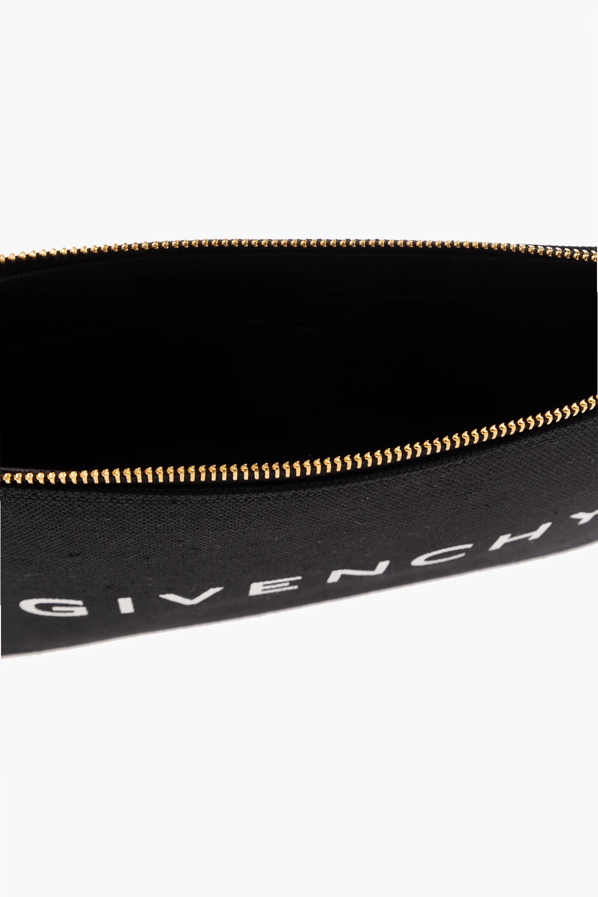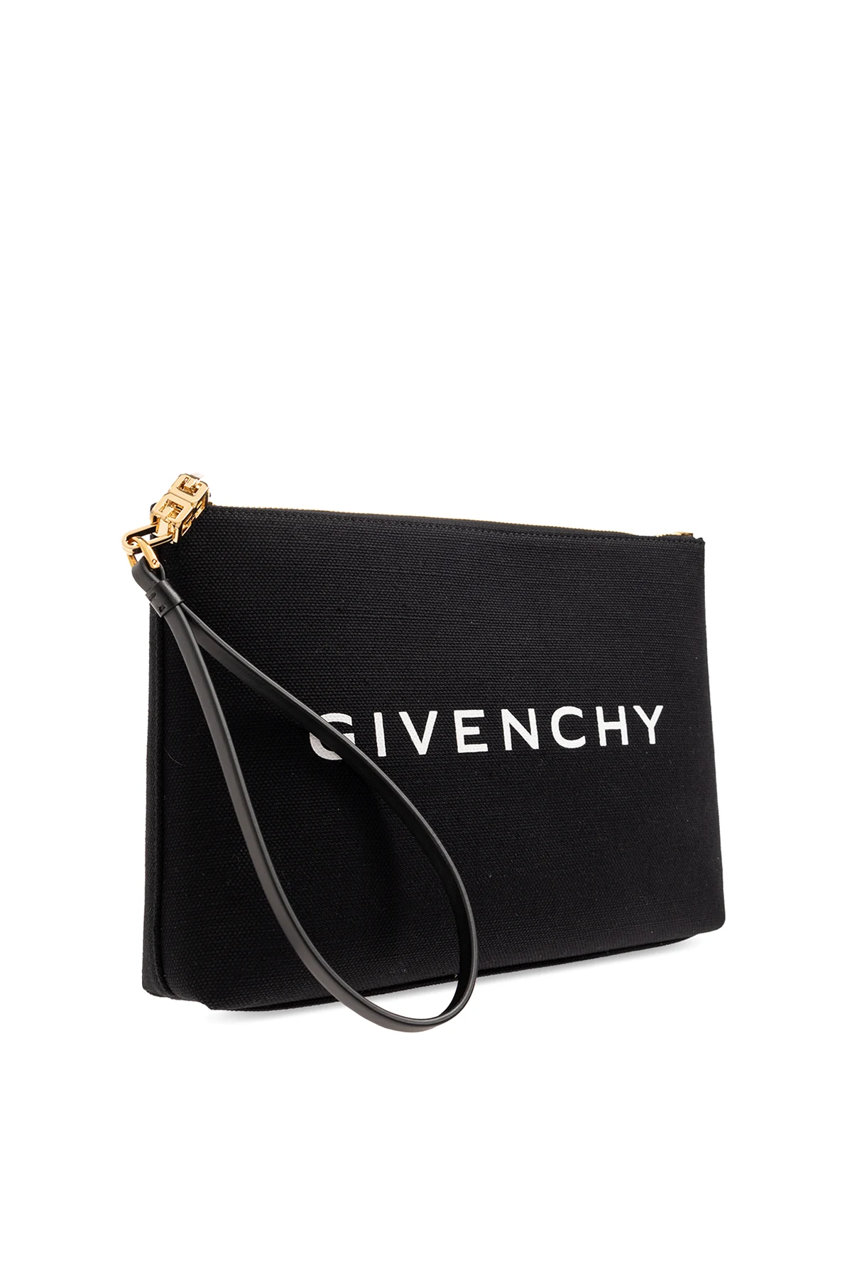 Black case from Givenchy. Made of linen and cotton, this item fastens via a zip and showcases a graphic print with the brand's logo, gold-tone metal hardware and one internal compartment with a slip pocket. Comes with an appliquéd strap.