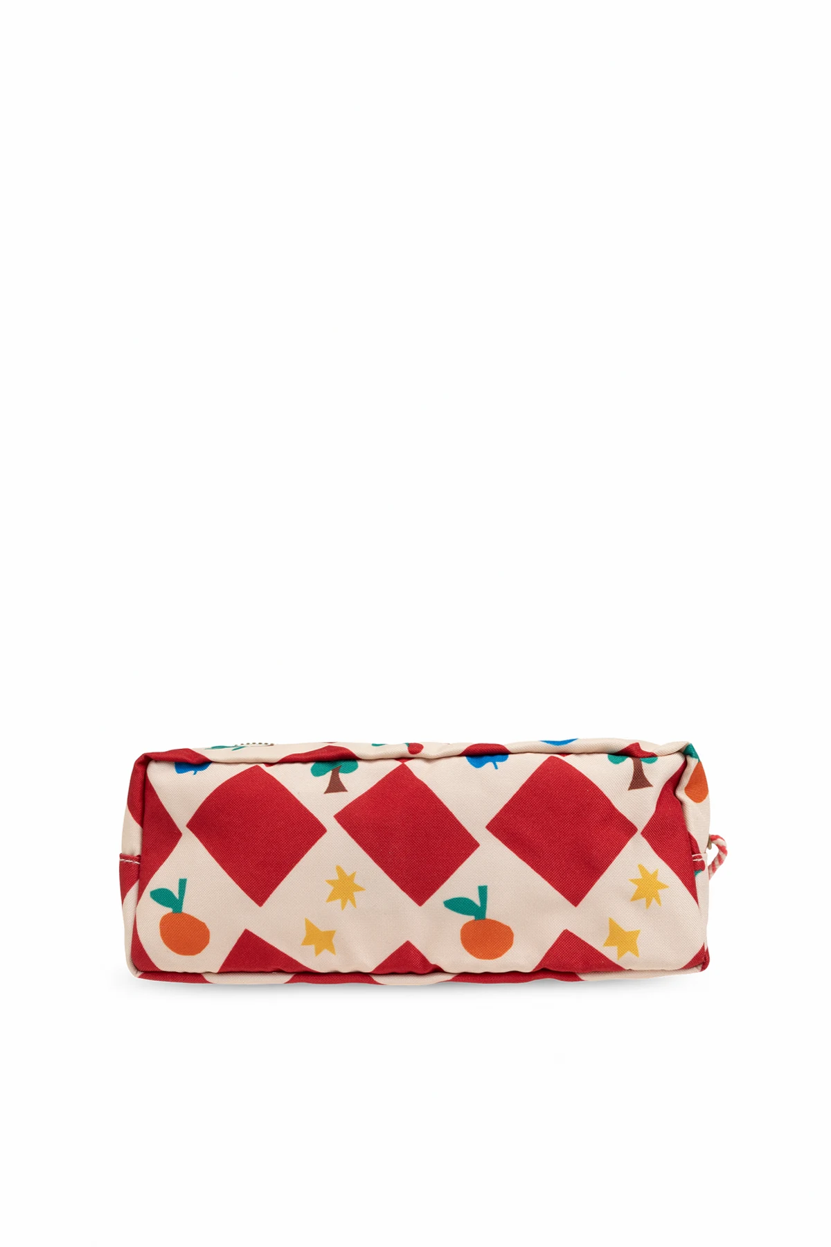 Hergestellt aus hochwertigem Stoff, zeichnet sich das Federmäppchen durch seine Langlebigkeit und angenehme Haptik aus. Auf den roten Rauten befinden sich verschiedene grafische Elemente wie kleine Pflanzen, Orangen und Sterne, die ihm einen kindlichen Charme verleihen. Die Vorderseite ist mit der Aufschrift "BOBO CHOSES" in schwarzer Farbe verziert.