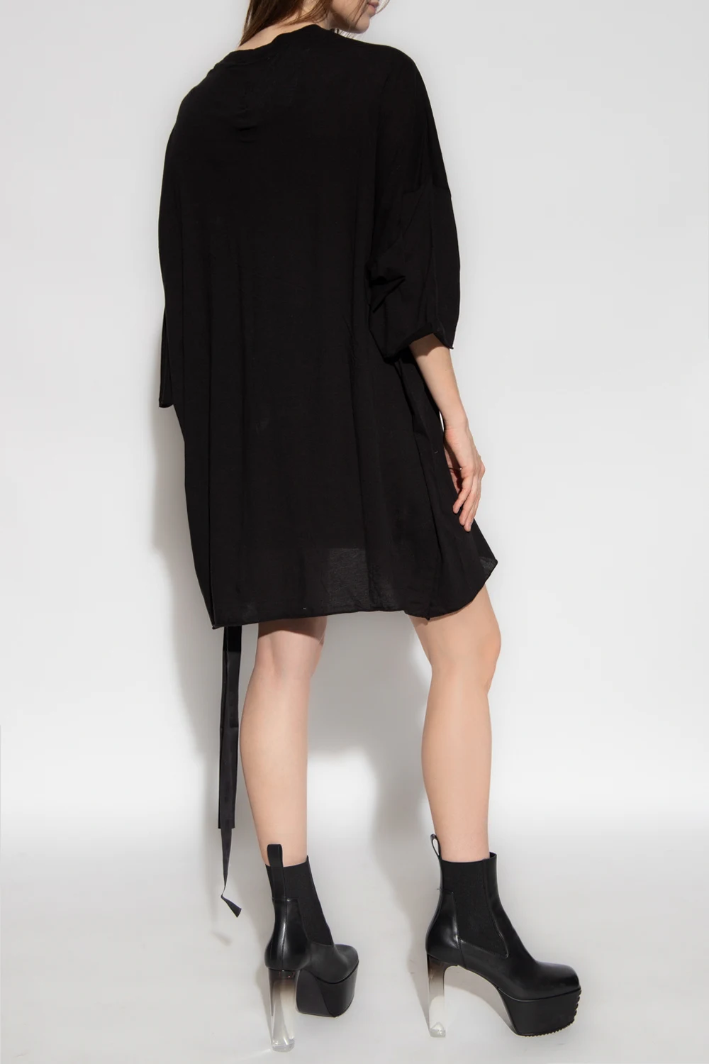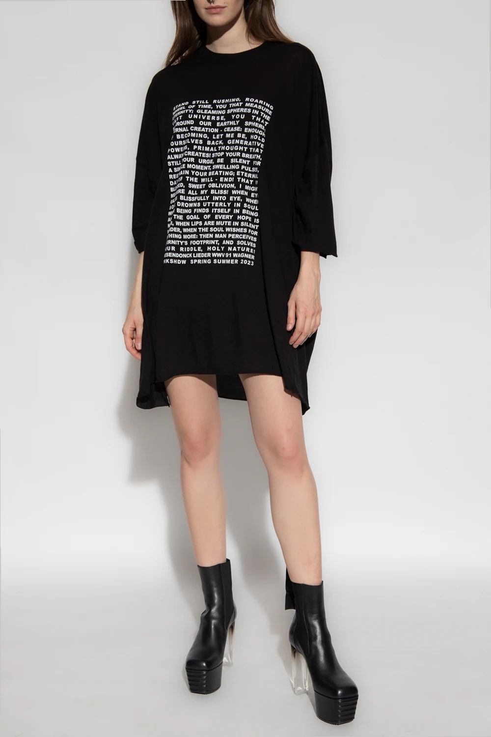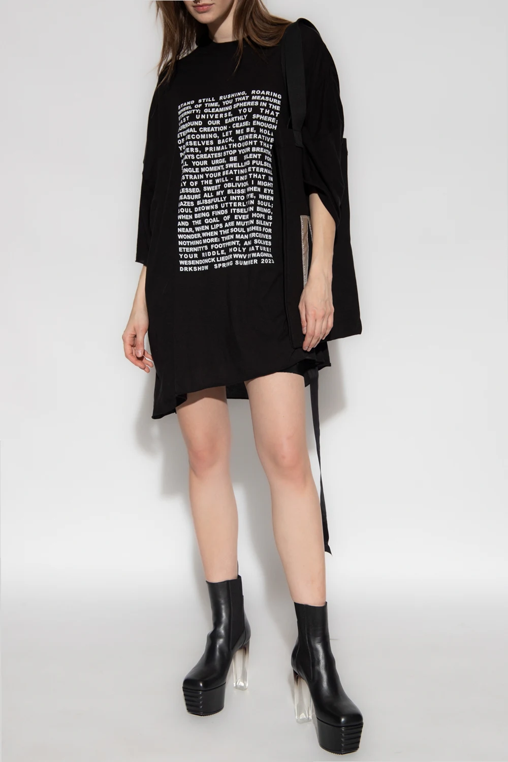 Black crewneck T-shirt from Rick Owens DRKSHDW. Crafted from semi-sheer cotton, this style features a white graphic print on the front, a logo tag on the hem and frayed trims on the short sleeves and bottom.