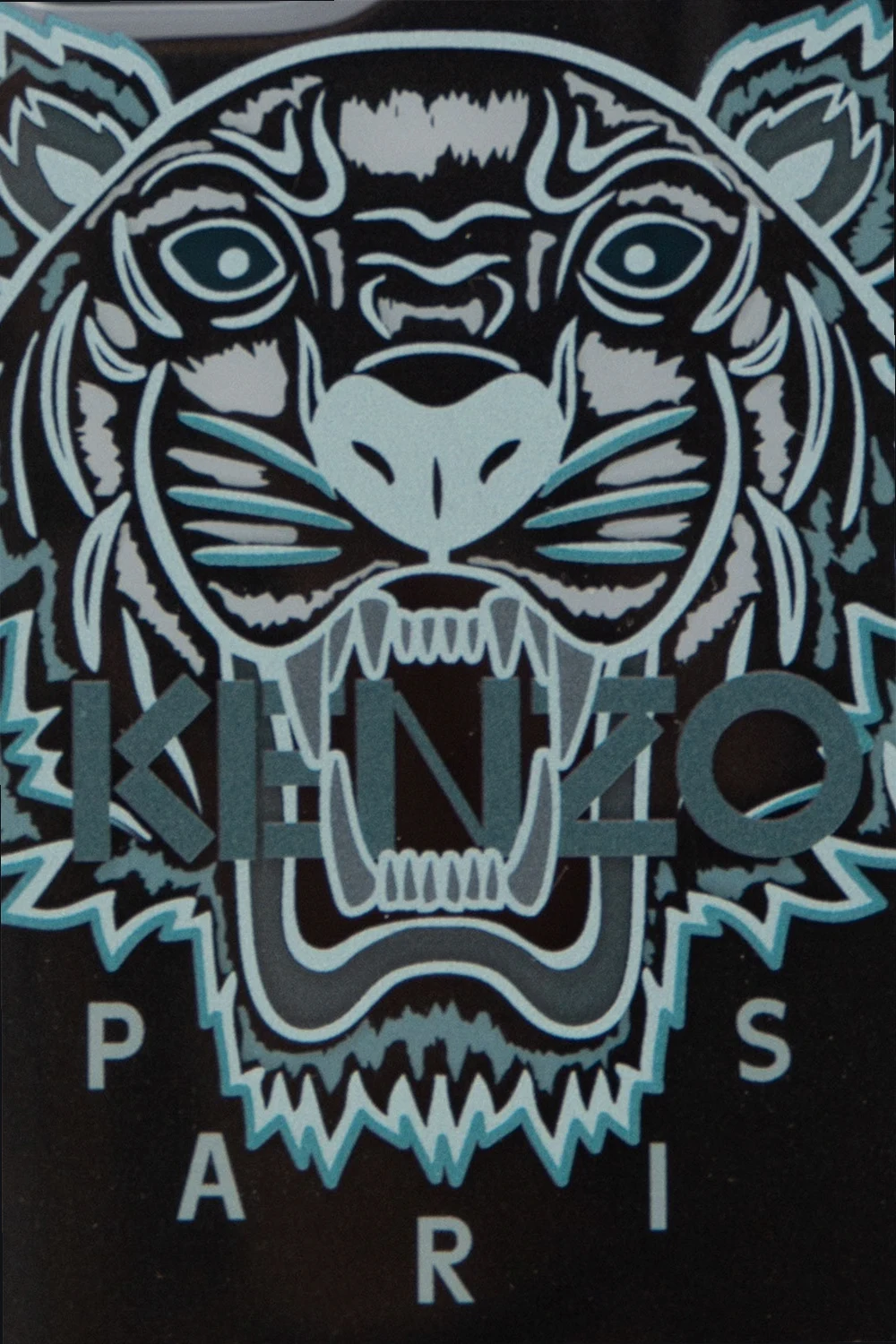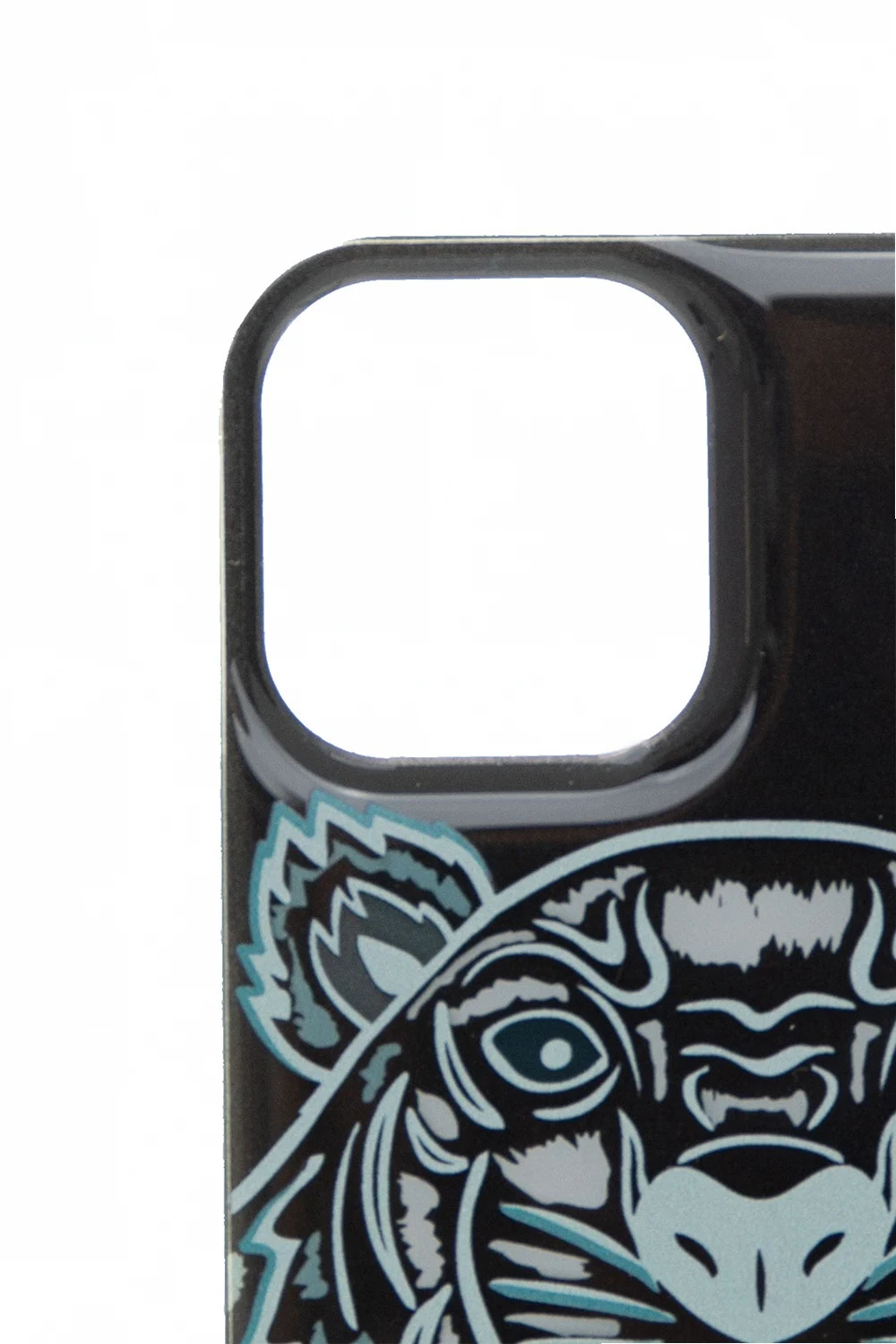 Black, transparent iPhone 11 Pro case from Kenzo featuring a tiger head print and a logo in grey and white.
