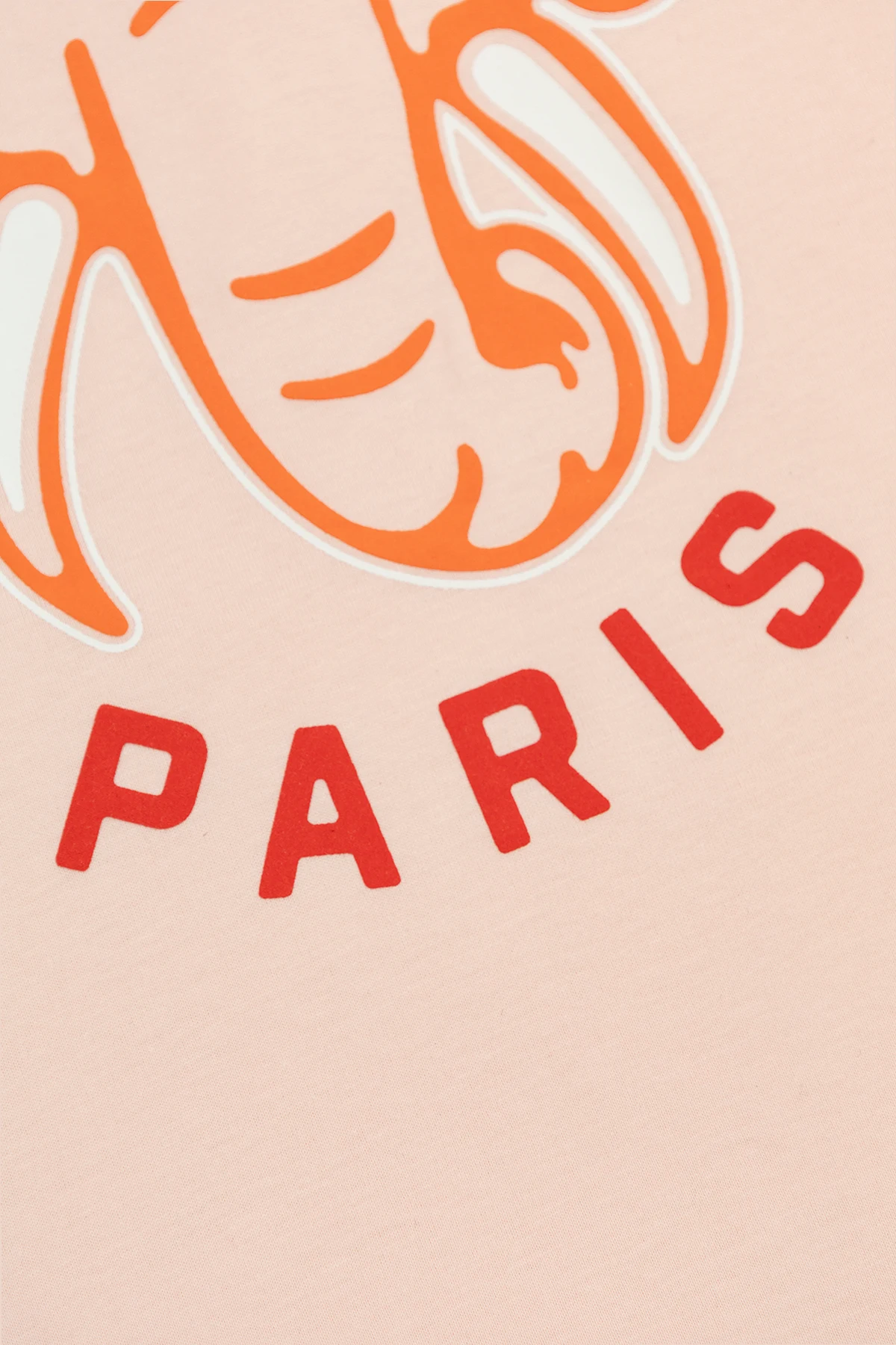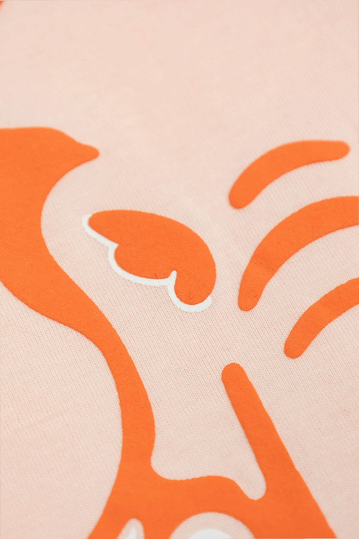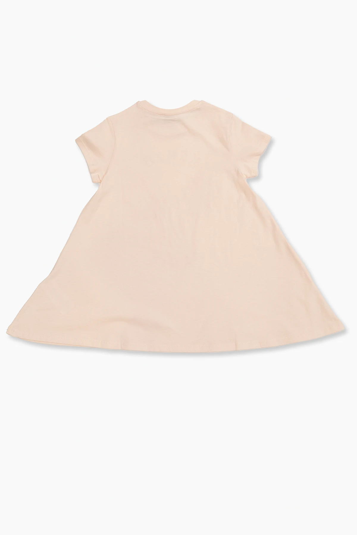Light pink dress from Kenzo Kids. Made of cotton, this style showcases an orange and white graphic print with a motif of an elephant head accompanied by a red logo on the front, short sleeves, ribbing on the round neck and a flared hem.