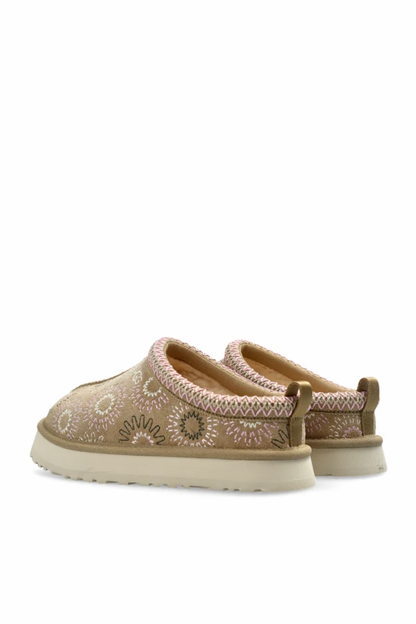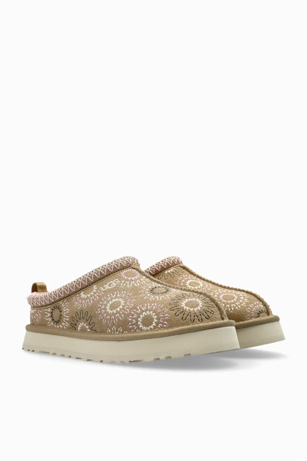 Die Pantoletten TAZZ SUN STITCH begeistern mit subtiler Eleganz, die speziell auf junge, anspruchsvolle Kundinnen und Kunden zugeschnitten ist. Das beige Wildleder des Schafts wird durch raffinierte Stickereien ergänzt – stilisierte, pastellfarbene Sonnen und Blumen verleihen dem Schuh einen originellen Charakter und einen fröhlichen Akzent. Die massive, flache Sohle sowie die geschlossene Vorderpartie garantieren Stabilität und Komfort bei täglichem Tragen.