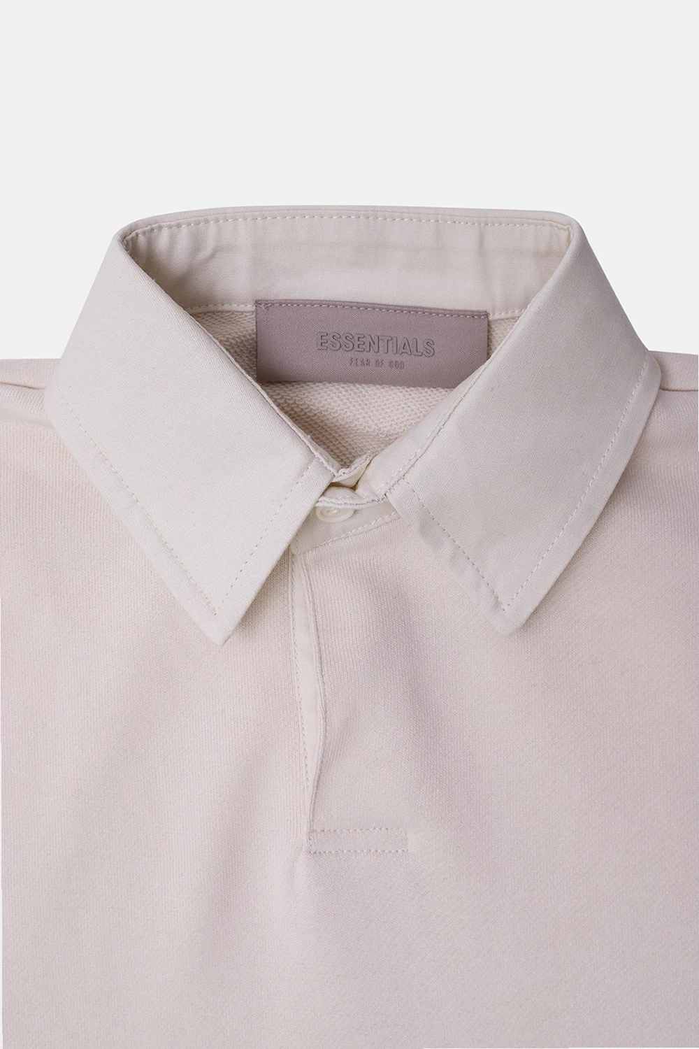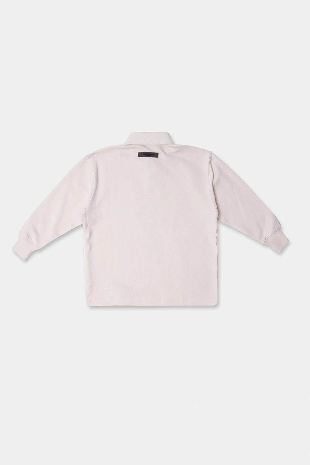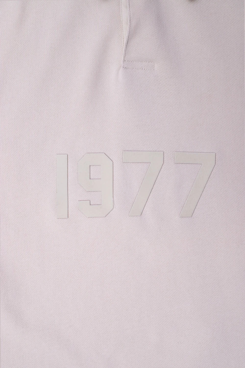 Cream polo sweatshirt from Fear Of God Essentials Kids. Crafted from cotton, this style features a ‘1977’ print accompanied by a logo patch, a button closure, long sleeves and an elasticated bottom hem and cuffs.