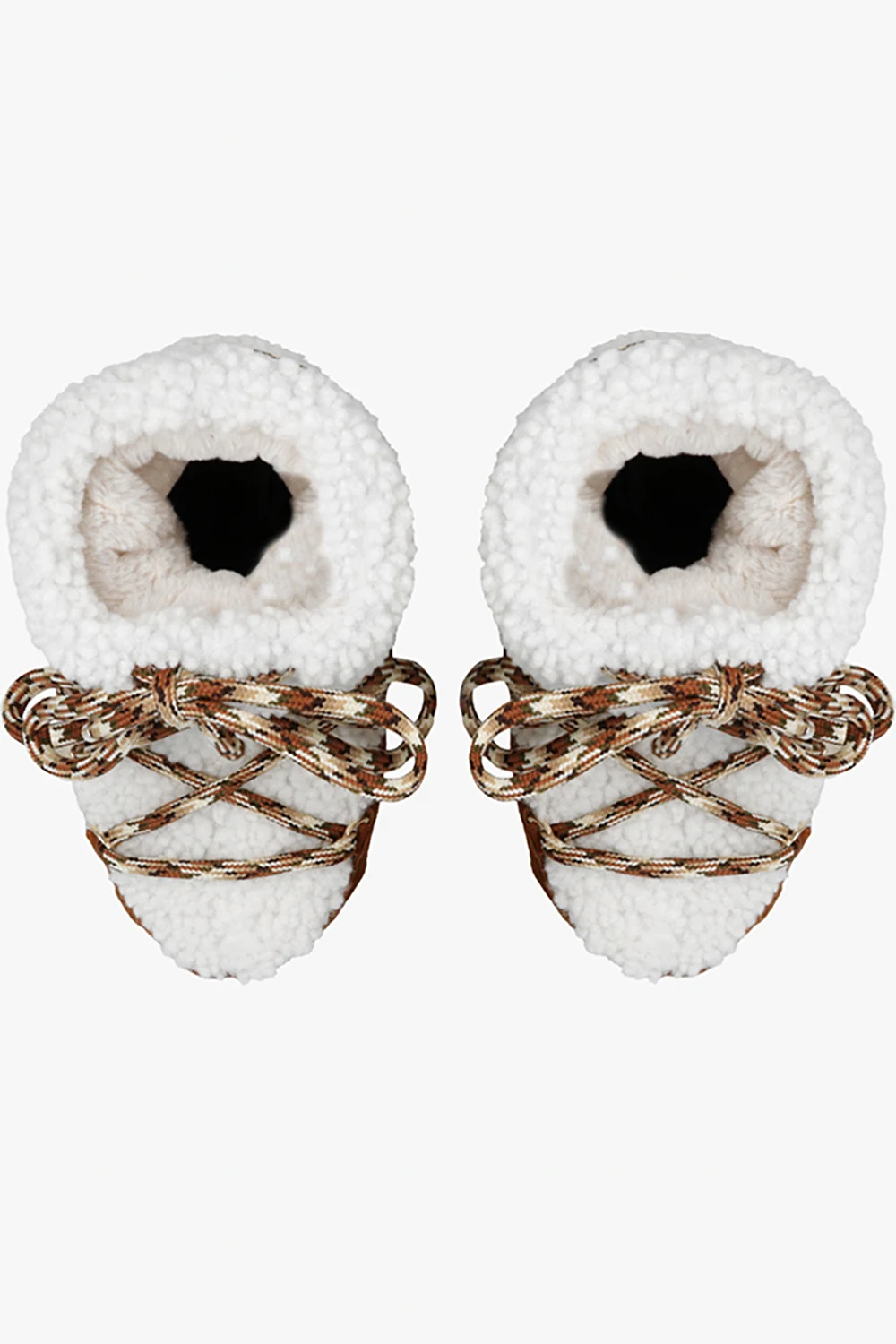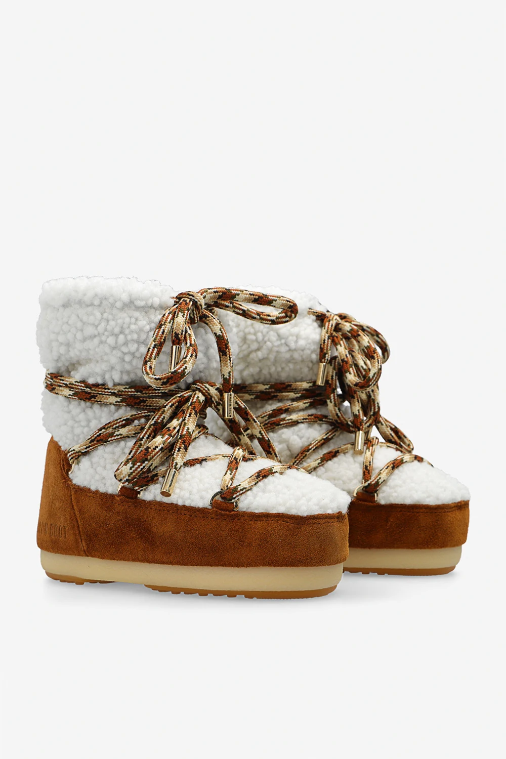 Brown and white ‘Light Low’ snow boots from Moon Boot. Crafted from suede and trimmed with white fur, this lace-up model sits on a beige and cream rubber sole and features patterned laces and gold-tone metal details.