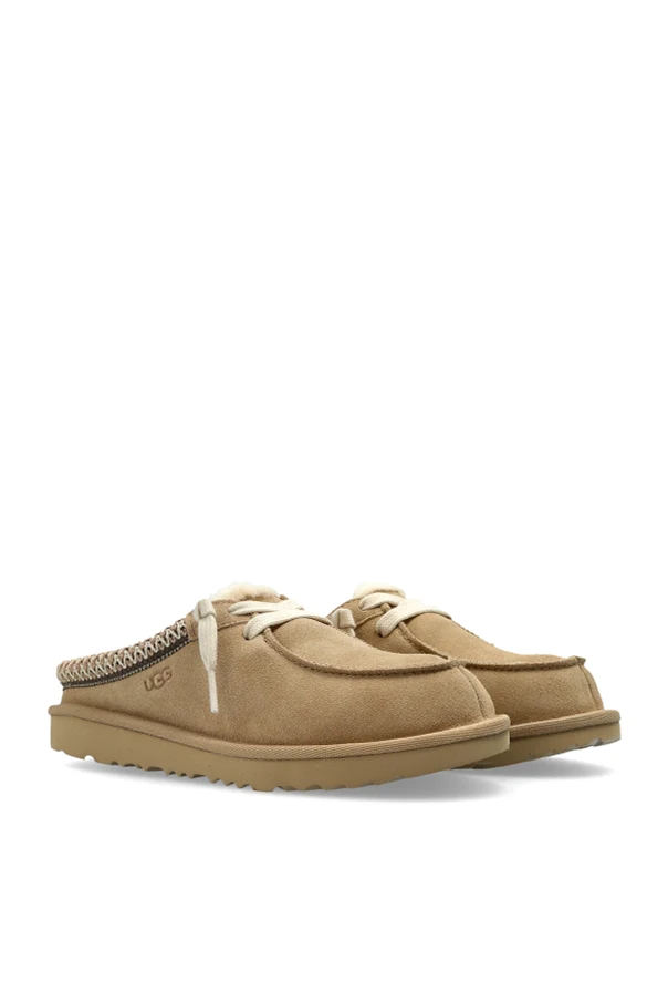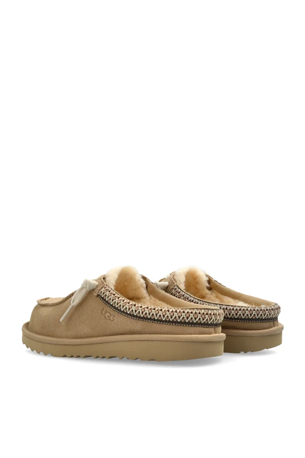 TASMAN MULE Schuhe sind ein raffiniertes Angebot der Marke UGG Kids, präsentiert in einer eleganten Version aus beigem Veloursleder. Das Modell im Mule-Stil – zum einfachen Hineinschlüpfen, mit offener Ferse und abgerundeter Zehenpartie – zeigt sich äußerst stilvoll und bietet zugleich Schnelligkeit sowie einfaches Anziehen.