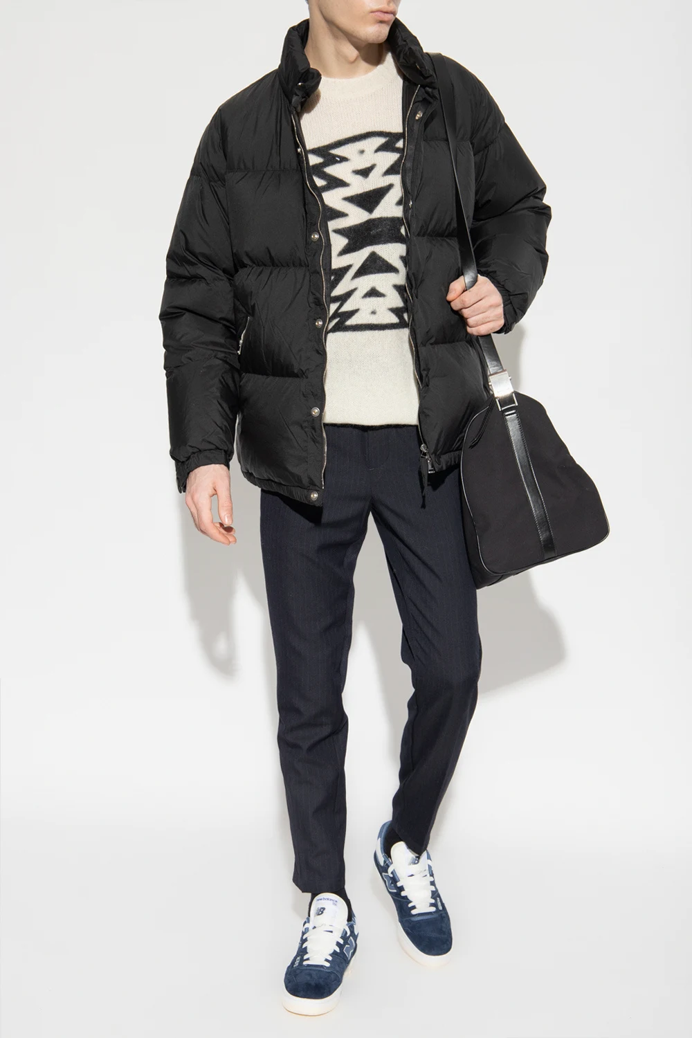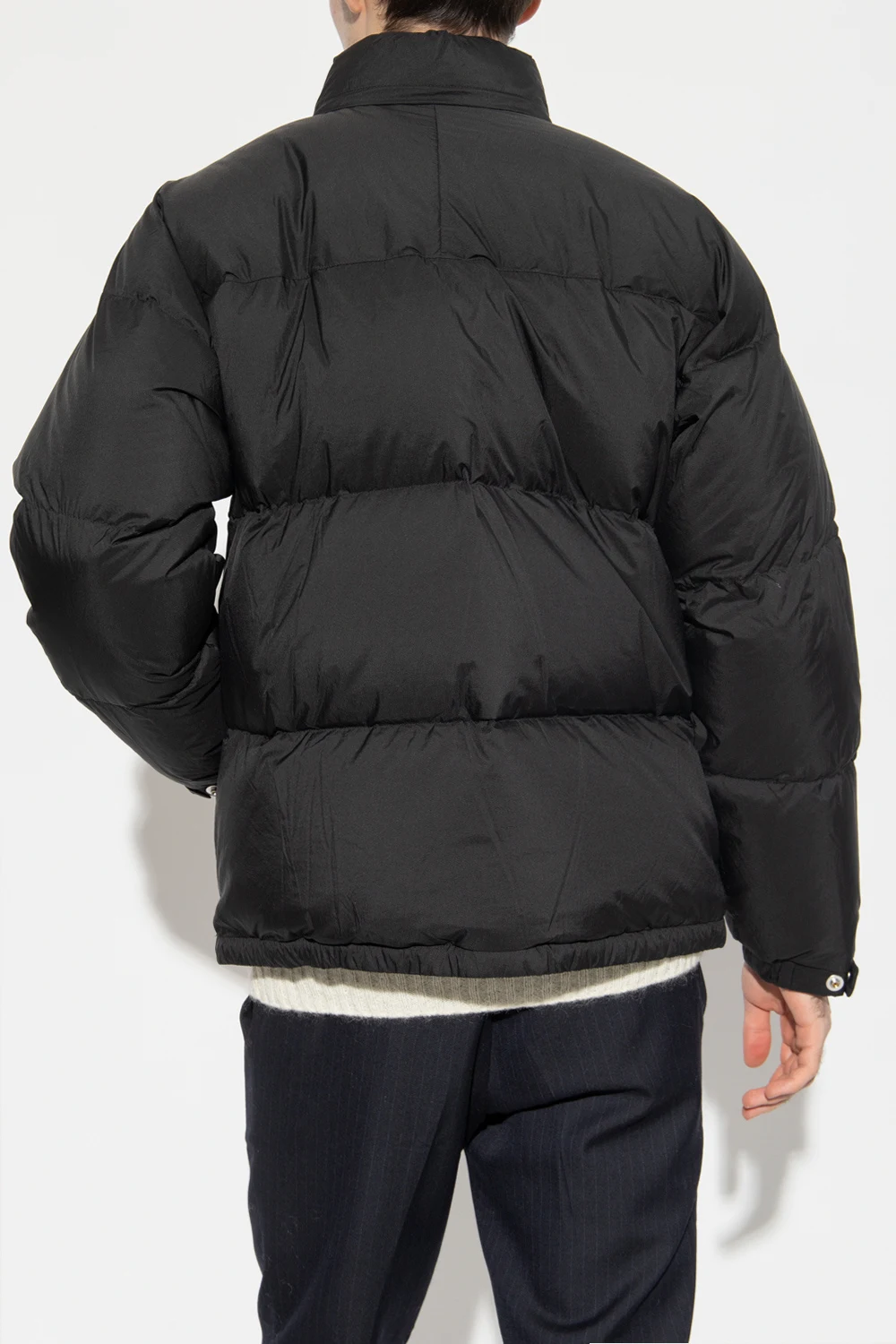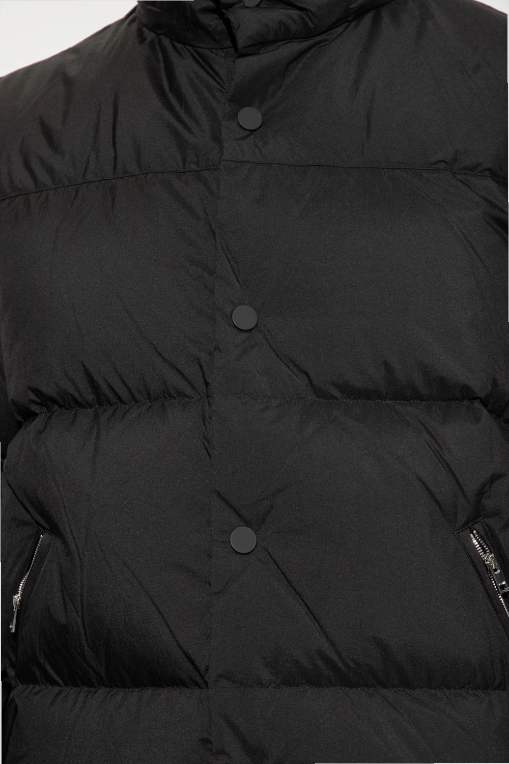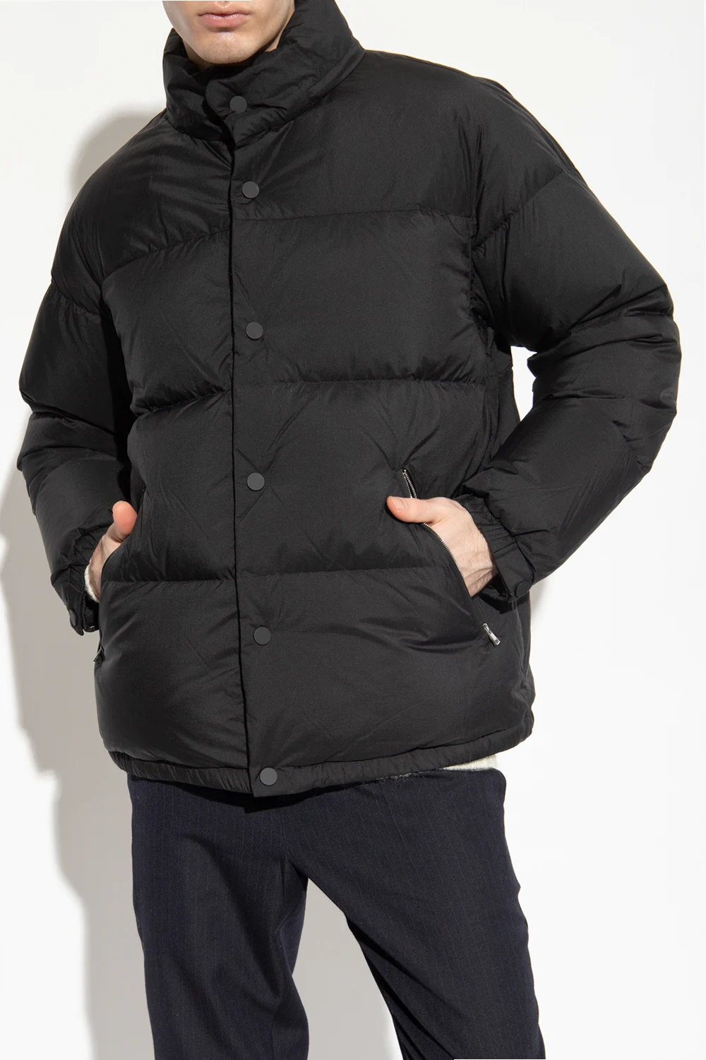 Black quilted down jacket from Theory. Fastened with a two-way zipper and snaps, this style features a concealed hood in the standing collar, two zip pockets, a drawcord-adjustable hem and long sleeves with elasticated cuffs and snap closures.