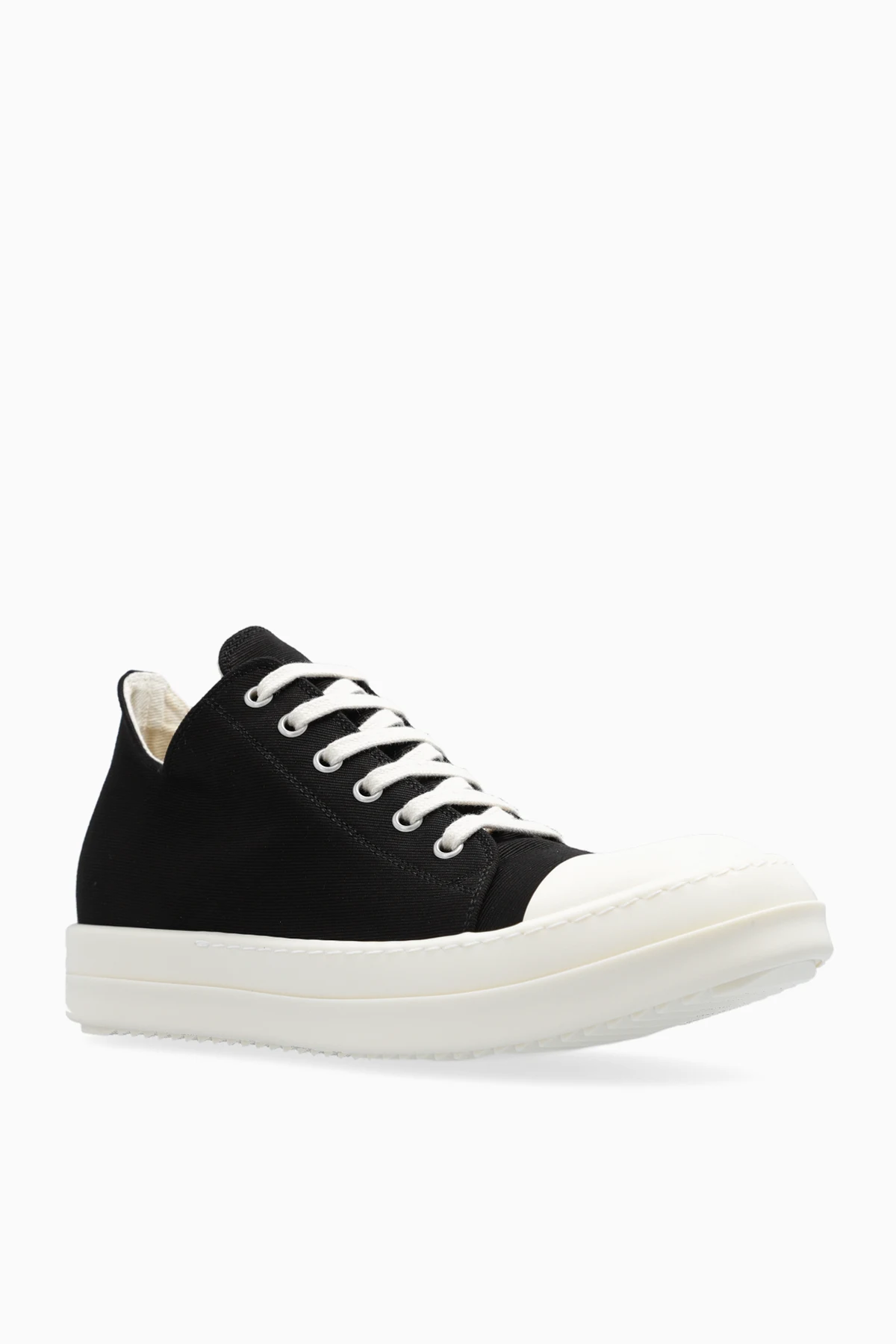 Black and white ‘Lido Low’ sneakers from Rick Owens DRKSHDW. Made of fabric, this lace-up pair features a rounded toe and a white rubber sole.