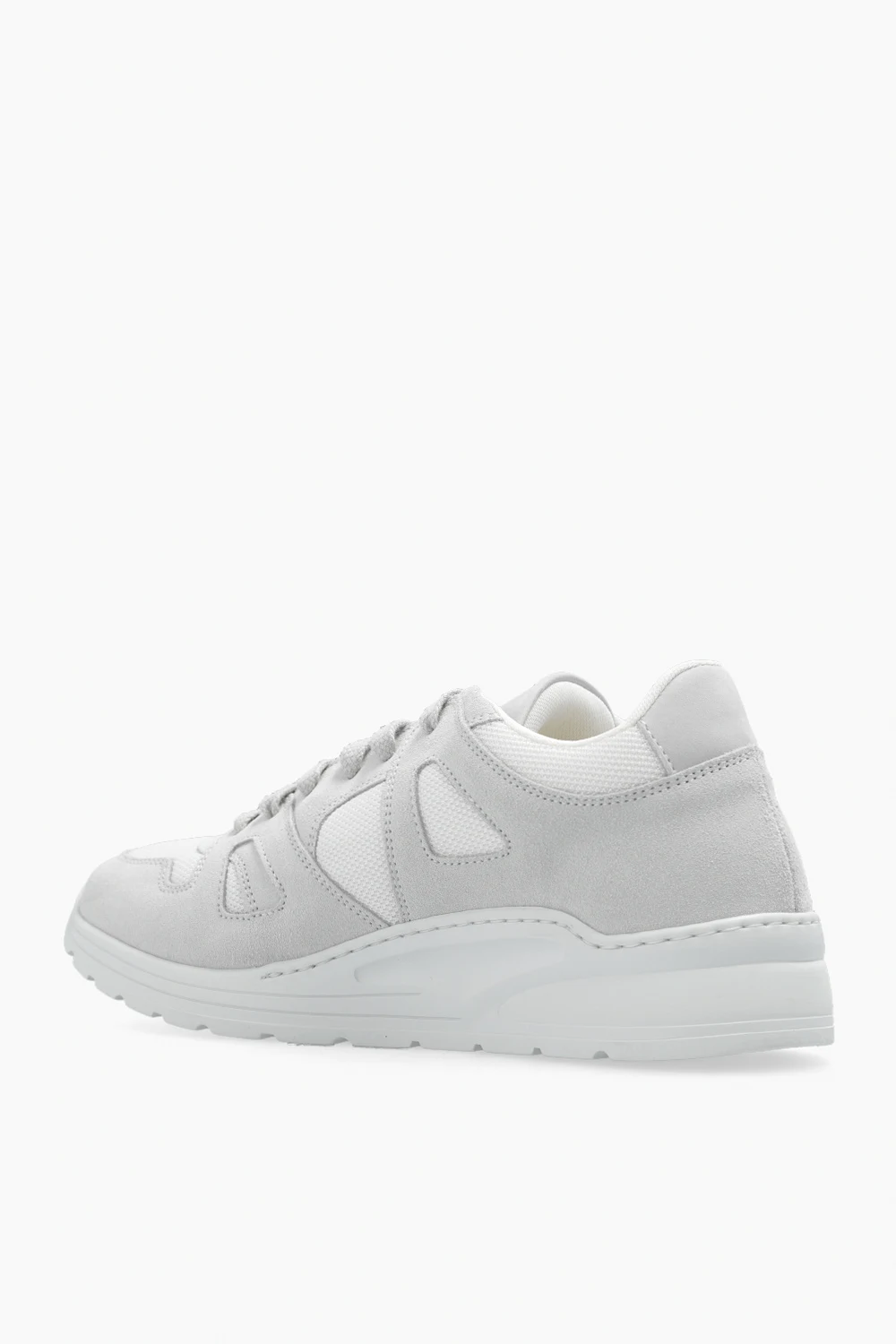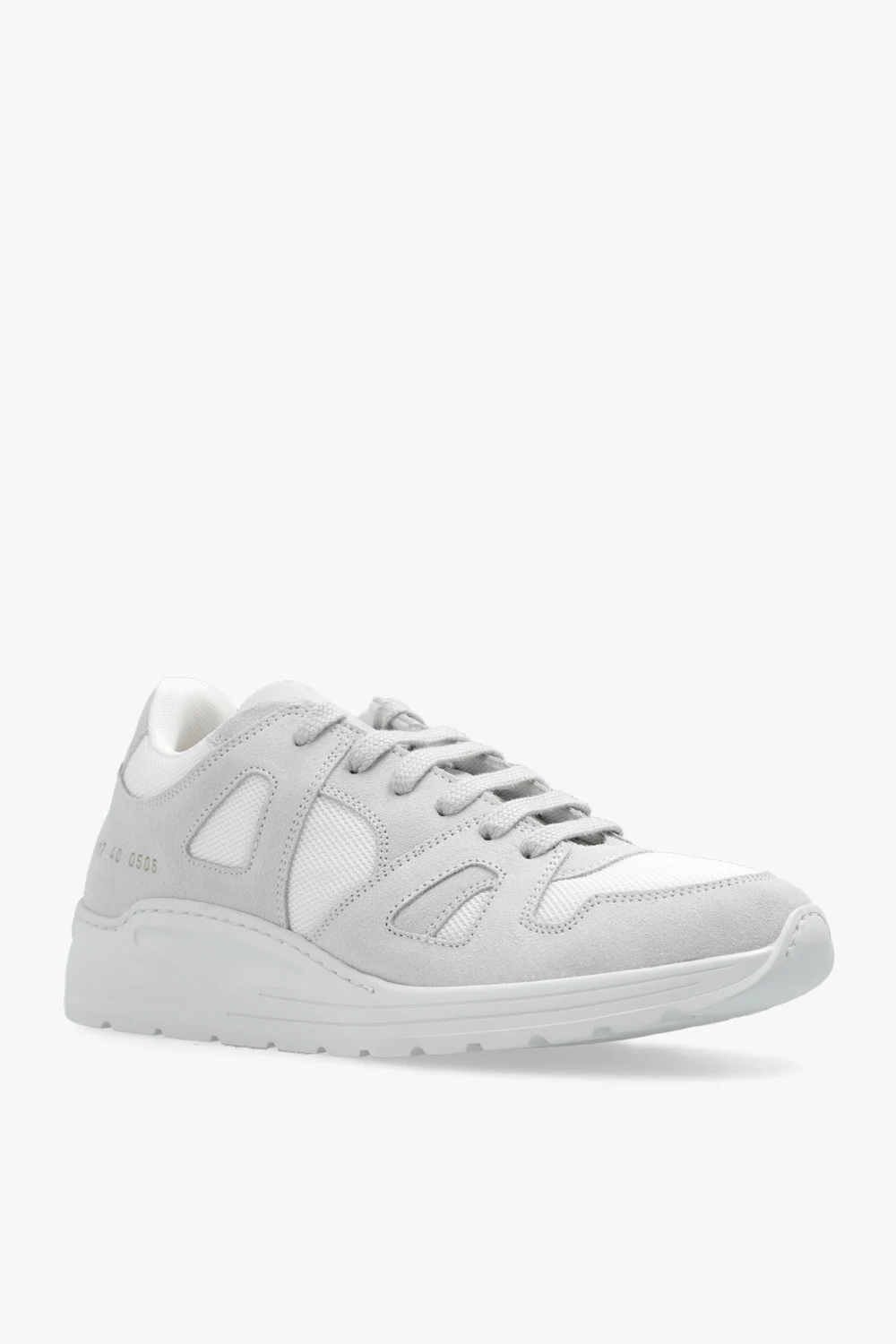 White ‘Cross Trainer’ sneakers from Common Projects. Crafted from suede and fabric, this lace-up model sits on a white rubber sole and showcases a signature gold-tone serial number stamped on the side.