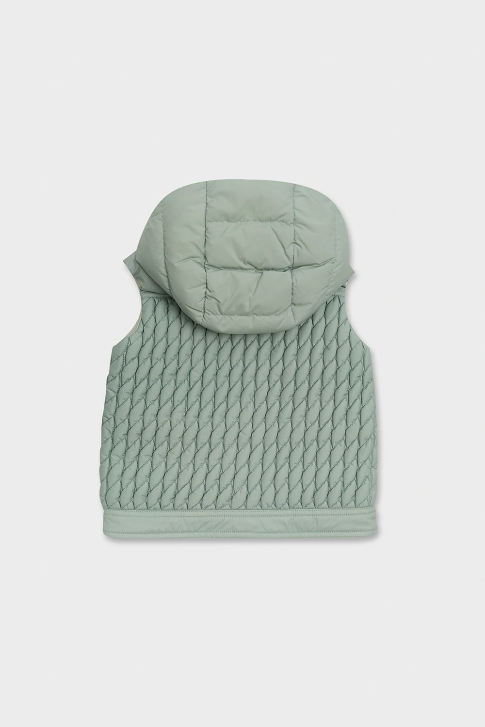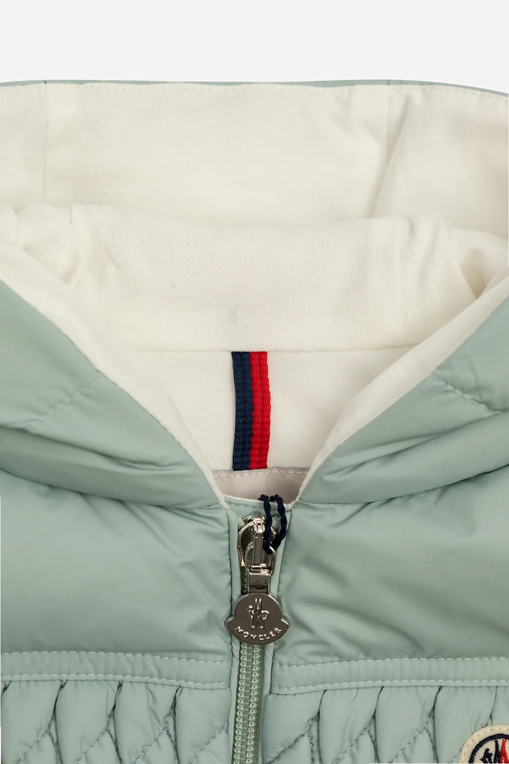 Light blue ‘Ulle’ hooded quilted vest from Moncler Kids. Fastened with a zip, this garment features a multicolored logo patch, two snap-fastened pockets, white cotton lining and down padding.