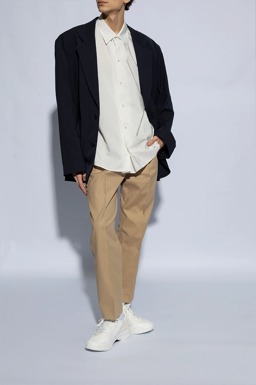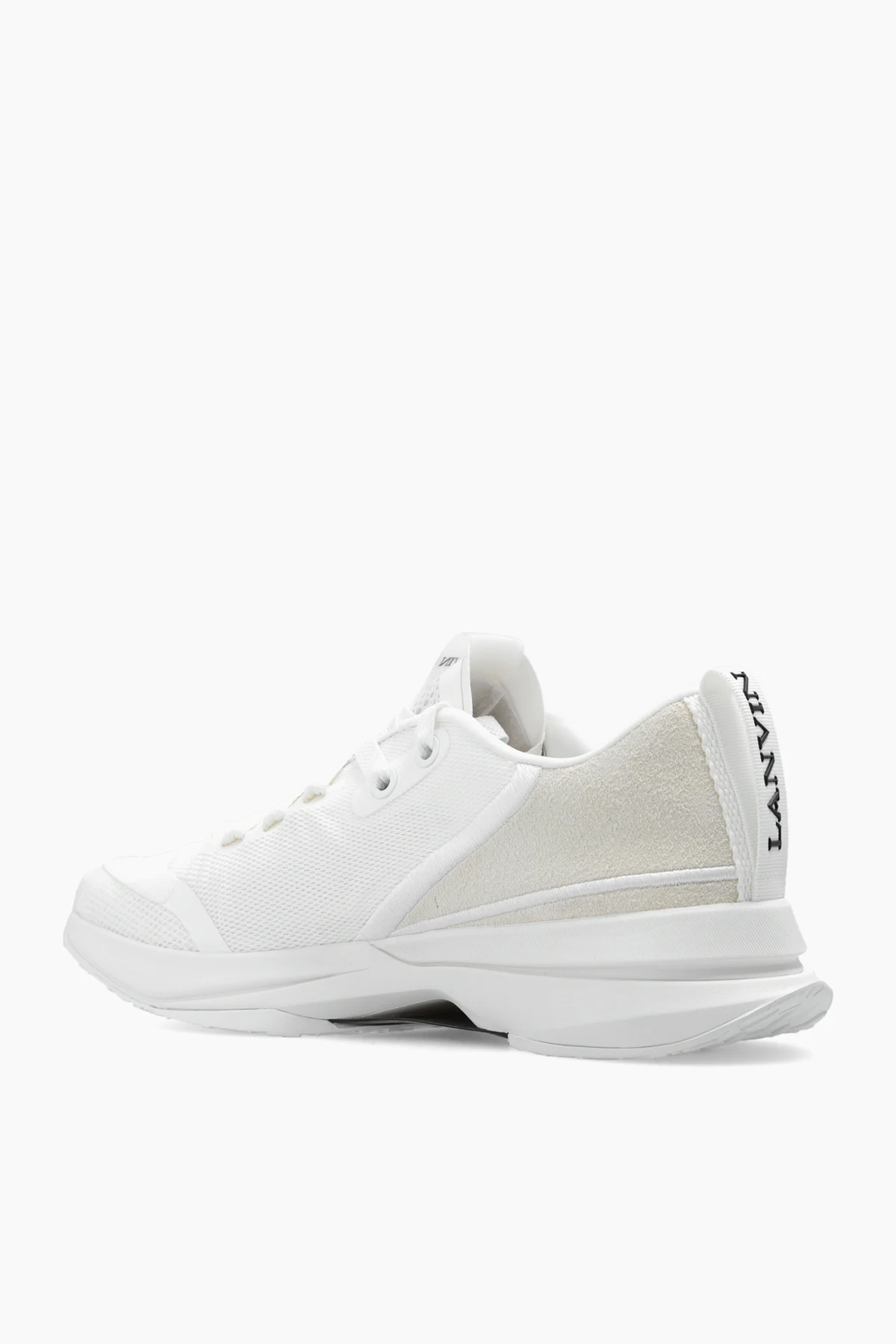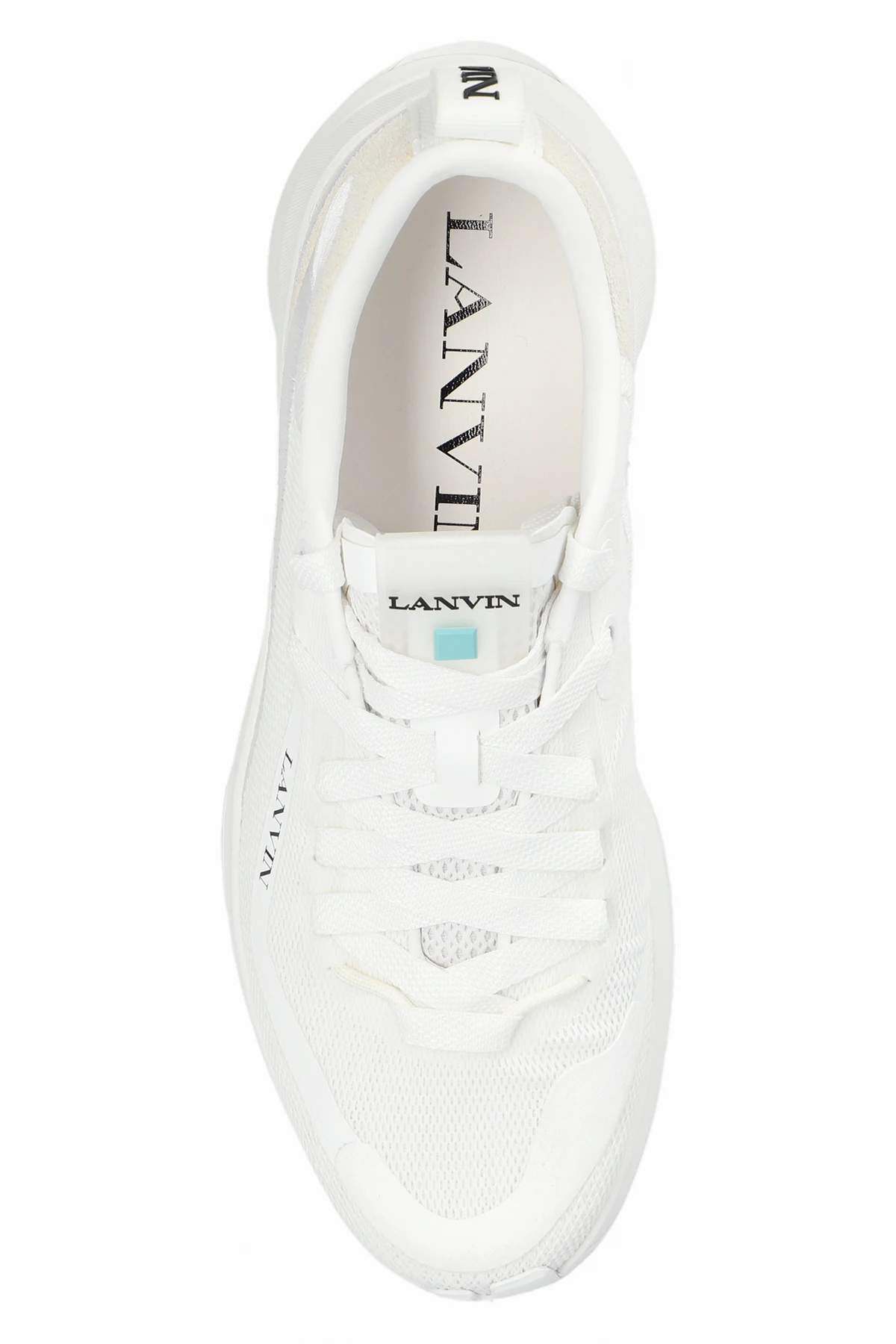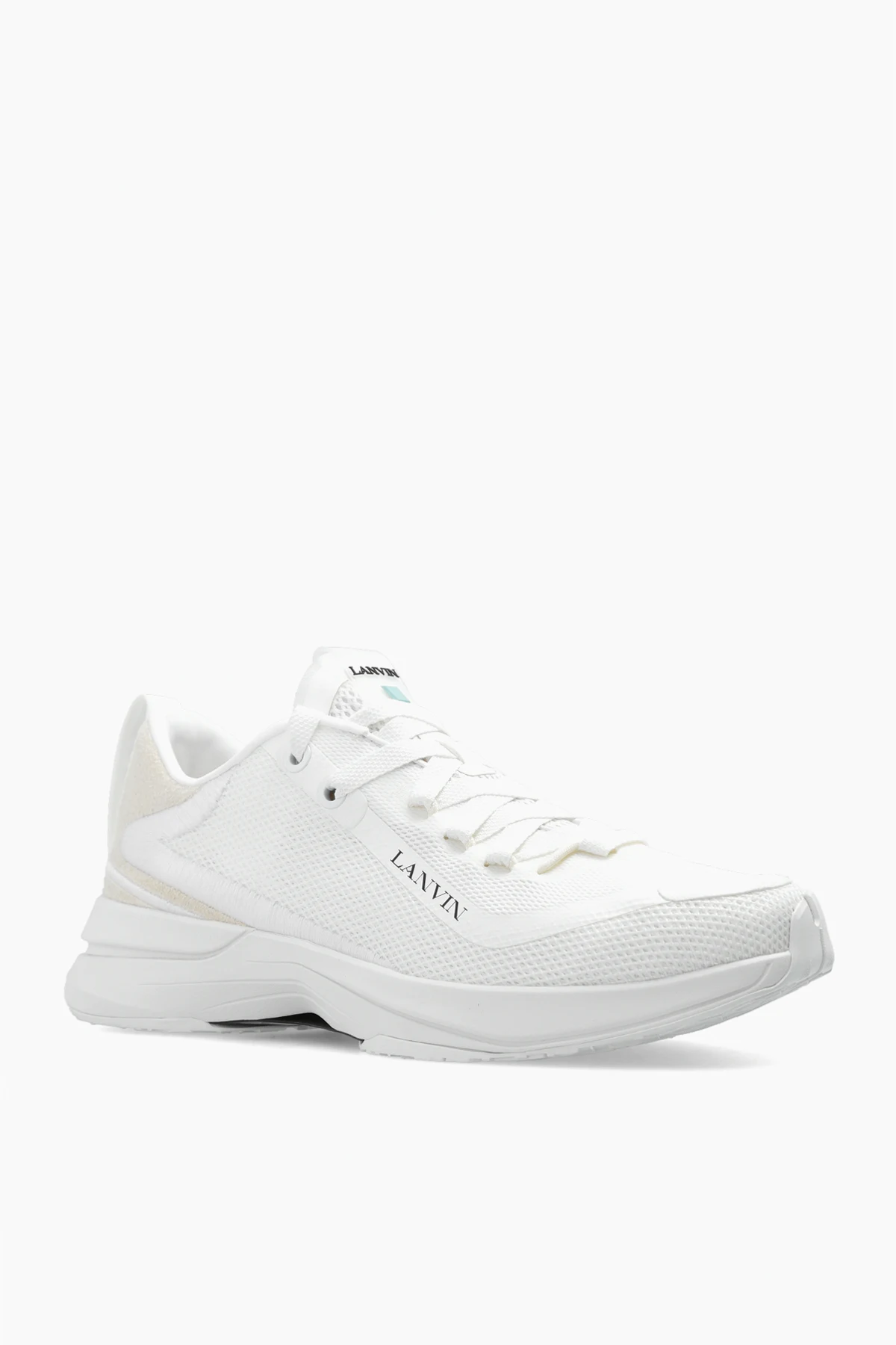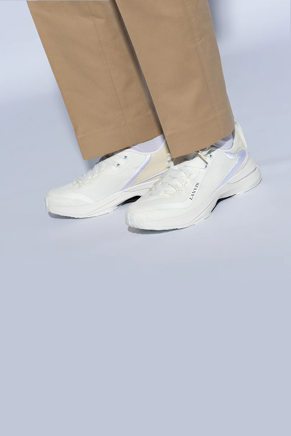White and cream ‘L-I’ sneakers from Lanvin. Made from mesh and suede overlays, this lace-up model sits on a white and black rubber sole and showcases logo patches on the tongue and back and two interchangeable insoles: mesh (perfect for sunny weather) or leather (for urban, everyday use).