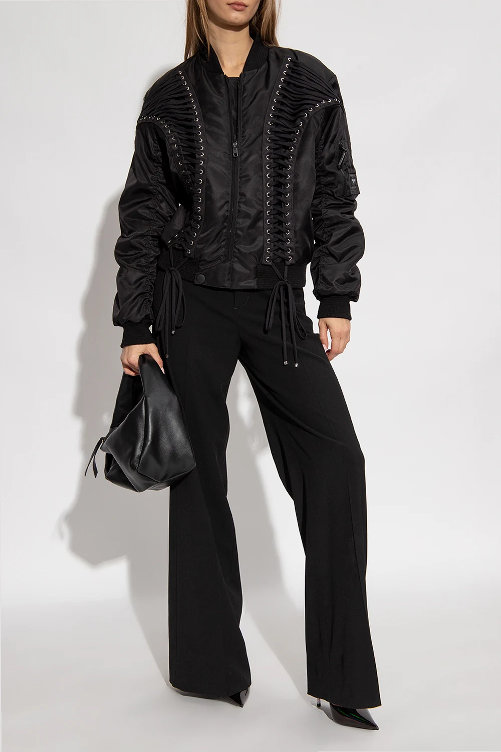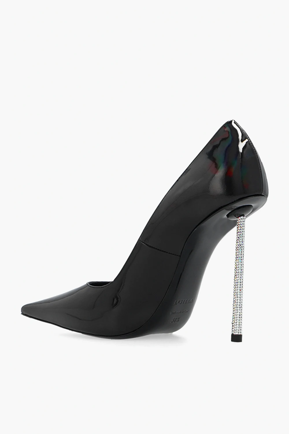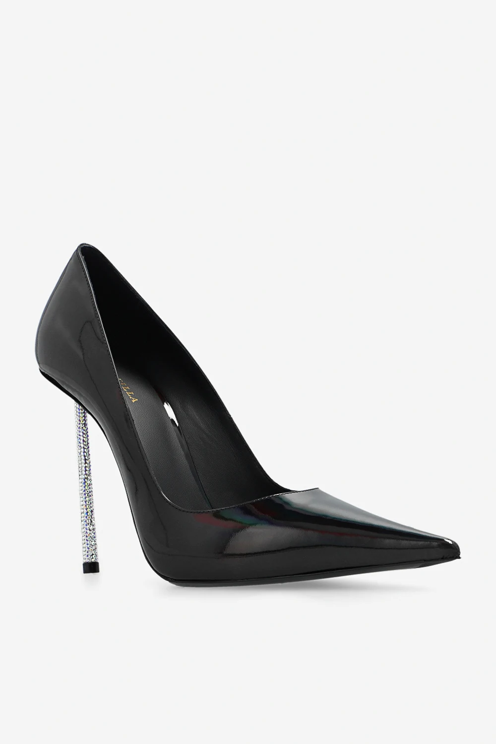 Black ‘Bella’ stiletto pumps from Le Silla. Crafted from leather with a holographical effect, this model features a pointed toe silhouette, a black sole in leather and rubber and a distinctive heel bejewelled with glossy crystals.