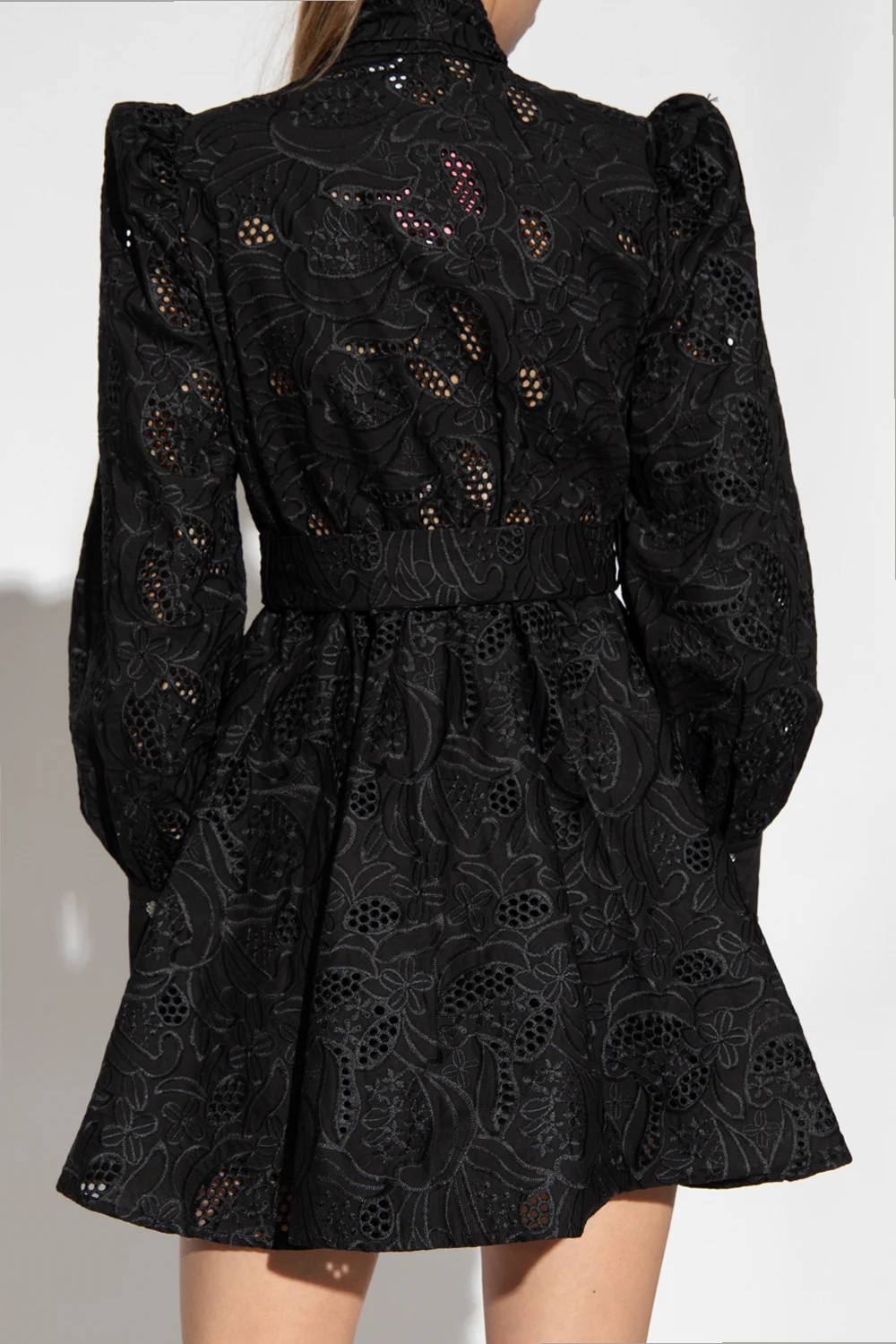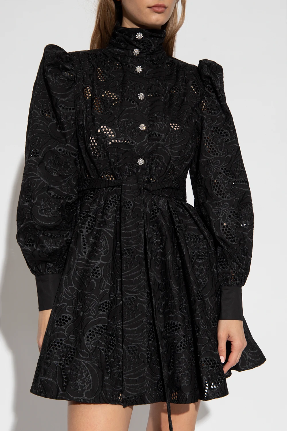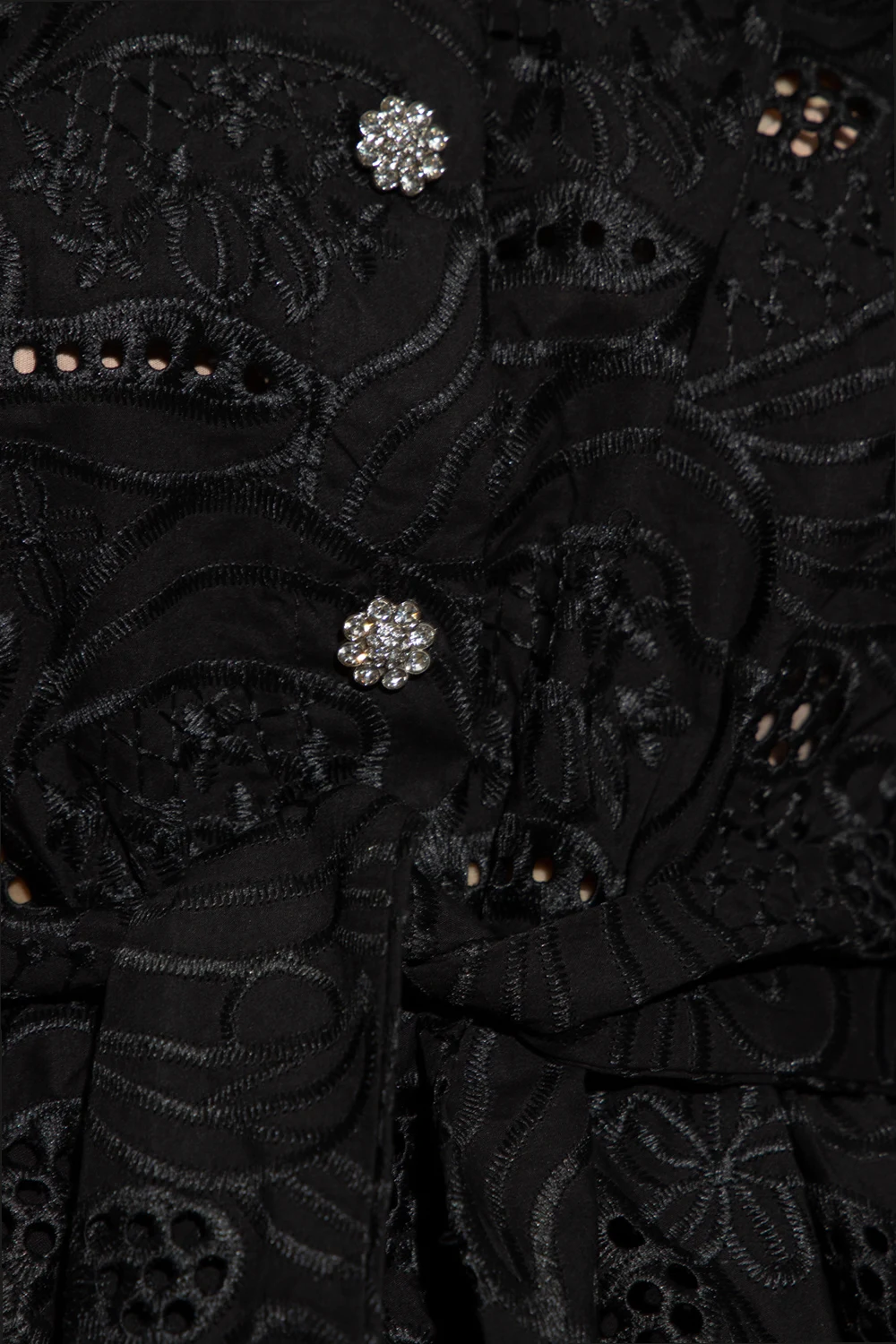 Black ‘Linnea’ openwork dress with a standing collar from Custommade. Crafted from cotton, this style features glossy buttons, a waist-cinched tie belt, padded shoulders and long sleeves with button cuffs.