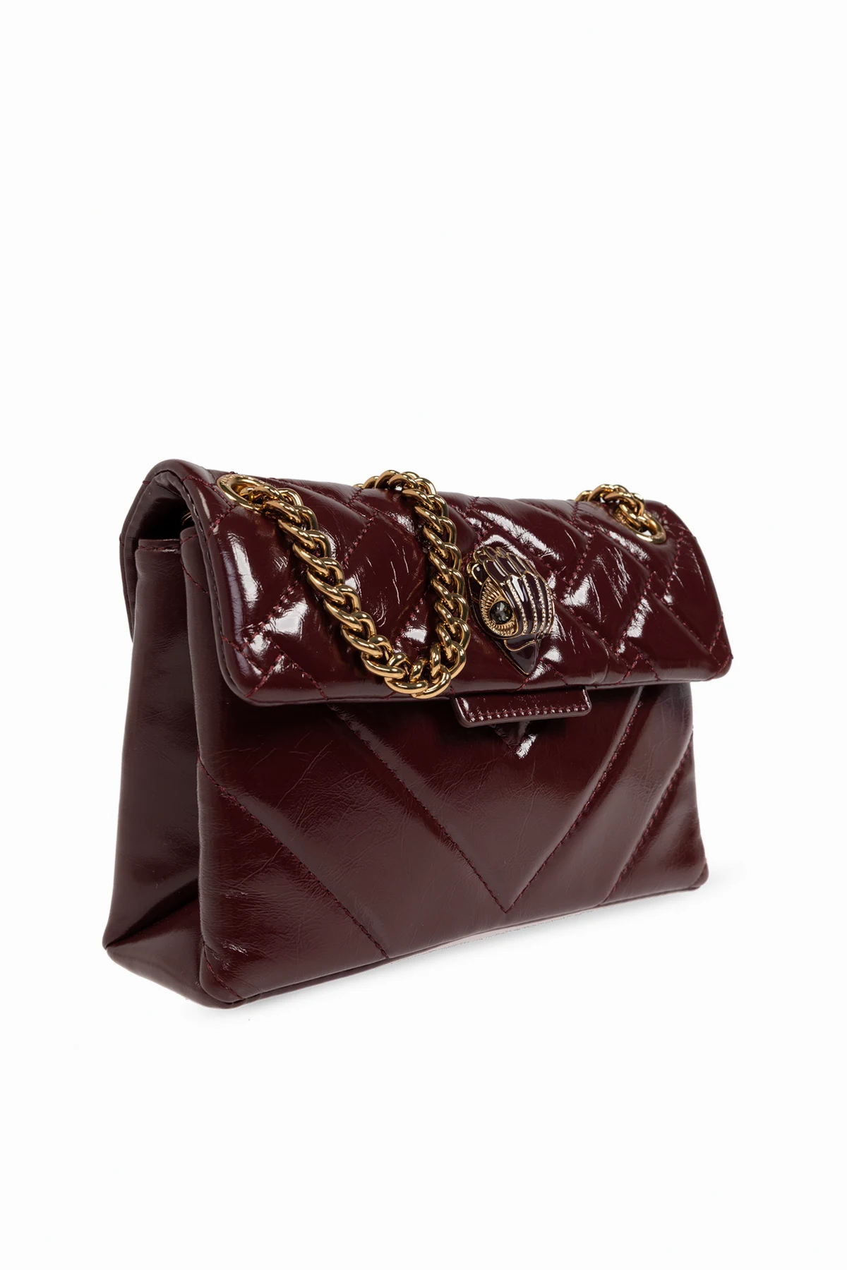 Wir präsentieren die Schultertasche Kensington Mini in tiefem Bordeaux, aus der exklusiven Kollektion des renommierten Designers Kurt Geiger. Dies ist das ideale Accessoire für besondere Anlässe, das klassisches Design mit modernen Akzenten verbindet.