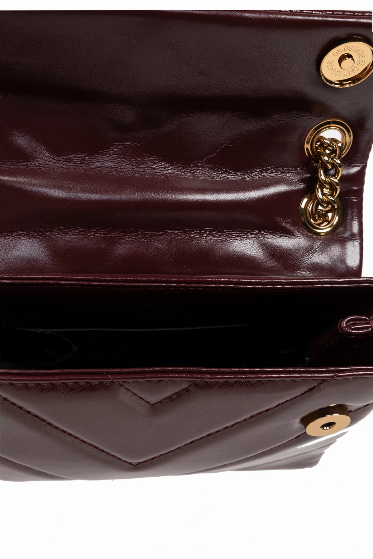 An der Vorderseite der Tasche befindet sich ein dekoratives Logo in Goldfarbe, das an eine Muschel oder ein Juwel erinnert und charakteristisch für diese Kollektion ist. Die goldene Kette, die als Schultergurt dient, ist solide und massiv, was den exklusiven Charakter des Produkts unterstreicht.