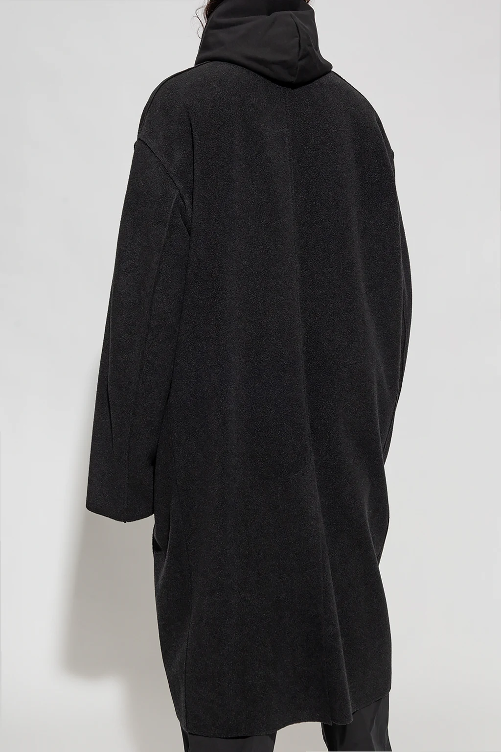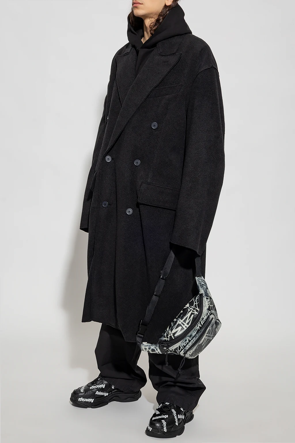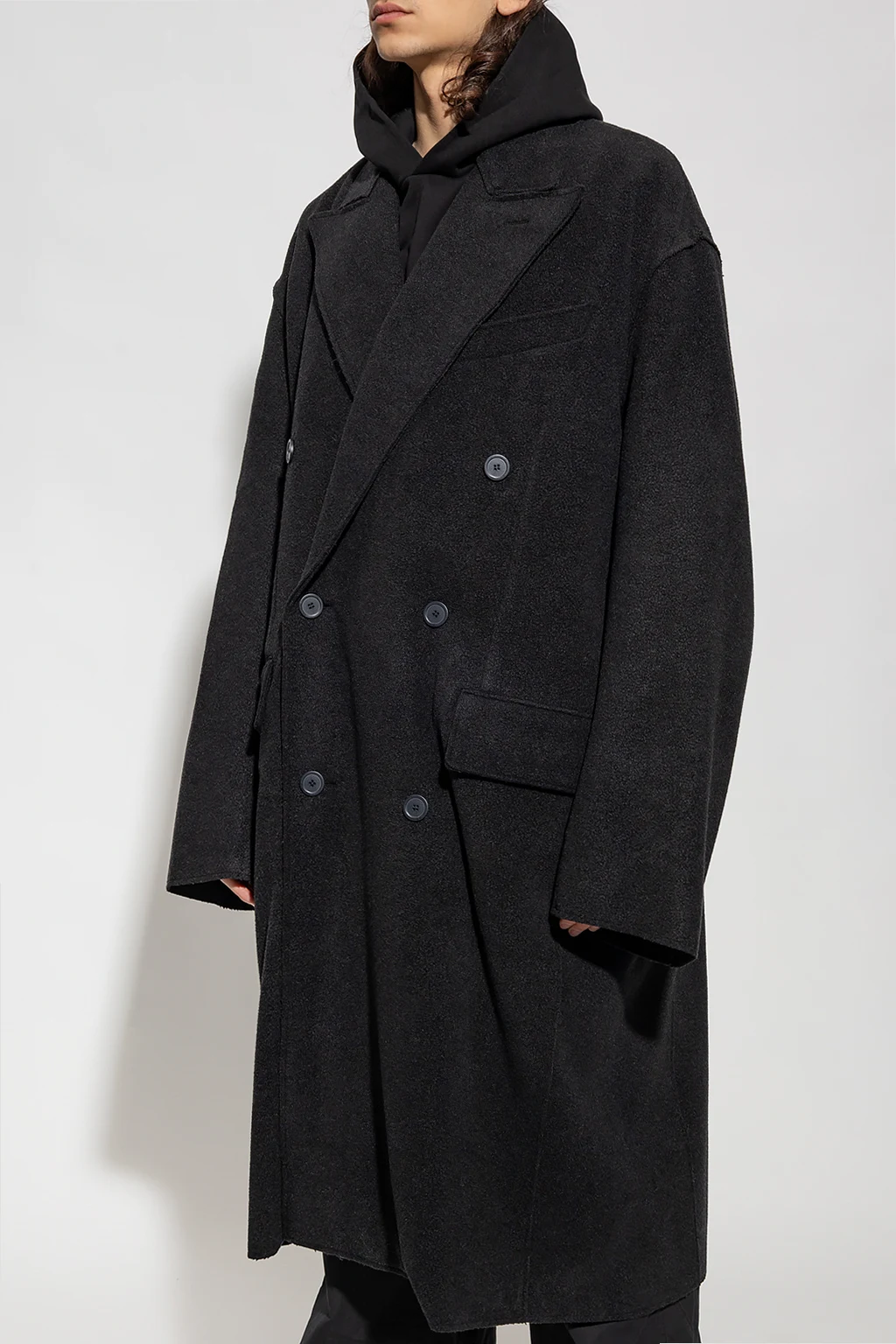 Dark grey coat from Balenciaga. Crafted from cashmere with an oversize, double-breasted silhouette, this style features button fastenings, a collar with peak lapels, one slip pocket, two flapped pockets, long sleeves and a single back vent.