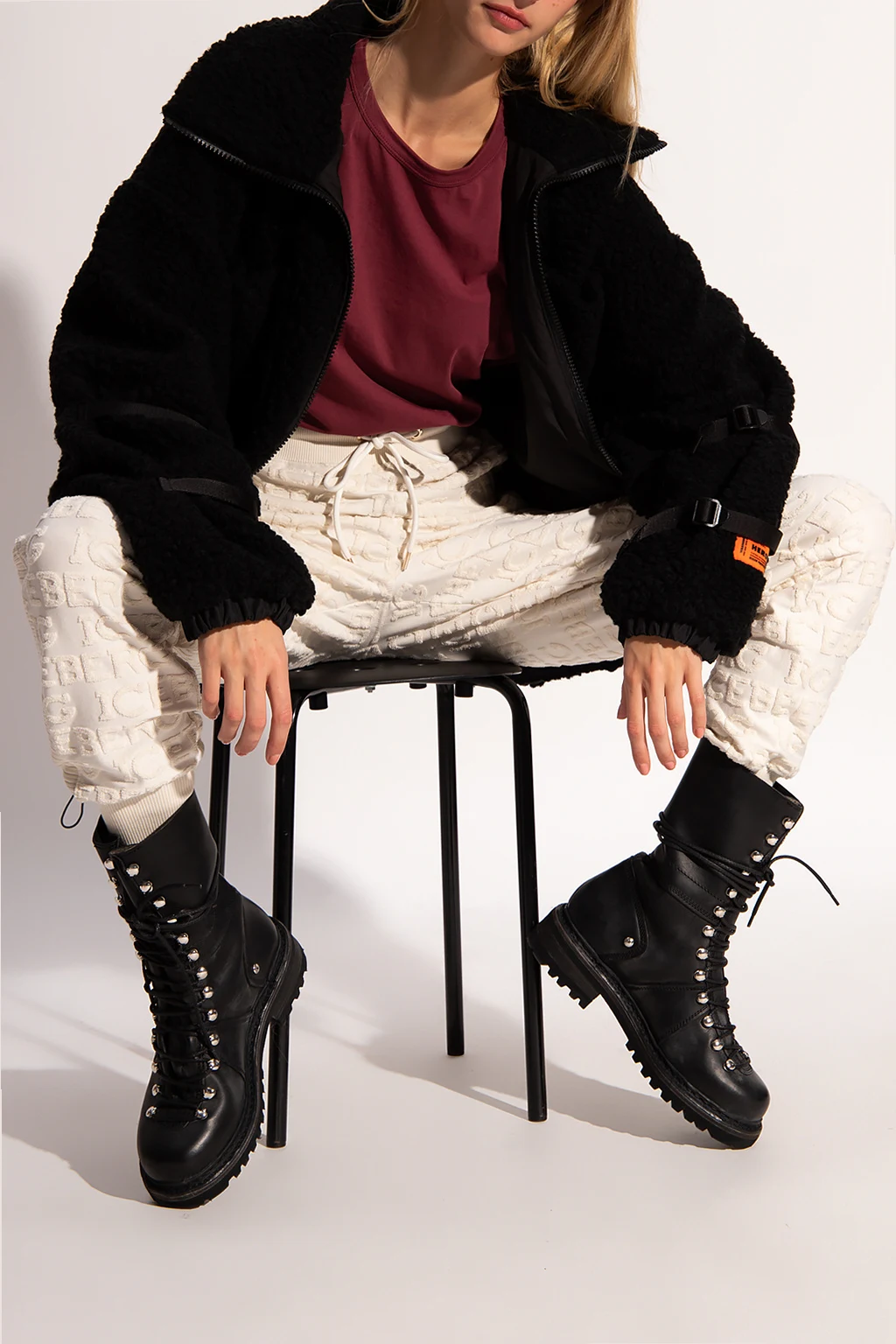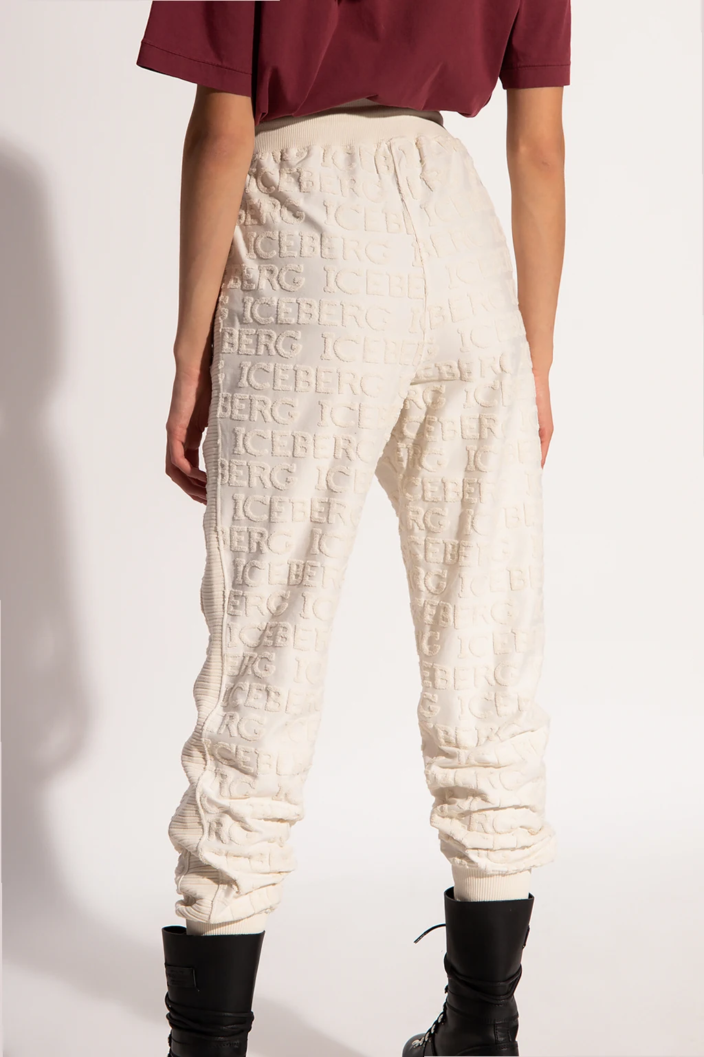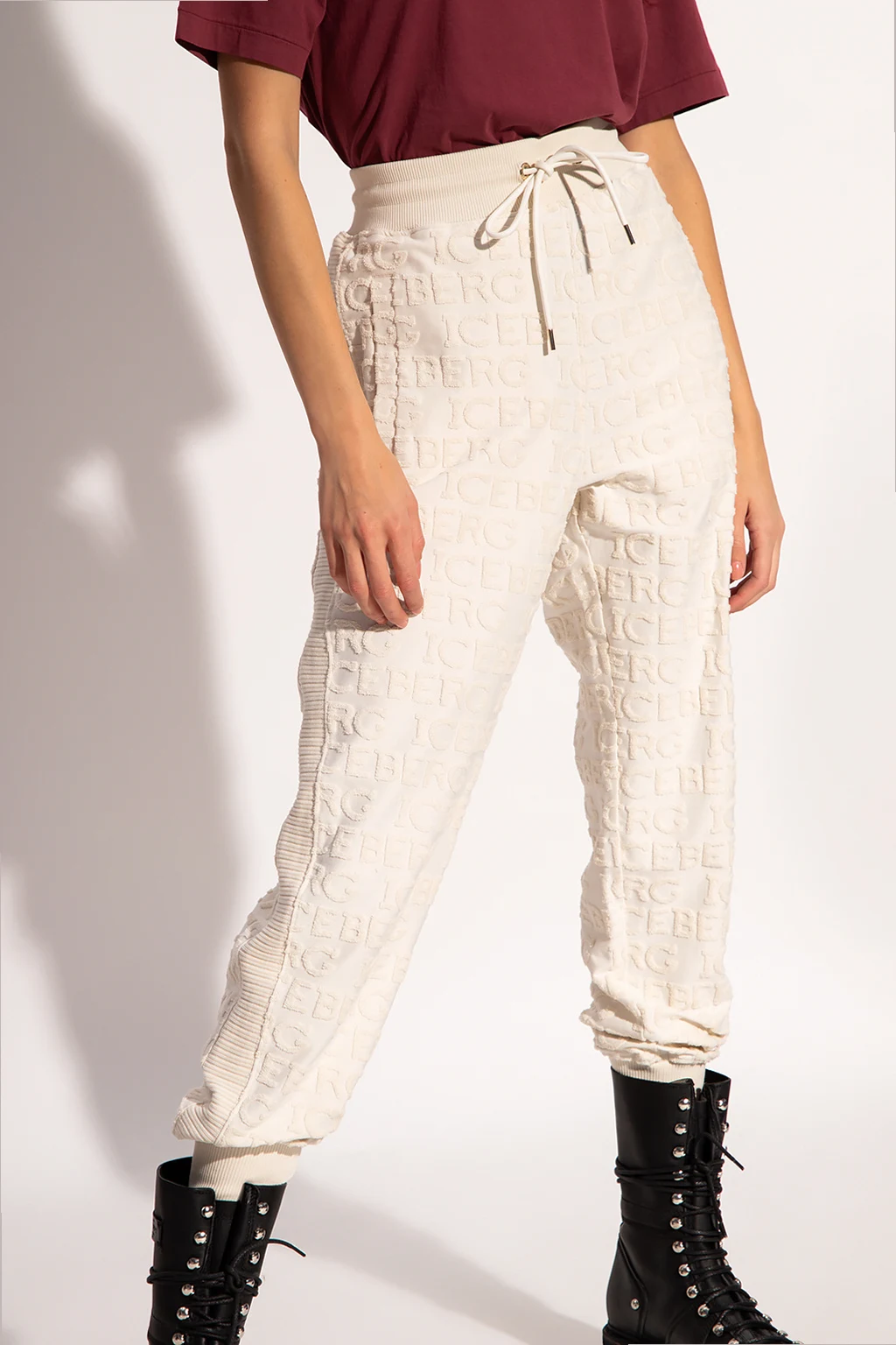 Cream sweatpants from Iceberg. Fastened with drawstrings, this design features a textured logo pattern, two front pockets, side stripes and ribbed cuffs.