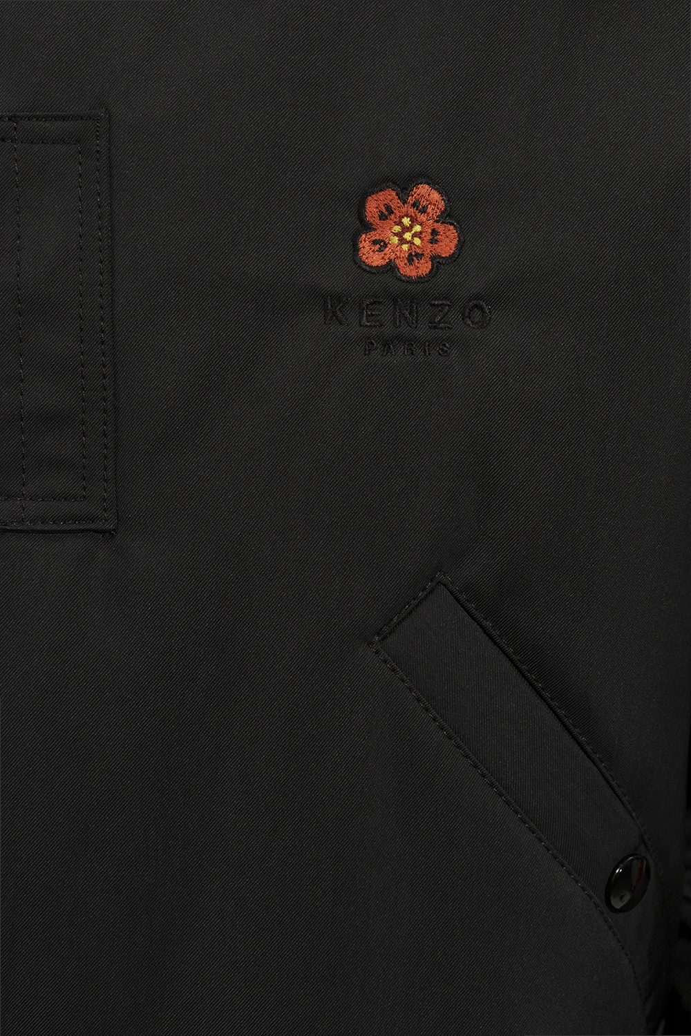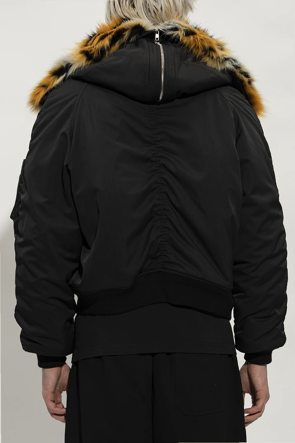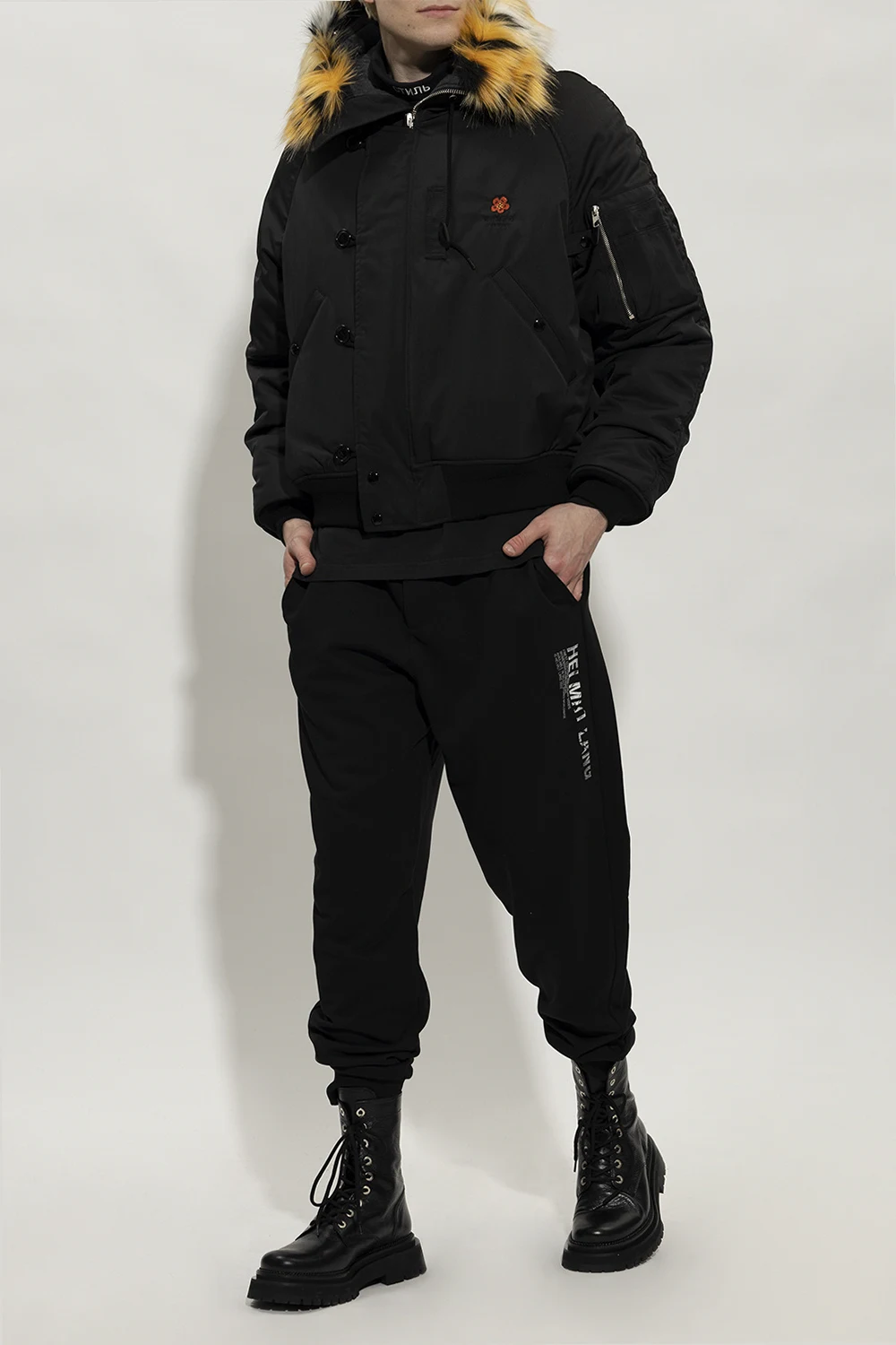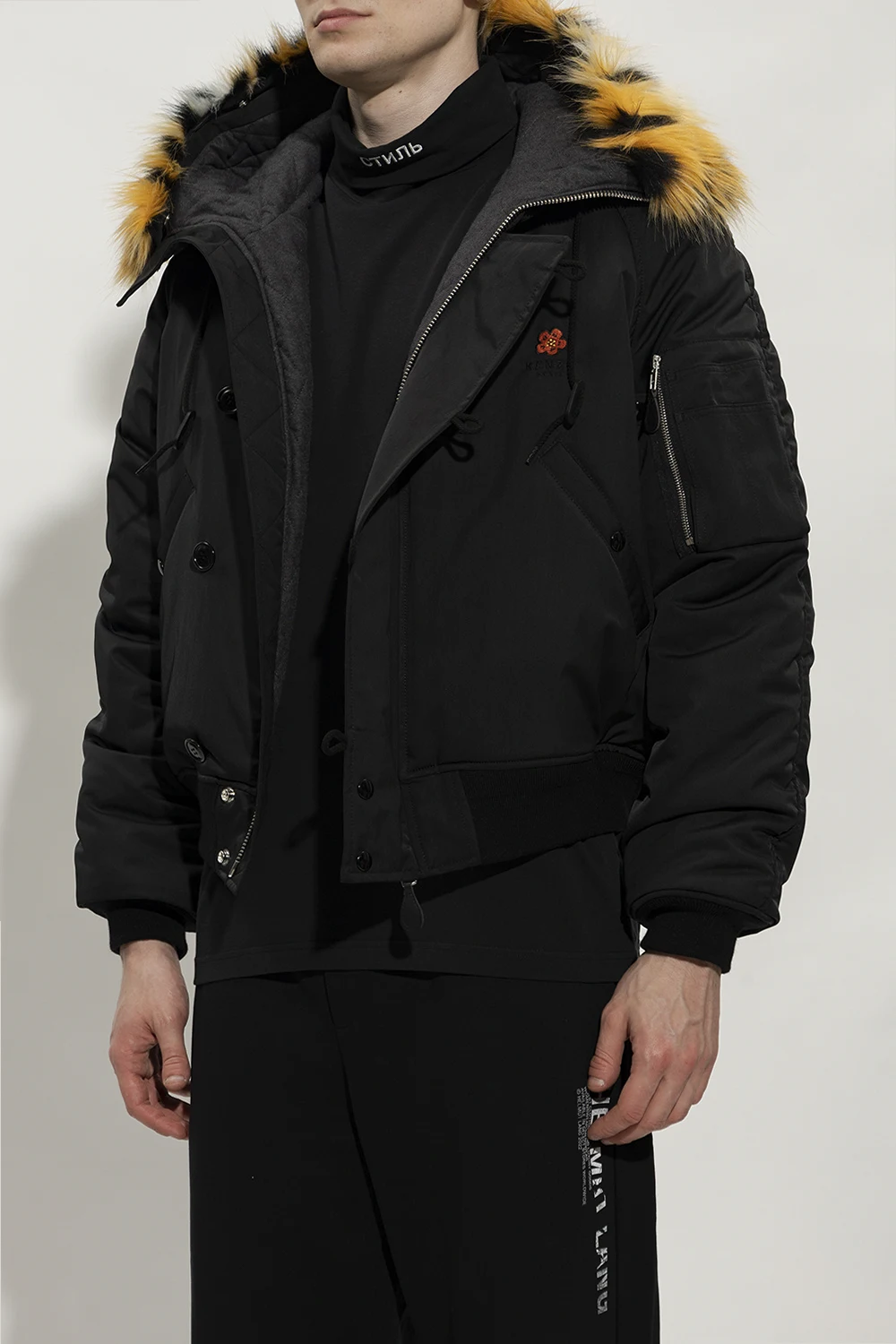 Black jacket from Kenzo. Fastened with a zip and buttons, this garment features a logo embroidery, drawstring hood with zip, detachable faux fur in yellow black and white, two snap-fastened front pockets, four slip pockets and one zip pocket on the sleeve as well as ribbed trims at the hem and cuffs.