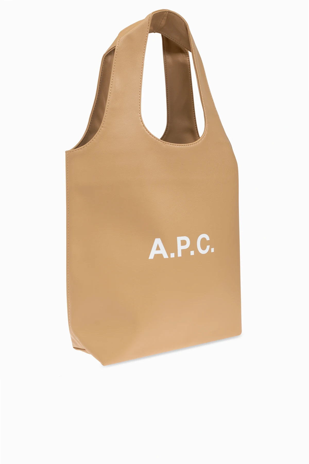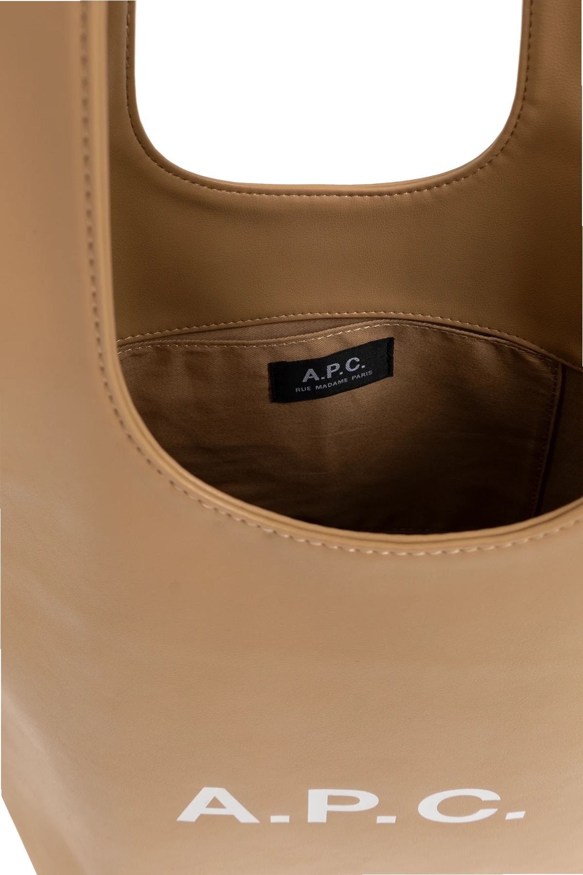 Gefertigt aus hochwertigem lederähnlichem Material, besticht sie durch Einfachheit und subtilen Schick. Auf der Vorderseite der Tasche prangt das weiße „A.P.C.“-Logo, das einen markanten dekorativen Akzent setzt. Das Innere der Tasche ist mit einem dunklen Futter und einem eingenähten Logo-Etikett versehen, was die Liebe zum Detail unterstreicht.