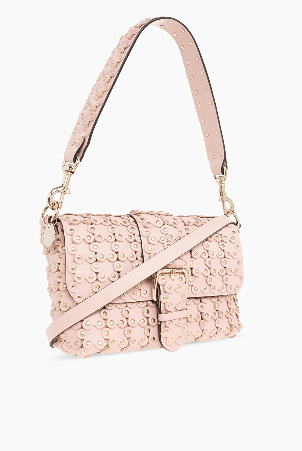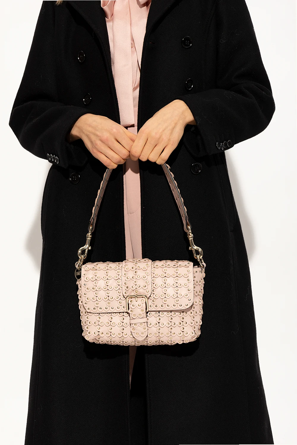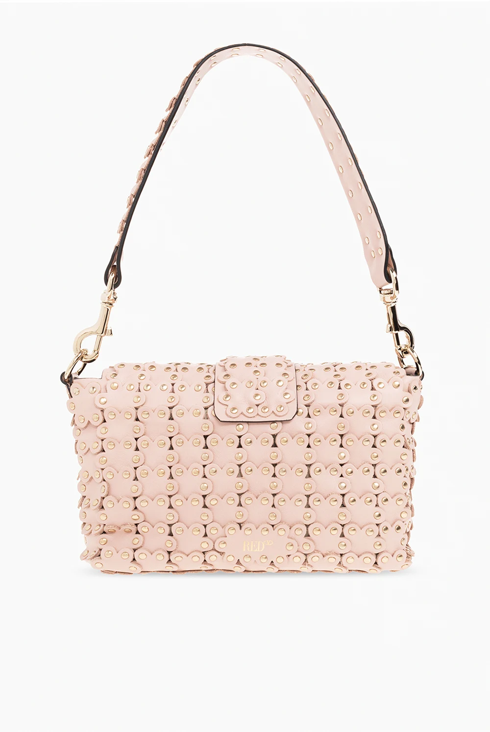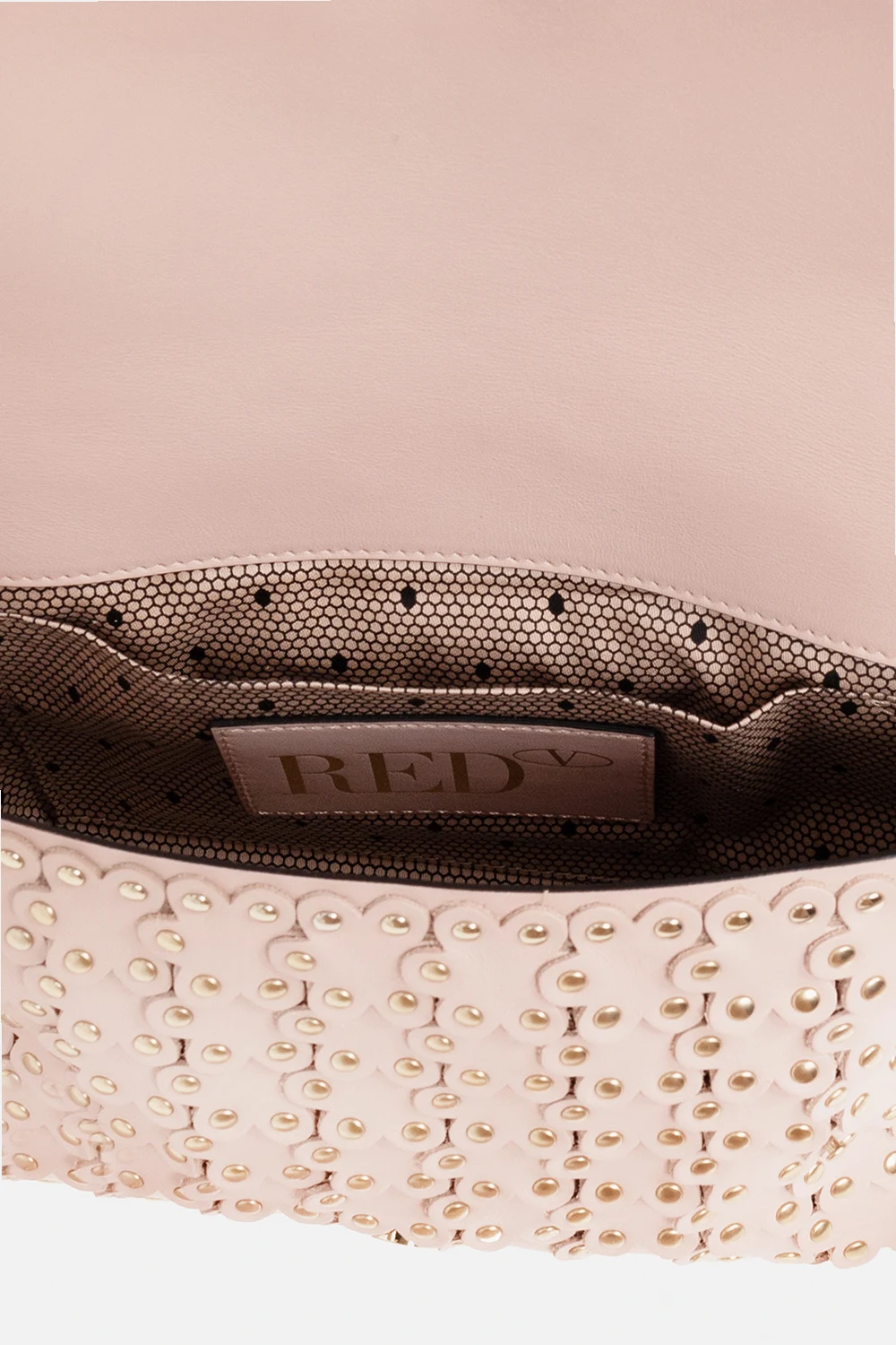 Light pink shoulder bag from Red Valentino. Crafted from leather, this design secures with a magnetic snap and showcases gold-tone applications, a decorative buckle belt on the front, two detachable straps (one is long and adjustable), gold-tone metal hardware and one internal compartment with a slip pocket.