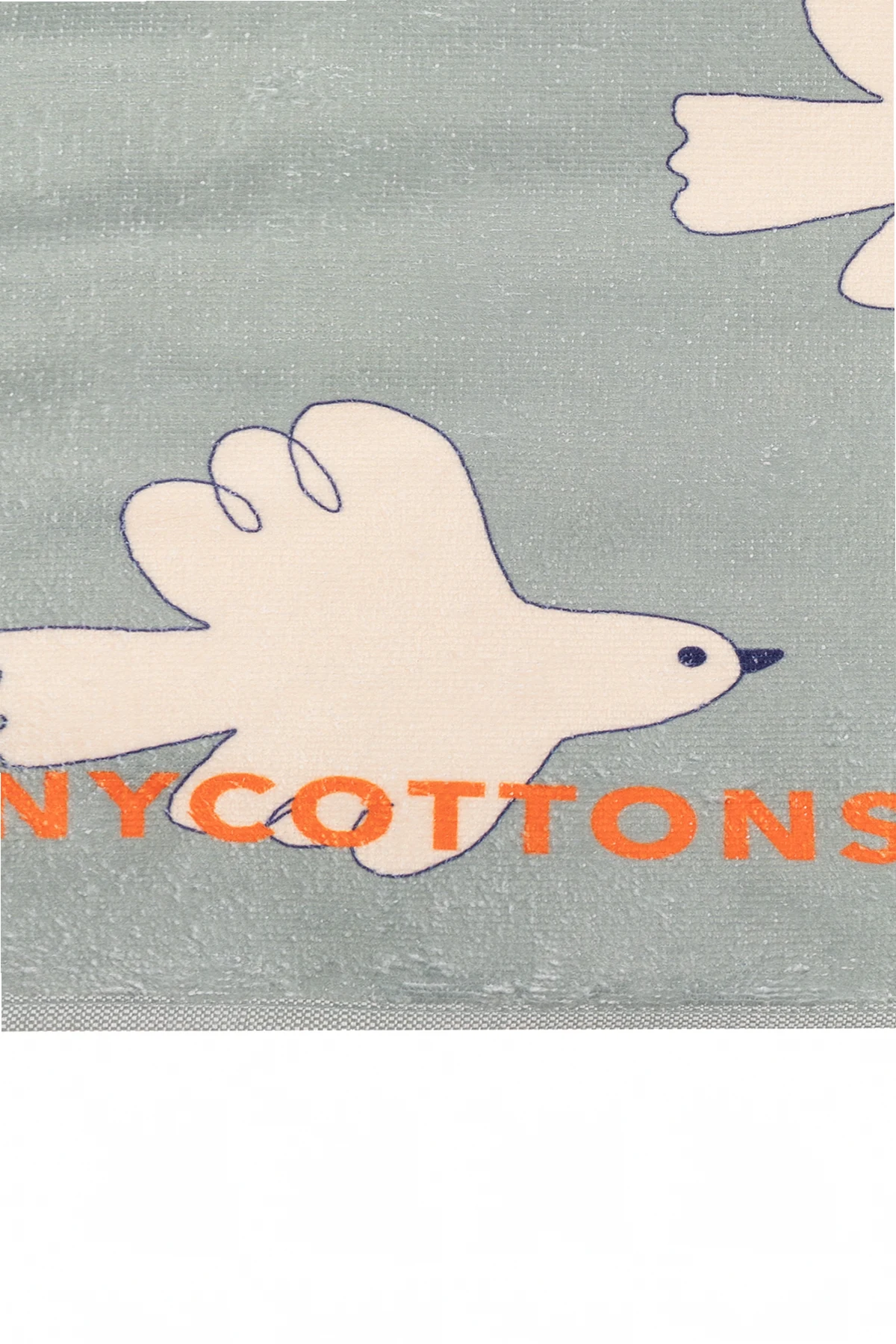 Grey beach towel from Tiny Cottons. Crafted from a cotton blend, this item features a cream and navy pigeon motif and a logo. The reverse side is white.
