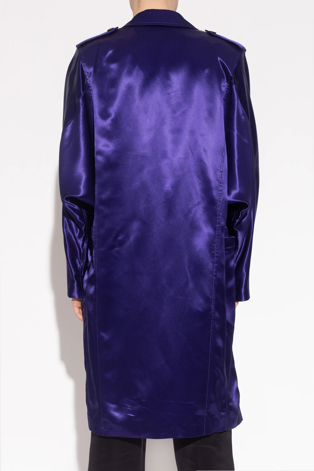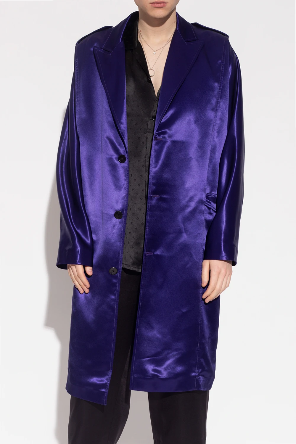 Purple coat from Saint Laurent. Crafted from satin with a single-breasted silhouette, this style features button fastenings, peak lapels, two slip pockets, a single back vent and long sleeves with buckle straps.