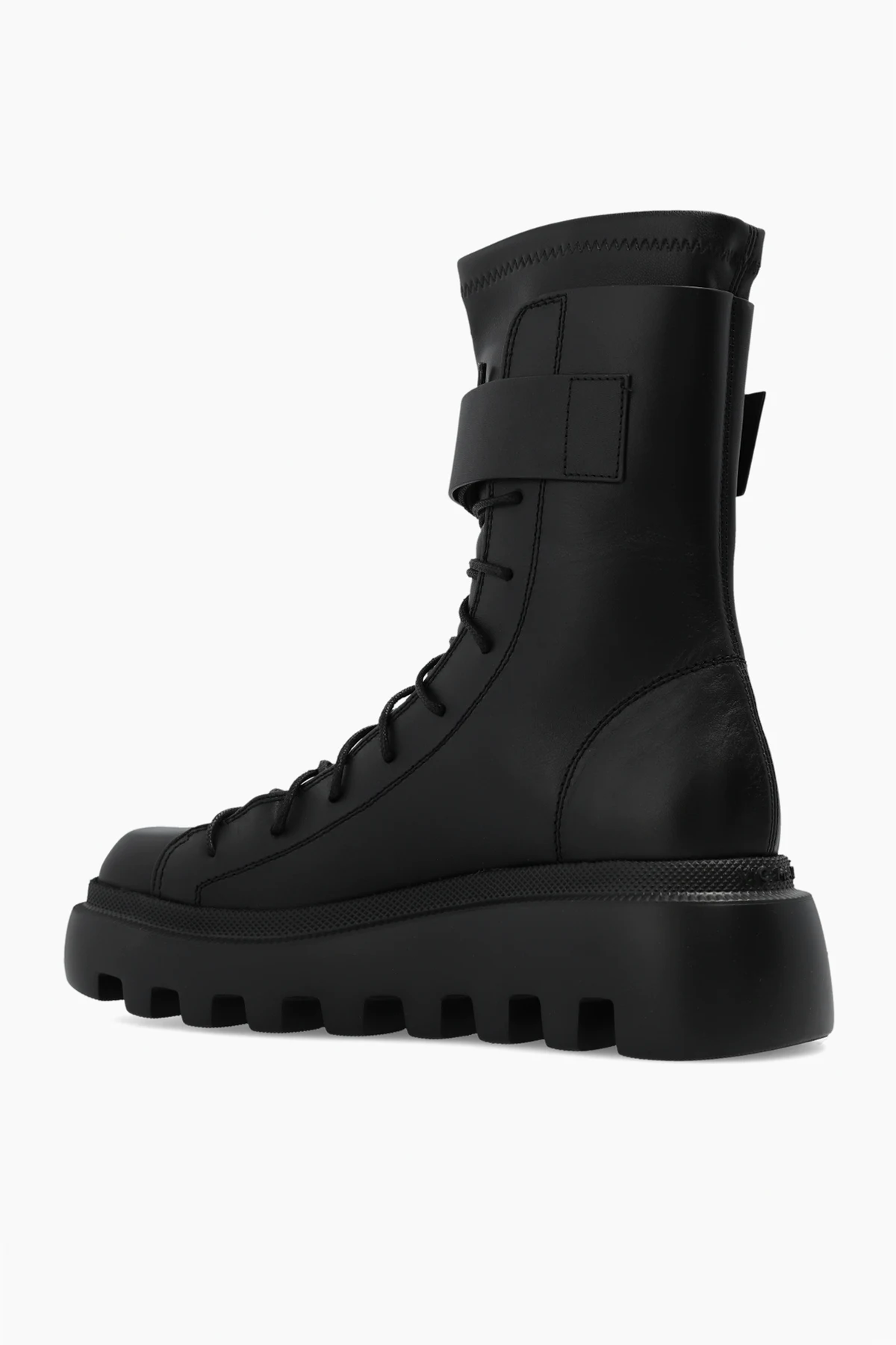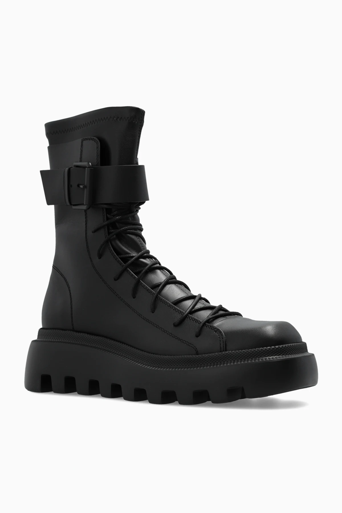 Black ankle boots from Vic Matie. Made of leather, this lace-up pair sits on a black rubber sole and features a decorative buckle strap, square toe and tactile logo detail at the back.