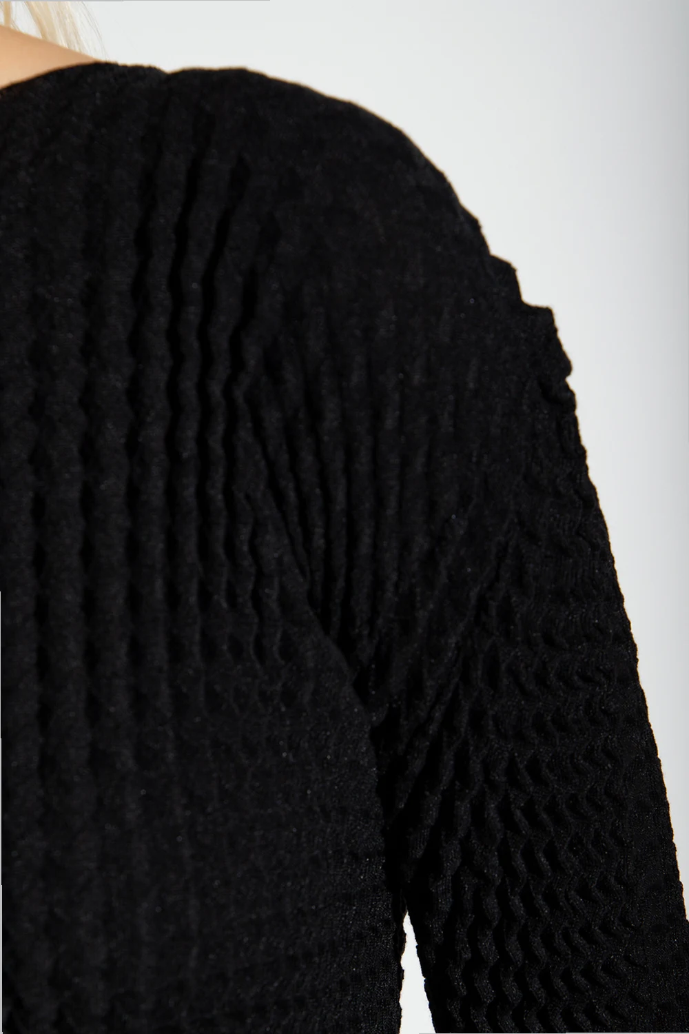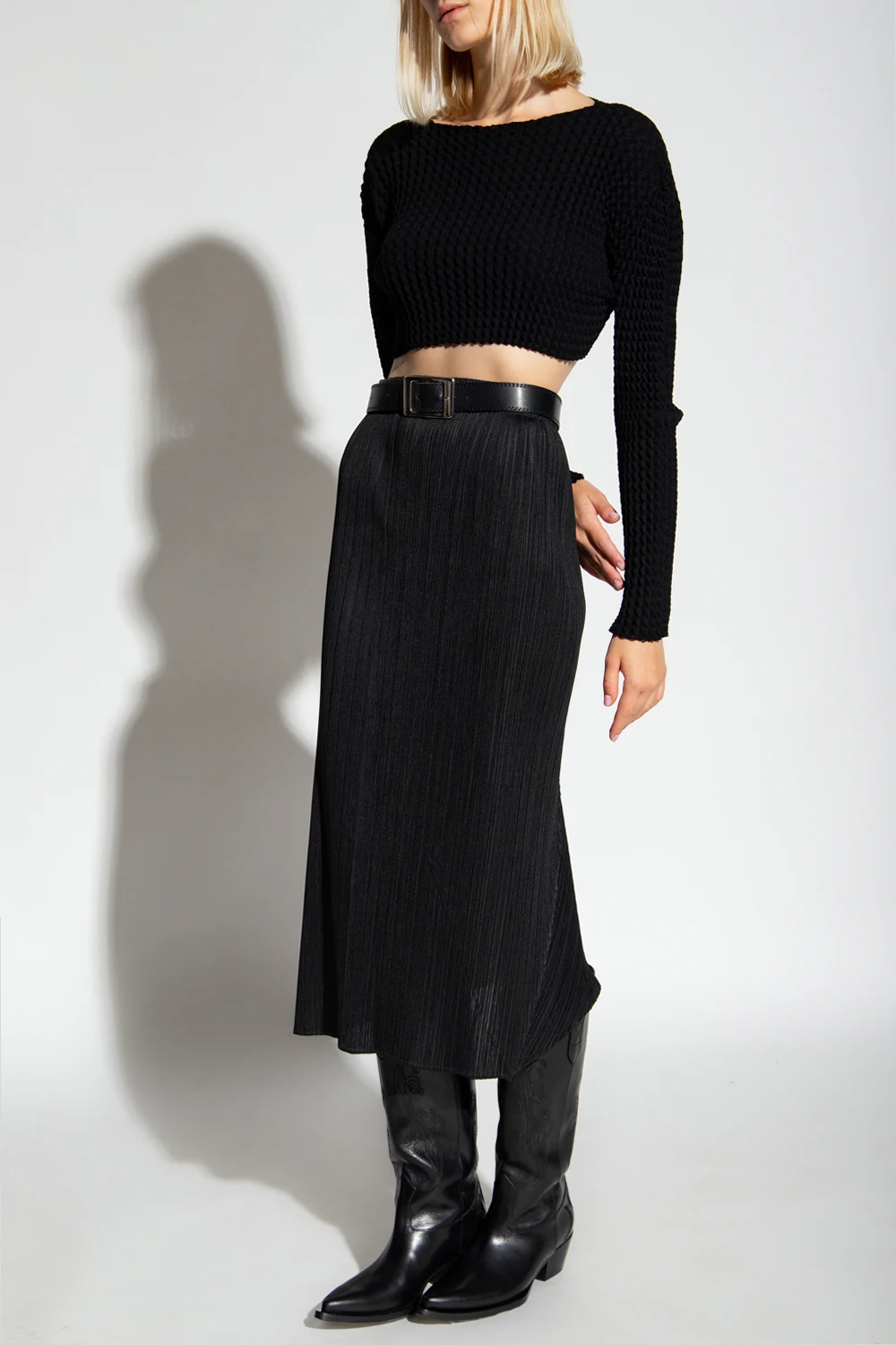 Black crop top with a round neck and long sleeves from Issey Miyake Pleats Please.