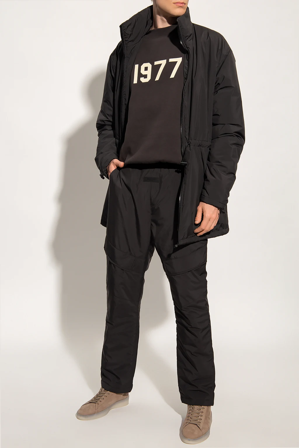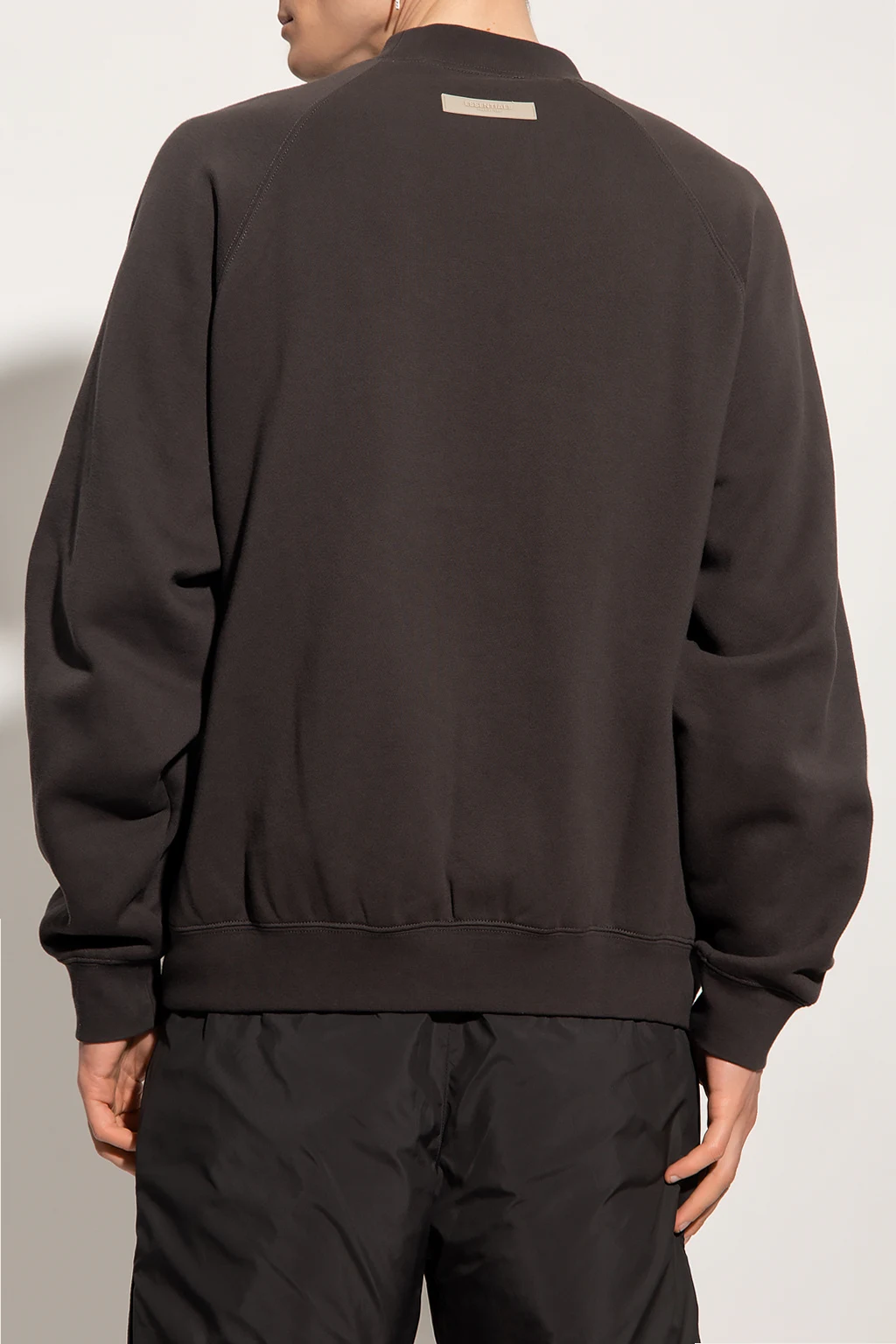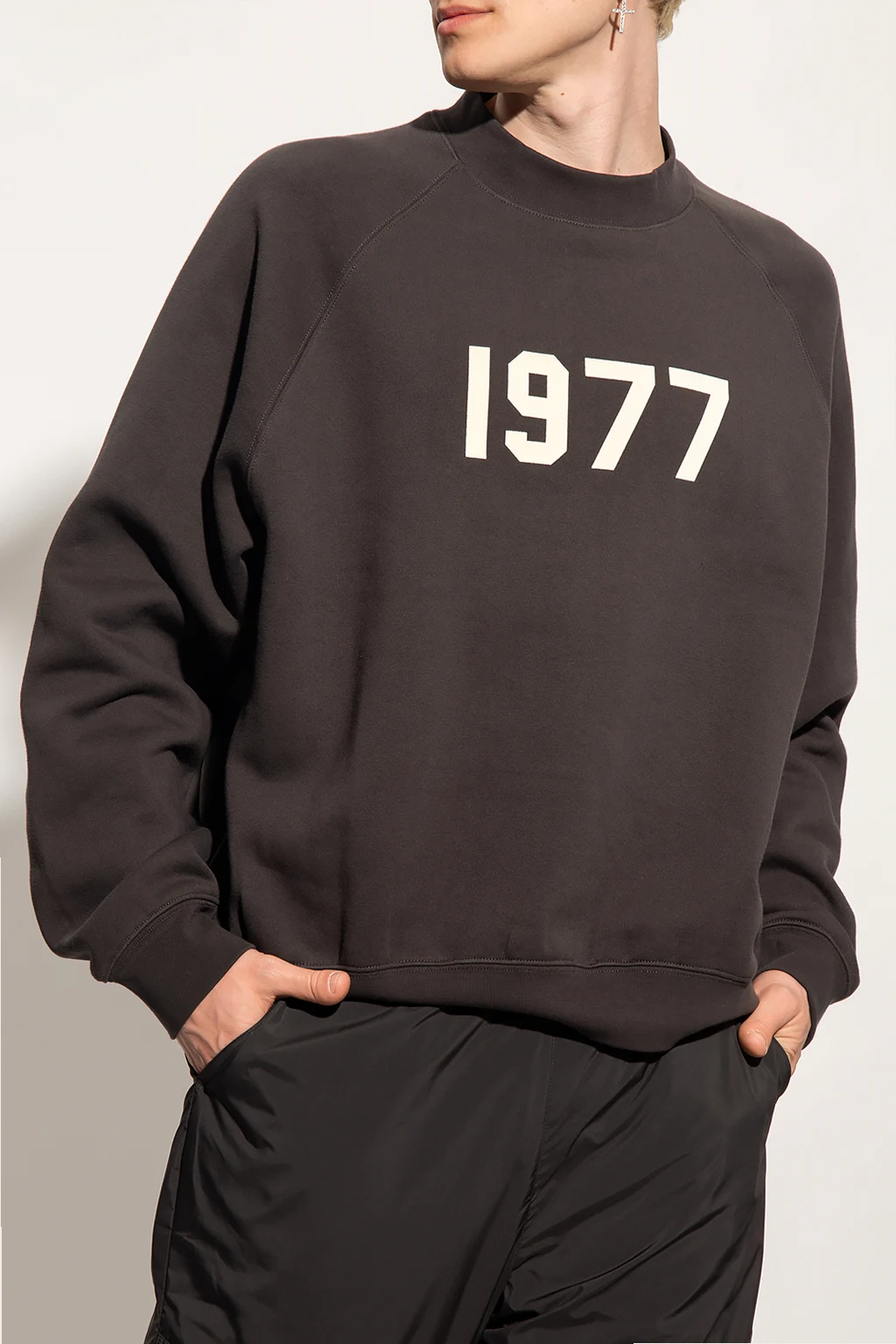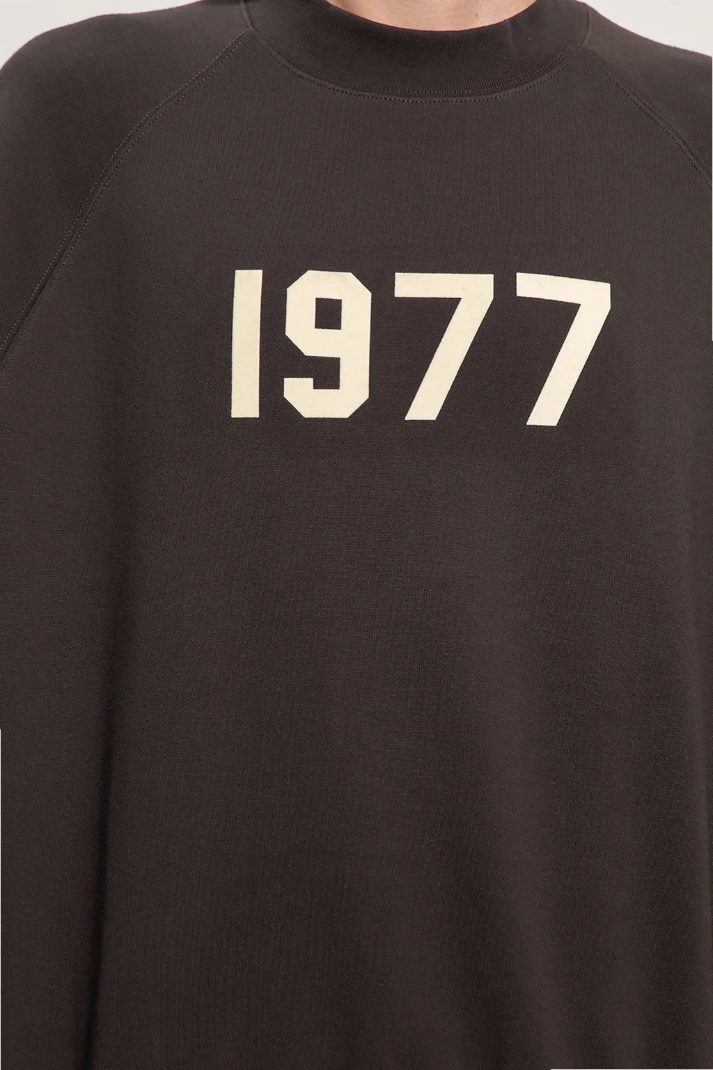 Dark grey crewneck sweatshirt from FEAR OF GOD ESSENTIALS. Made of cotton, this garment features a cream raised 1977 appliqué with a velvet effect, rubber logo patch at the back and ribbed trims at the hem and cuffs.